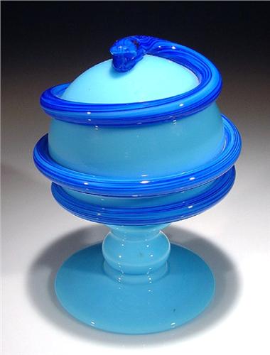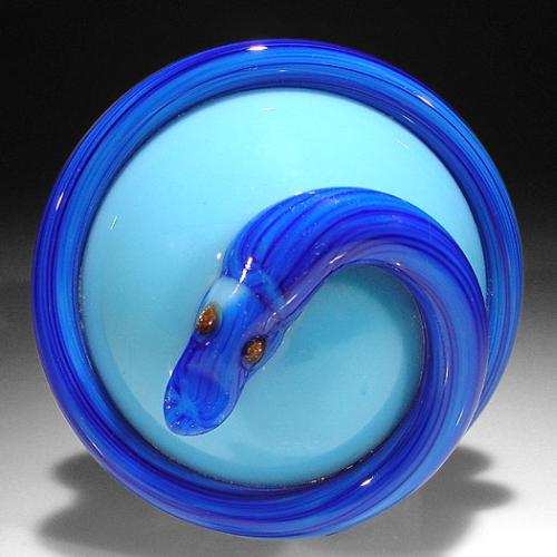 Pairpoint Glass 1975 coiled snake pedestal paperweight, composed of a three-dimensional, long, dark blue snake, coiled around a light blue orb, which rests on a light blue footed pedestal base. Height 5". NO RESERVE