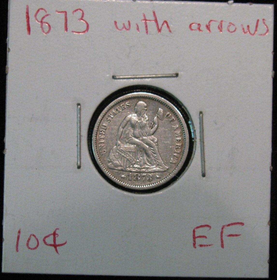 1331. 1873 With Arrows Seated Liberty Dime. EF 40.