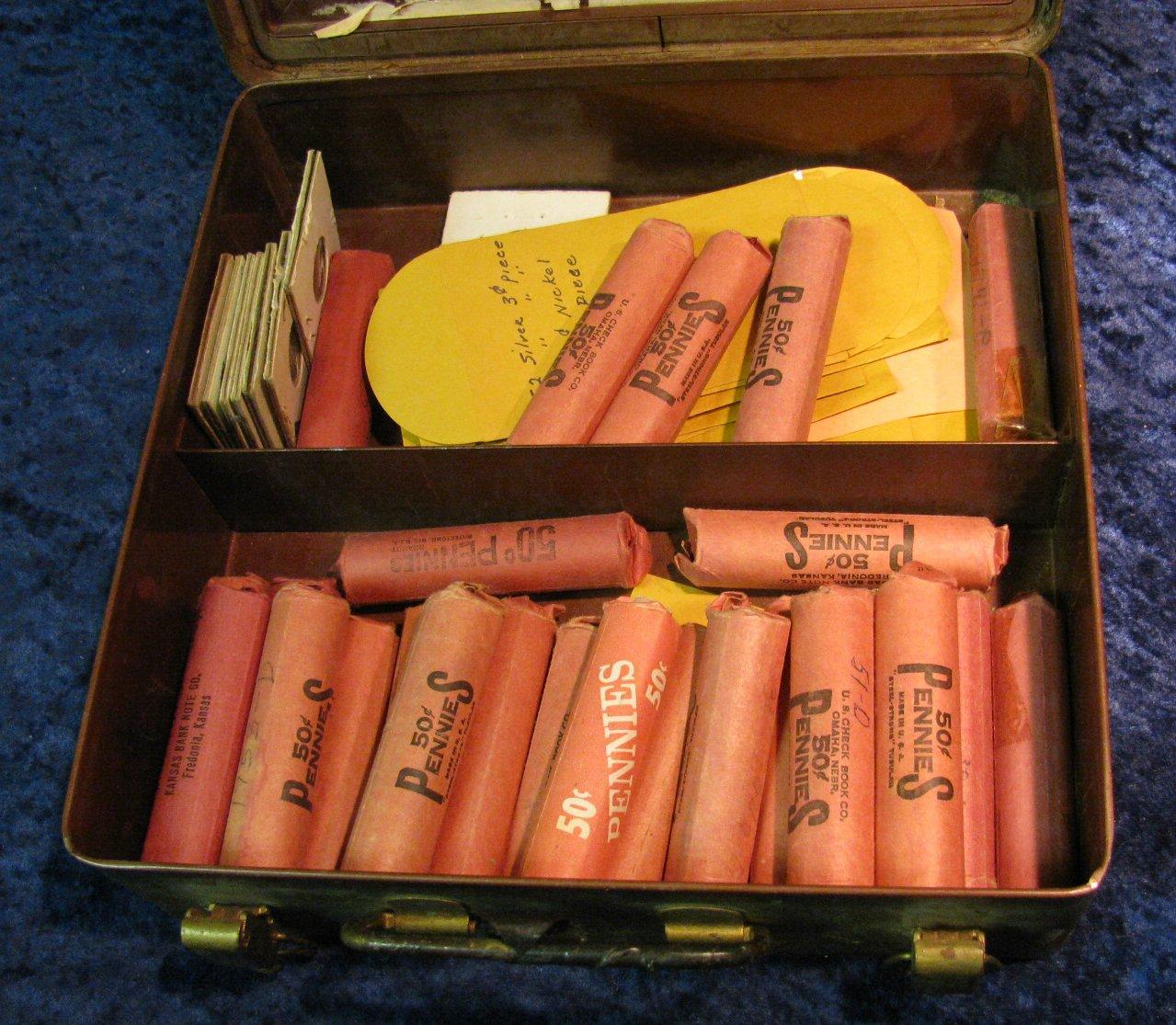 1331. Metal Lock Box with (25) Rolls of Old Wheat Cents
