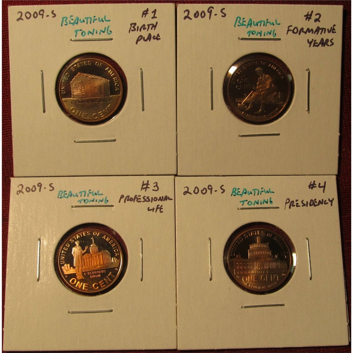 1332. Set of 4 2009-S Proof Lincoln Bicentennial Commemorative Cents, all with BEAUTIFUL toning – SCREAMERS