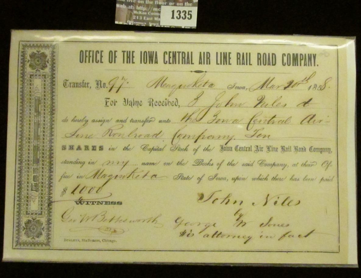 1335 _ March 20, 1858 Ten Shares of Stock in the "Office of the Iowa Central Air Line Rail Road Comp