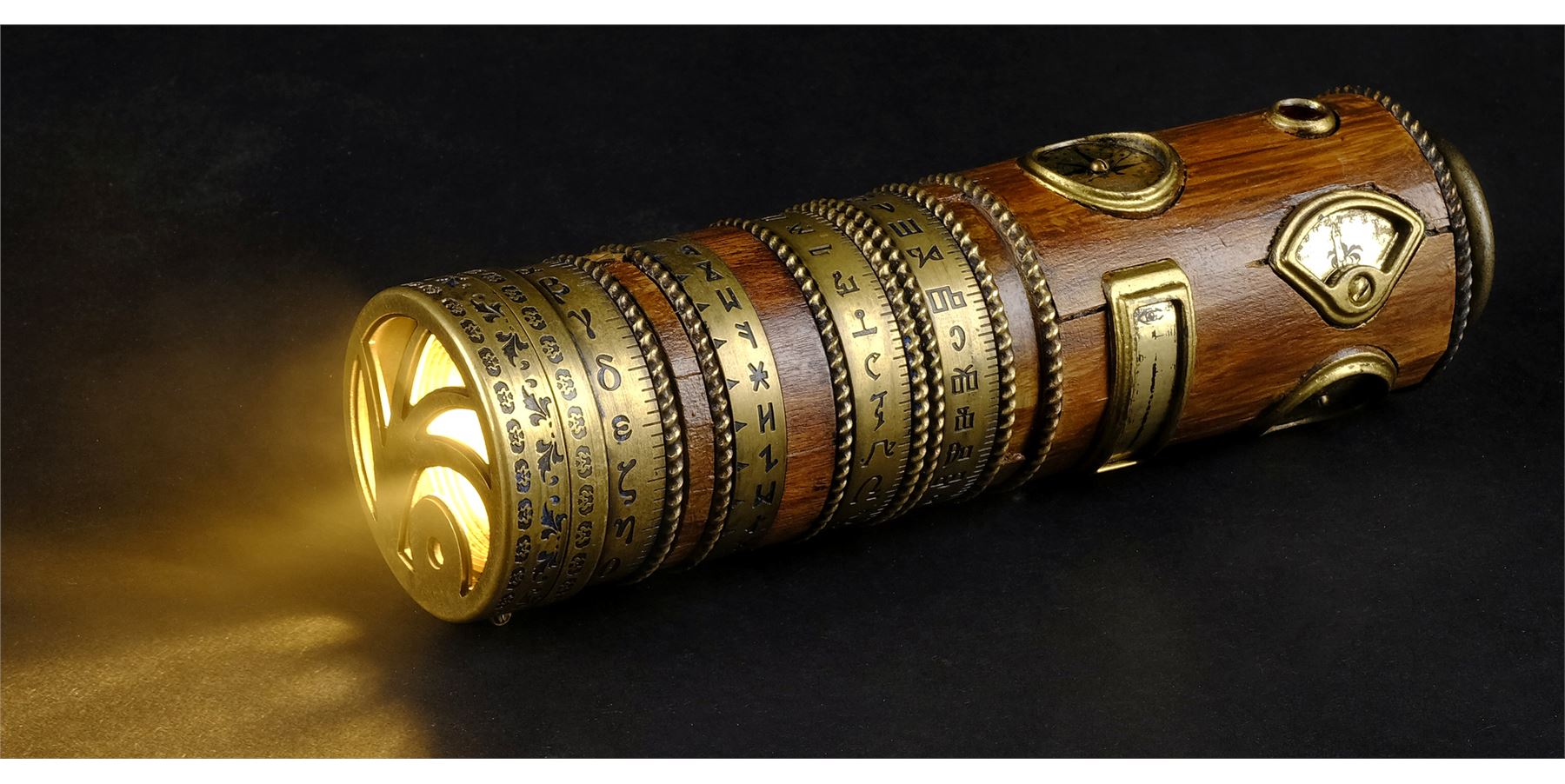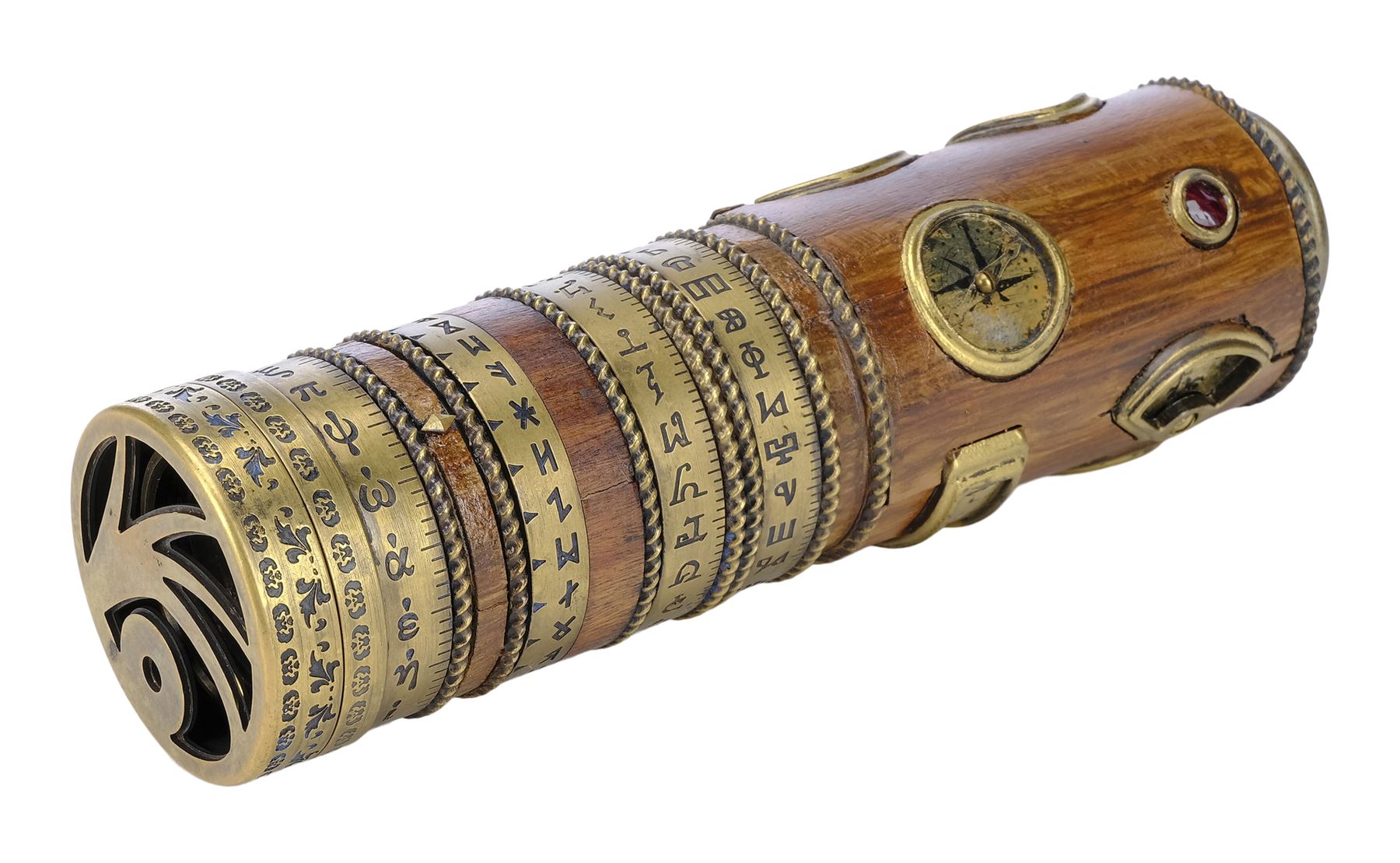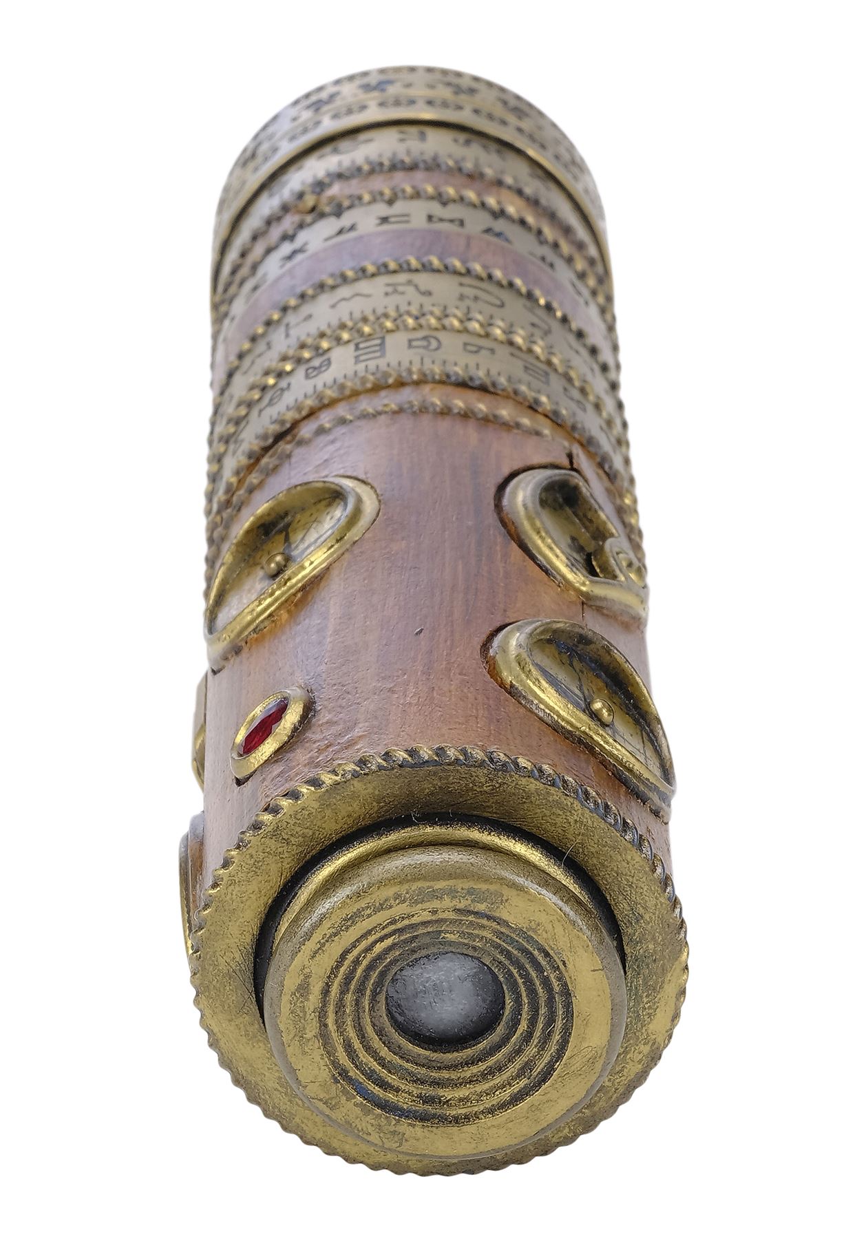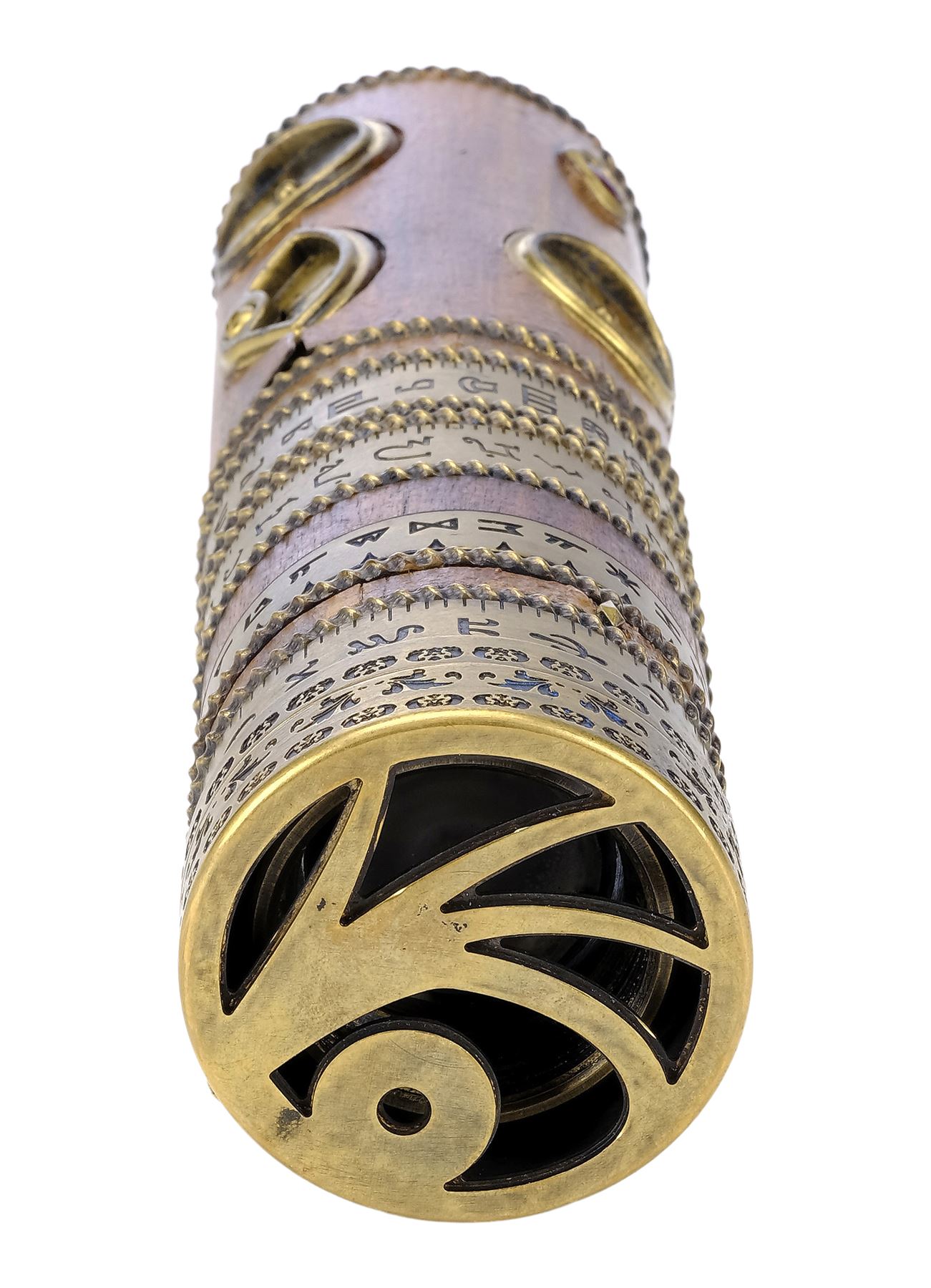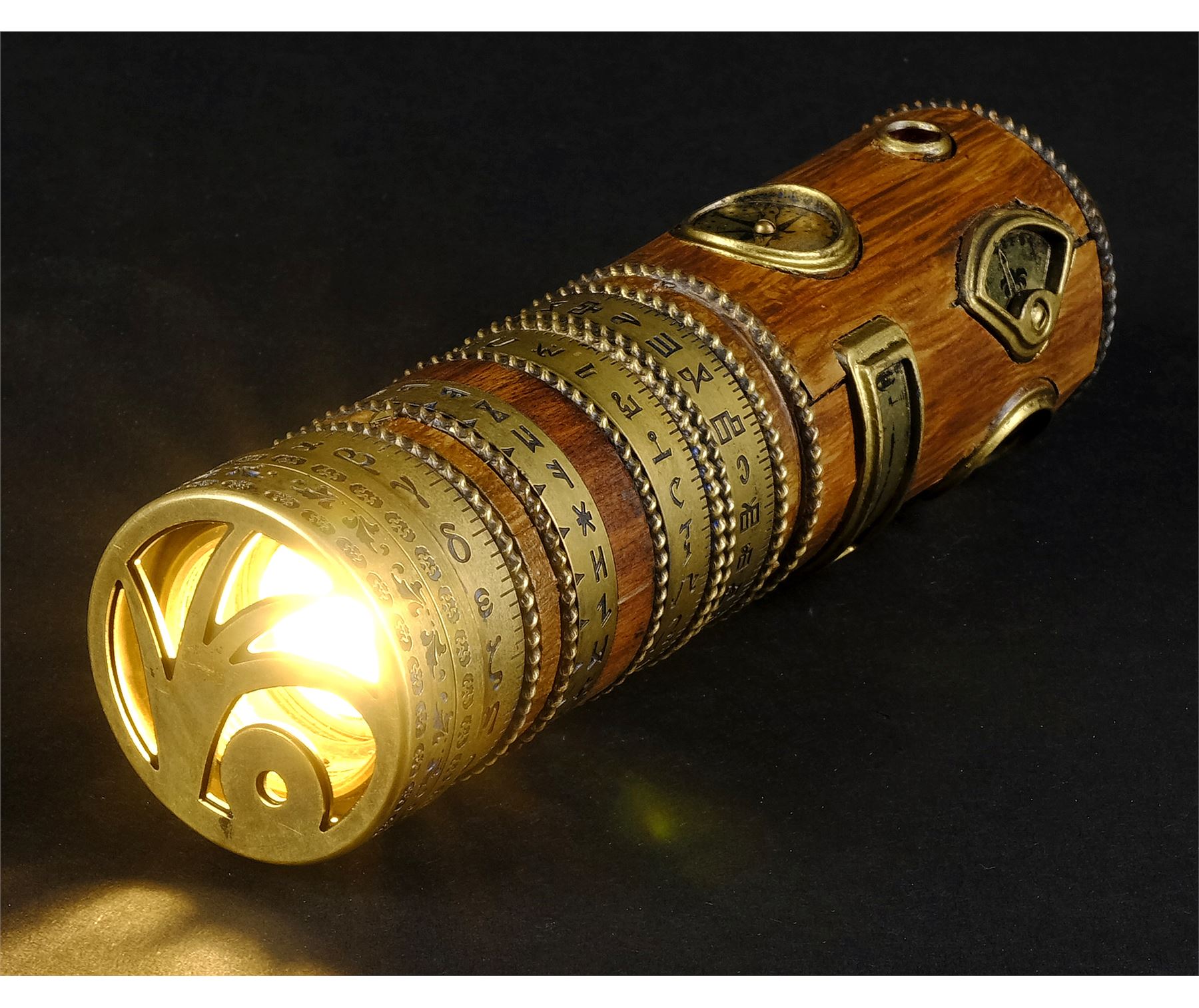 Made of wood and metal with acrylic gem detailing, this spyglass includes a mechanical view opening and code dials that rotate. According to The Incomplete History of Secret Organizations, "There are approximately 2,016,125 combinations, which is why learning proper decoding techniques is important." This spyglass is powered by a button accessible by twisting off the eye view portion of the spyglass.