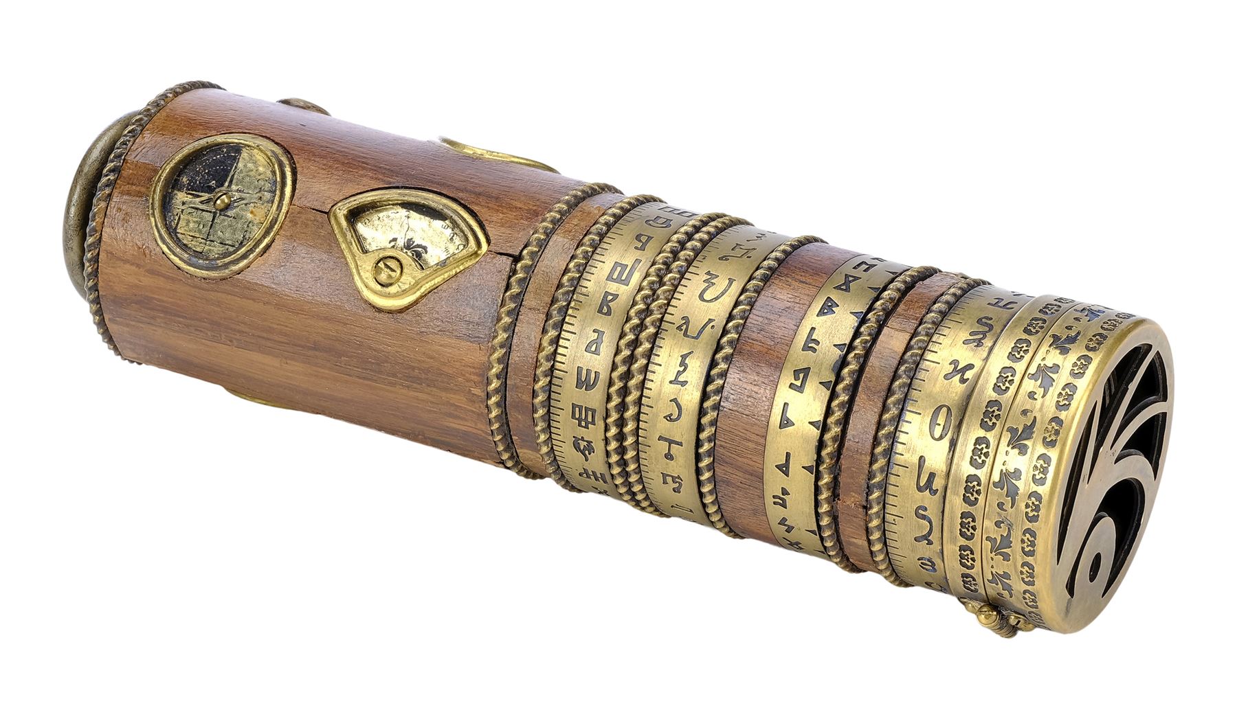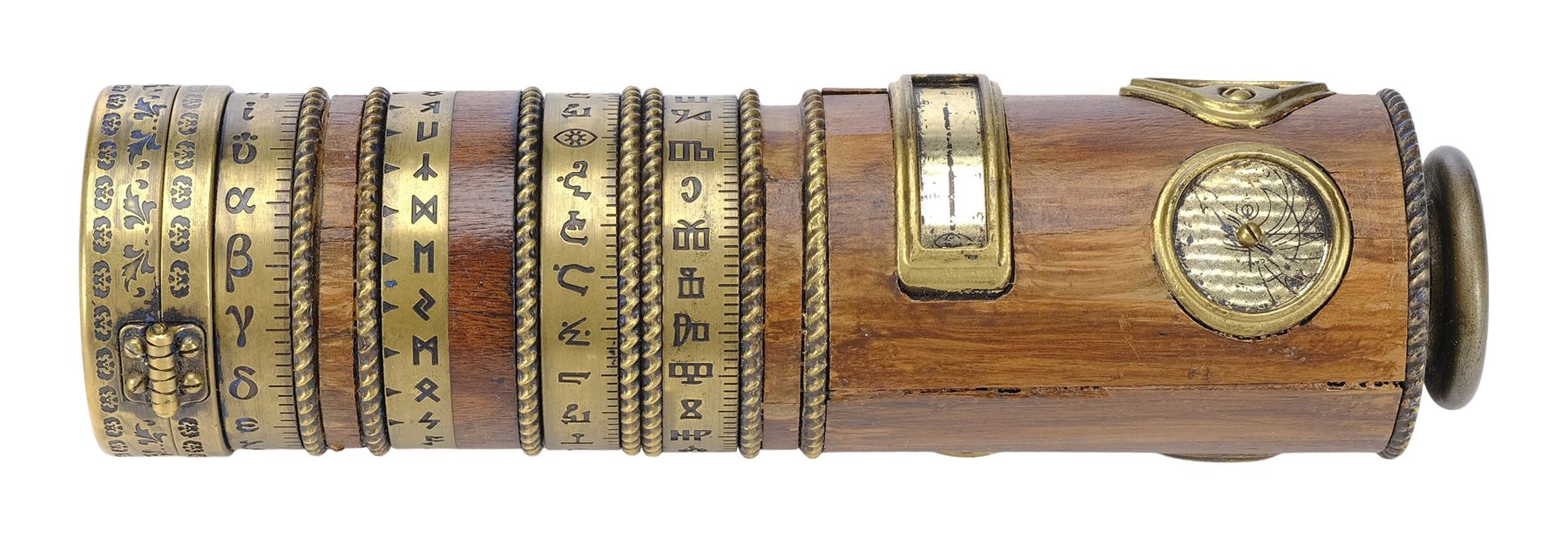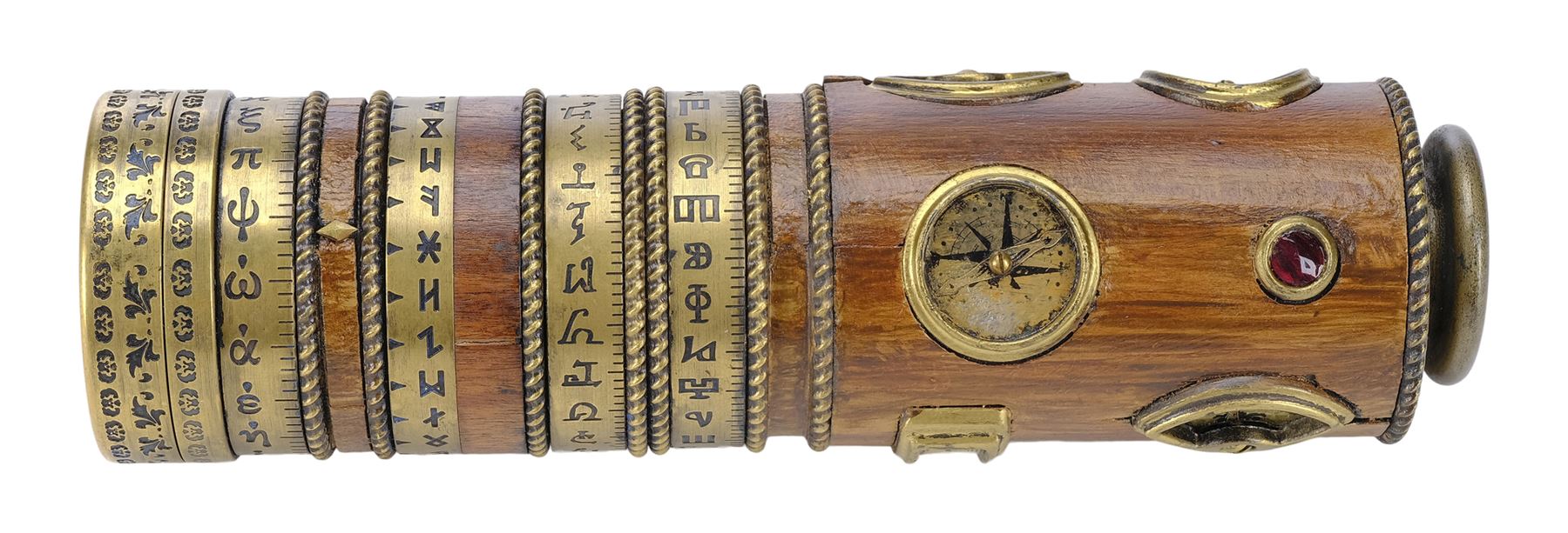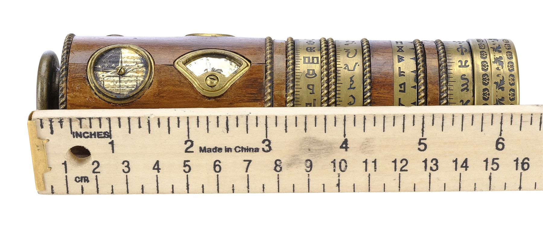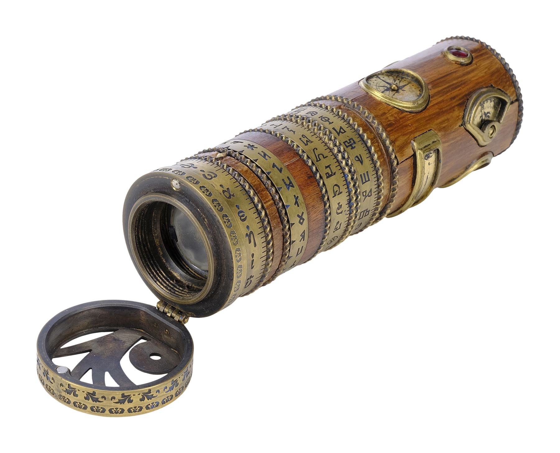Made of wood and metal with acrylic gem detailing, this spyglass includes a mechanical view opening and code dials that rotate. According to The Incomplete History of Secret Organizations, "There are approximately 2,016,125 combinations, which is why learning proper decoding techniques is important." This spyglass is powered by a button accessible by twisting off the eye view portion of the spyglass.
