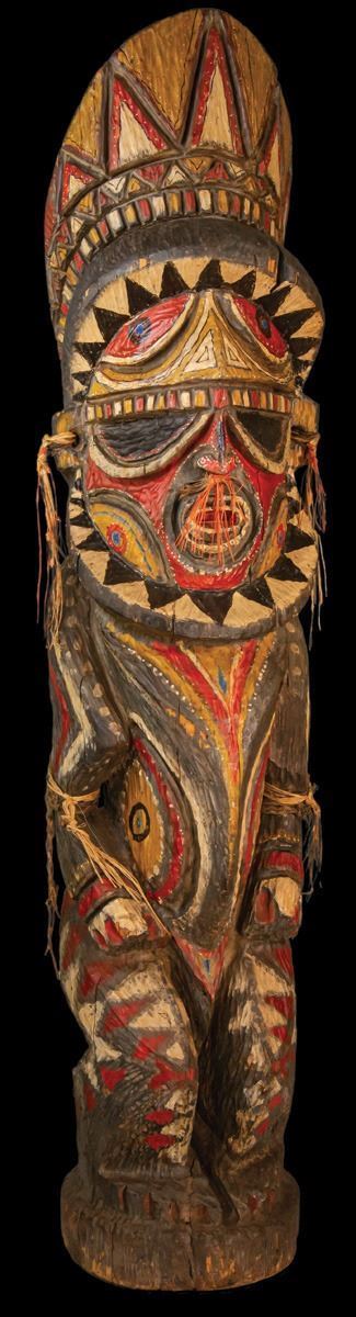 (1960s) A substantial carving by the master, LeRoy Schmaltz. Aged polychrome color treatment with raffia tassels.72"x15"x14.5"VG+ with typical wear