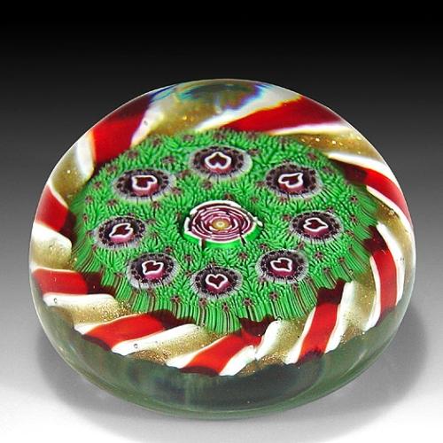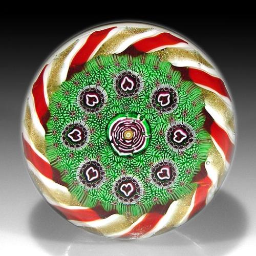 Parabelle Glass 1996 Artist Proof paperweight, with a central pink and green rose, encircled by a spaced ring of red heart canes, on a pansy/moss ground, surrounded by a red, white, and gold aventurine torsade. Signed/dated. One of one. Diameter 2 5/8". NO RESERVE