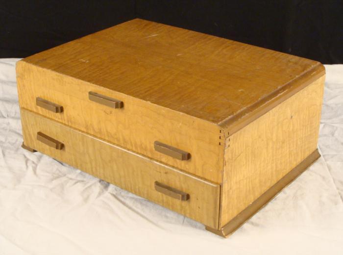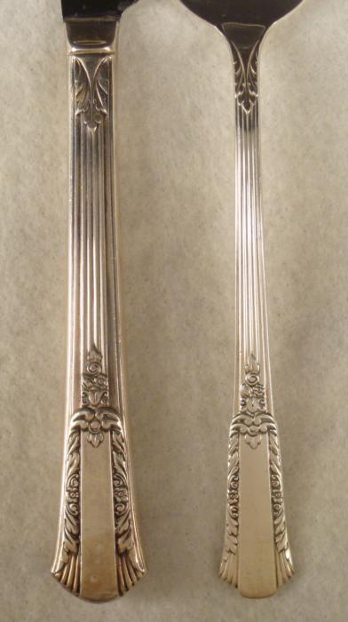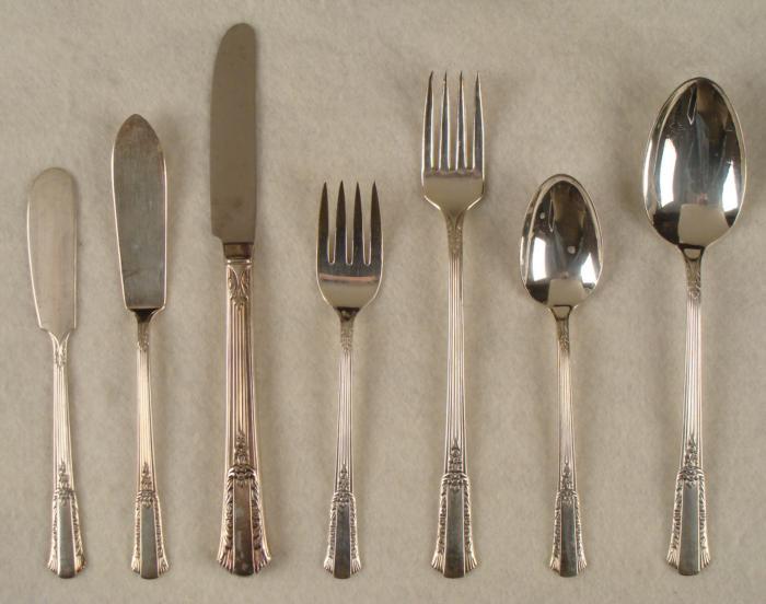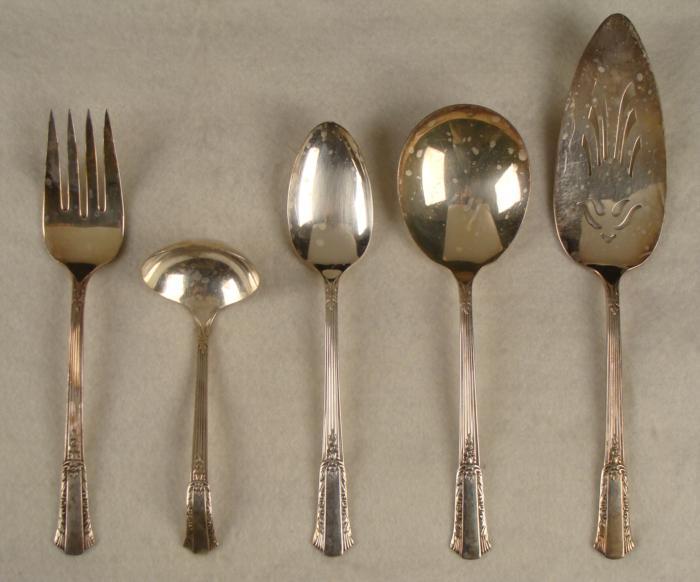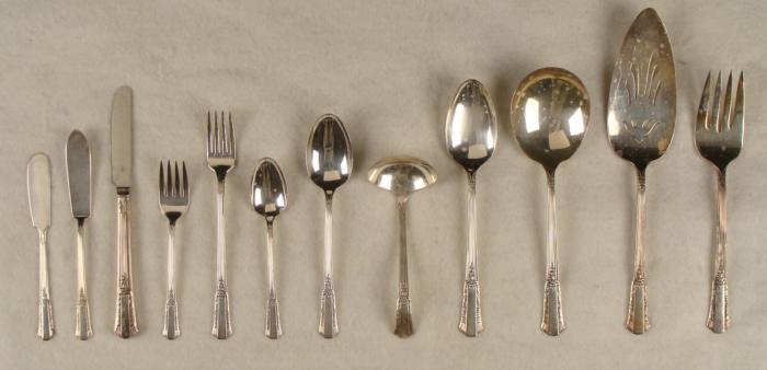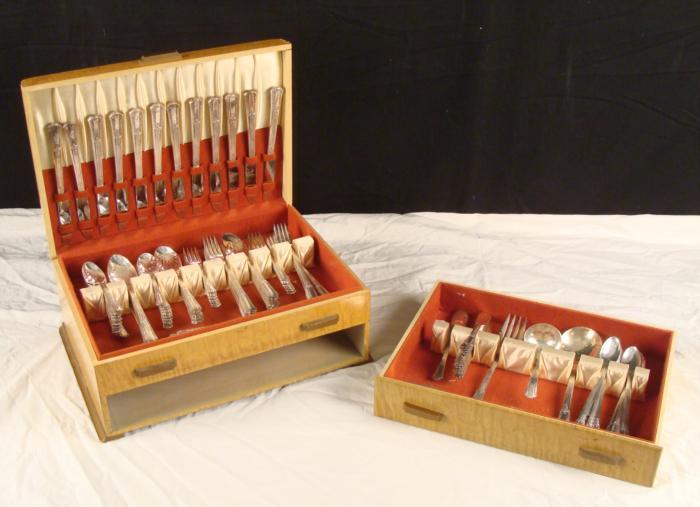 8 3/8" knives 6 1/8" butter knives6 7/8" spreading knives (x2)7 1/2' forks 6" forks6" spoons (x32)7 3/8" spoons7 5/8" teaspoons (x14)8 3/8" serving spoon (x1)8 3/4" serving spoon (x2)8 1/2" serving fork (x1)6" ladle (x1)10 1/2" pie server (x1) These come in wooden chest, in good condition with some wear, a crack, and loose handle.