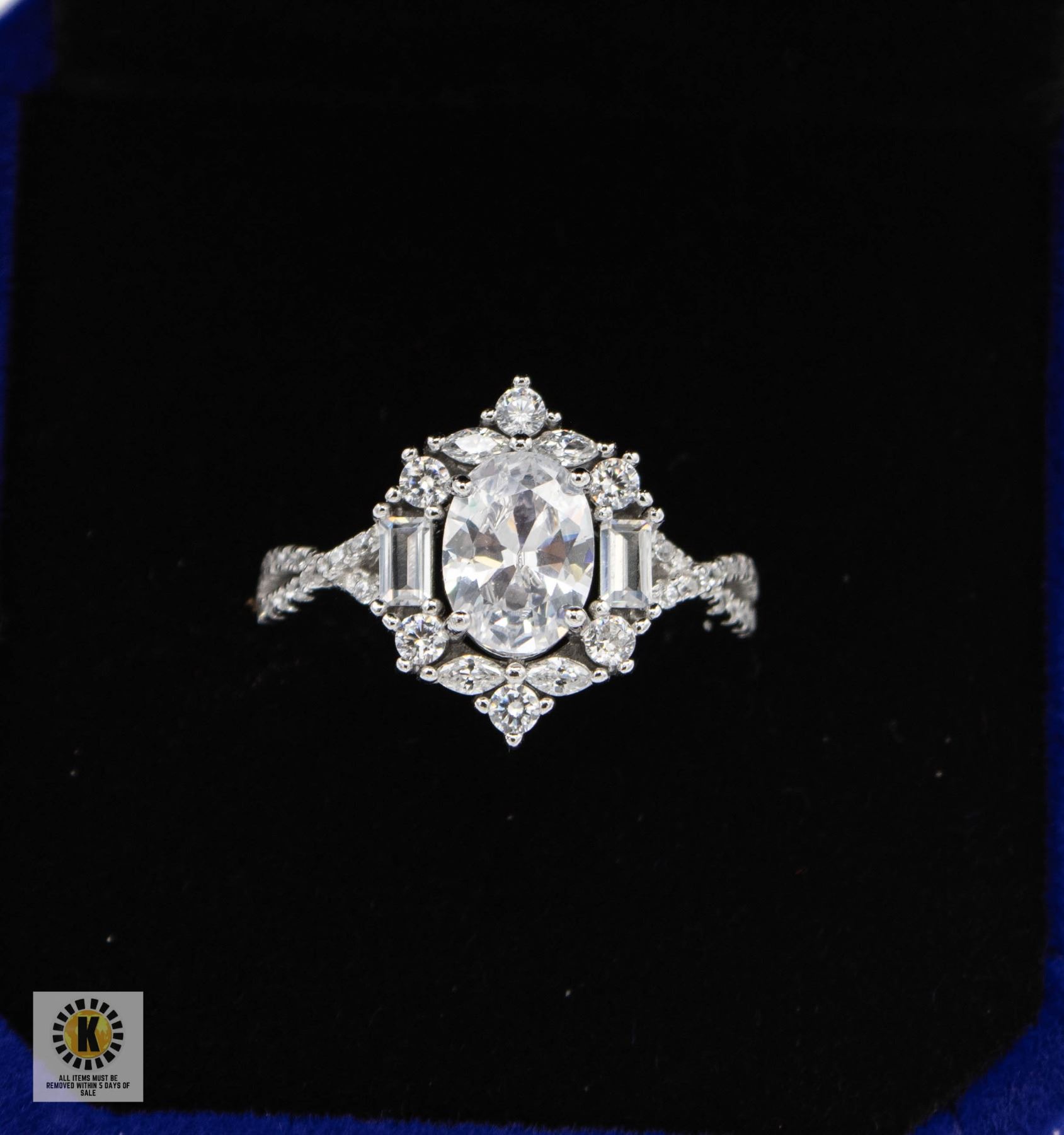 BAGUETTE STONES ON EITHER SIDE WITH 6 ROUND BRILLIANT CUT AND 4 MARQUISE SHAPED STONES ALL IN A HALO AROUND THE CENTER WITH 36 ROUND BRILLIANT CUT STONES SET ON BOTH SHANKS SET IN SILVERY RING SIZE 7