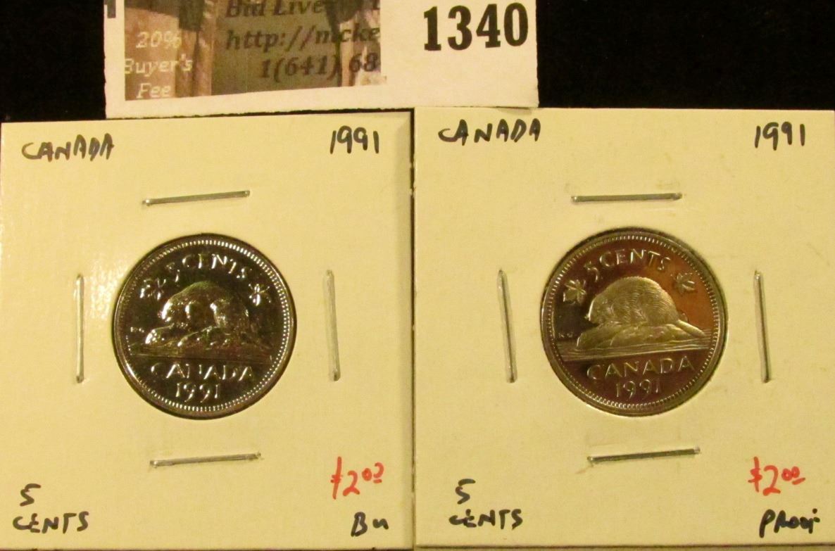 1340 . Pair of 1991 Canada Five Cents, BU & Proof, value for pair $