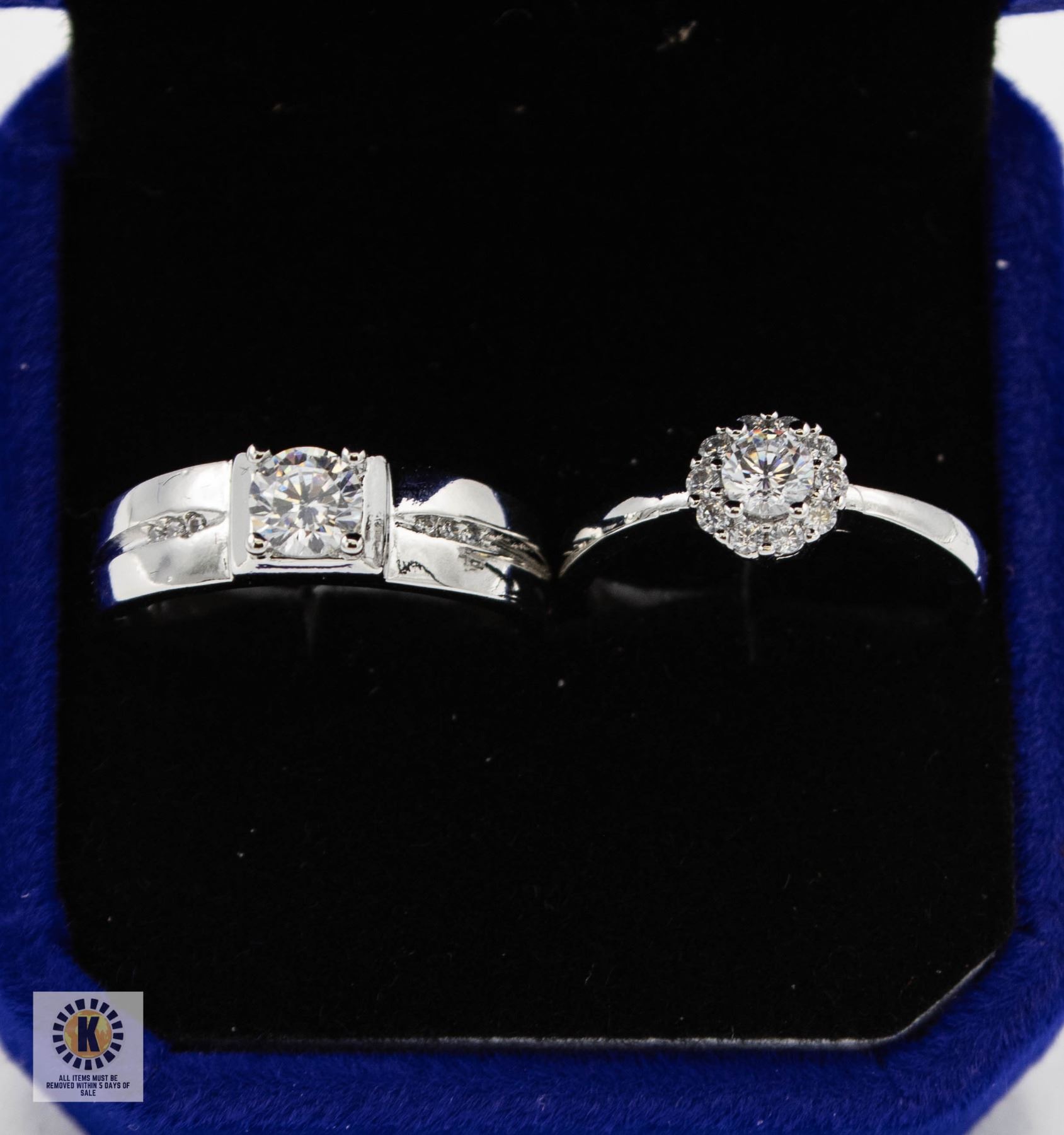 ROUND BRILLIANT CUT CUBIC ZIRCONIA WITH 10 IN ROUND HALO ON LADIES RING AND 6 SET IN SHANK OF GENTS RING RINGS SIZES ARE ADJUSTABLE IN SILVER TONE RINGS