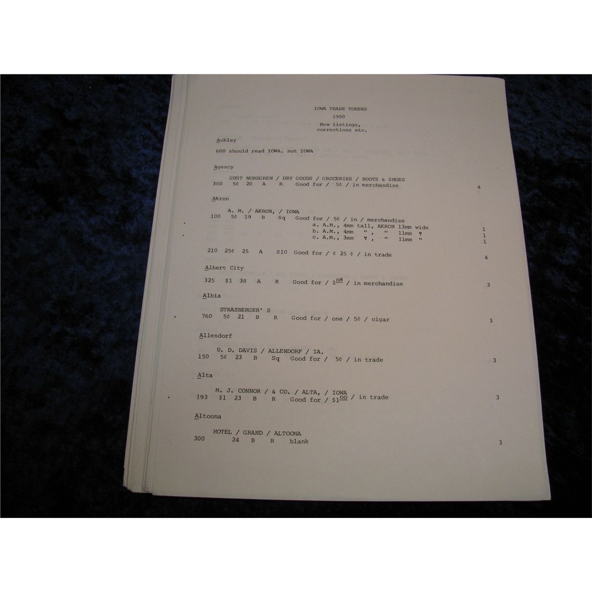 1341. "Iowa Trade Tokens 1990 New Listings corrections etc.". Loose leaf.