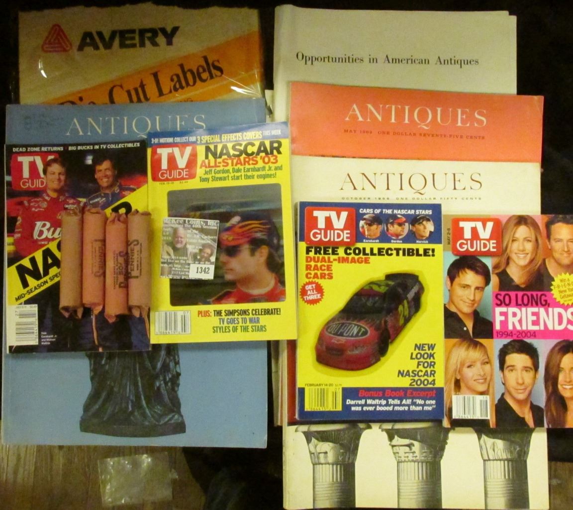 Partial Box of "Syntex…Palo Alto, Ca." labels; several old Antique Magazines; May, 2004 TV Guide "So Long, Friends 1994-2004"; 2003 & 2004 TV Guides with Nascar holograms; 2003 Nascar TV Guide; and a couple hundred old Wheat Cents in wrappers.