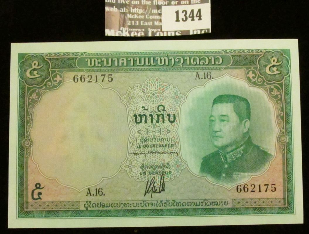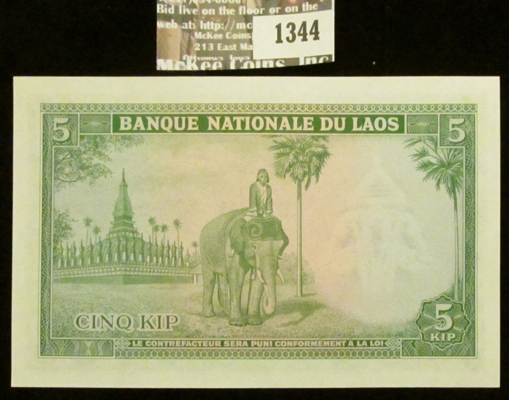 National Bank of Laos Five Kip note depicting an Elephant with rider. Crisp Uncirculated.