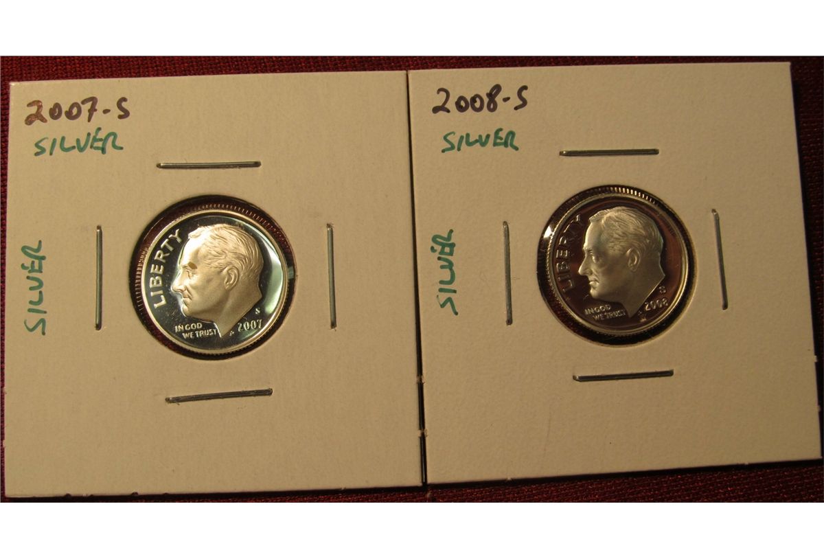 1348. 2 Proof SILVER Roosevelt Dimes – 2007-S & 2008-S