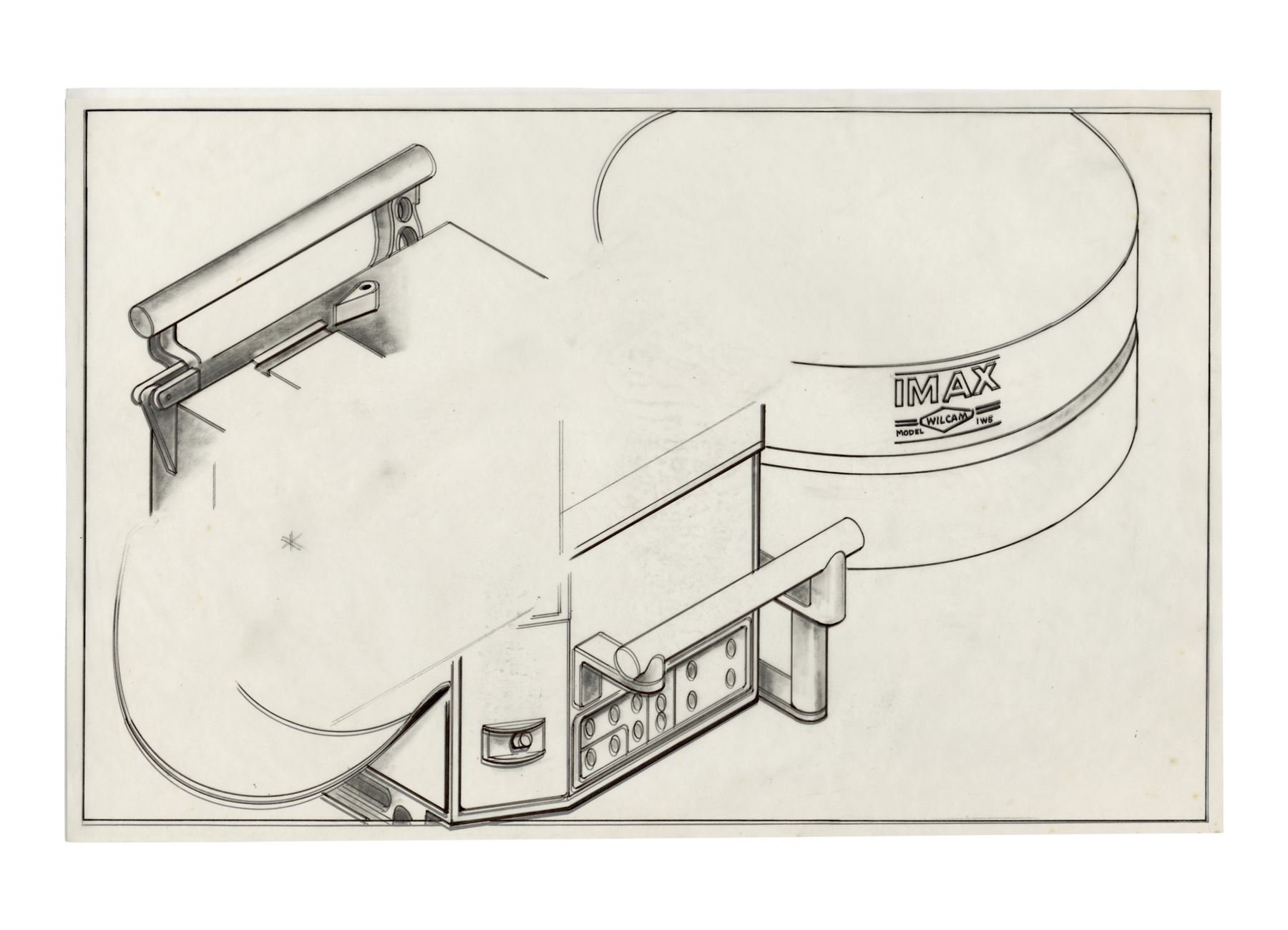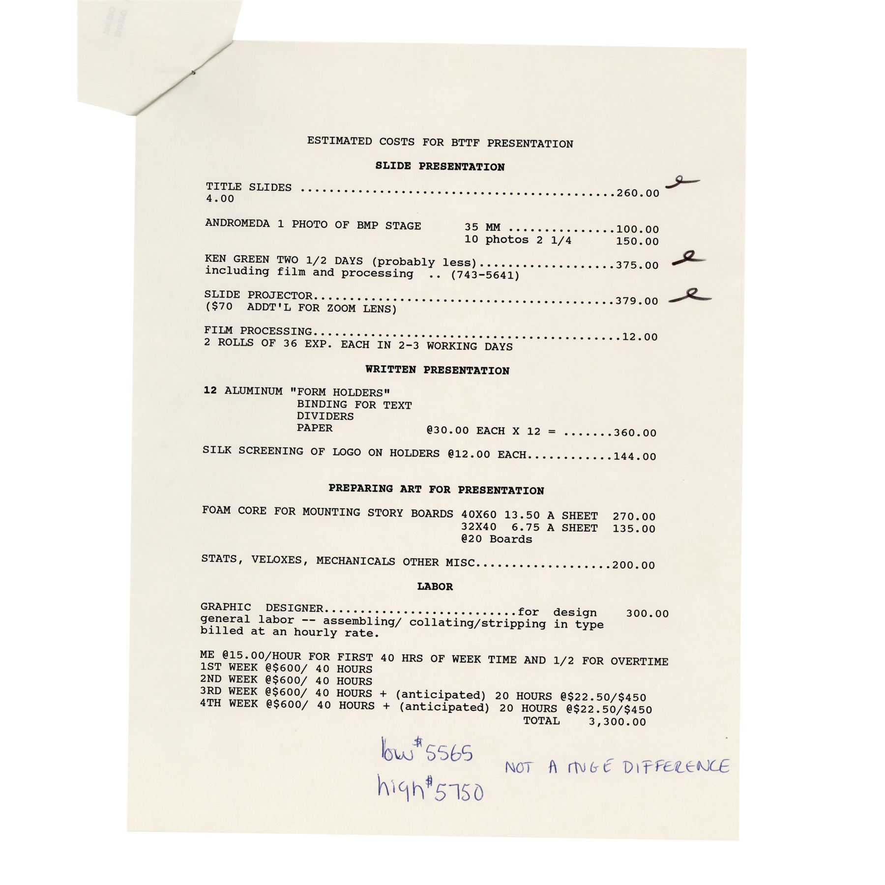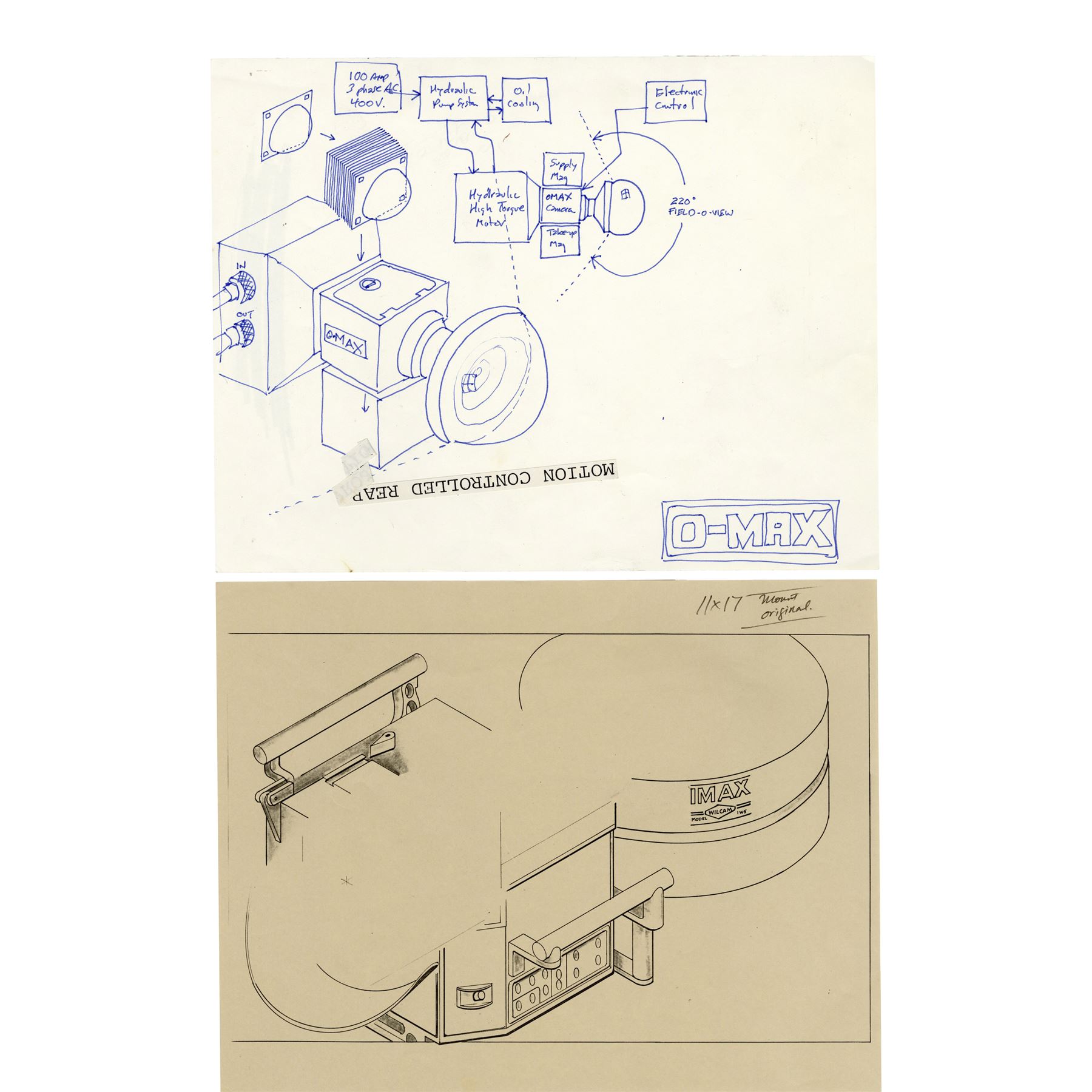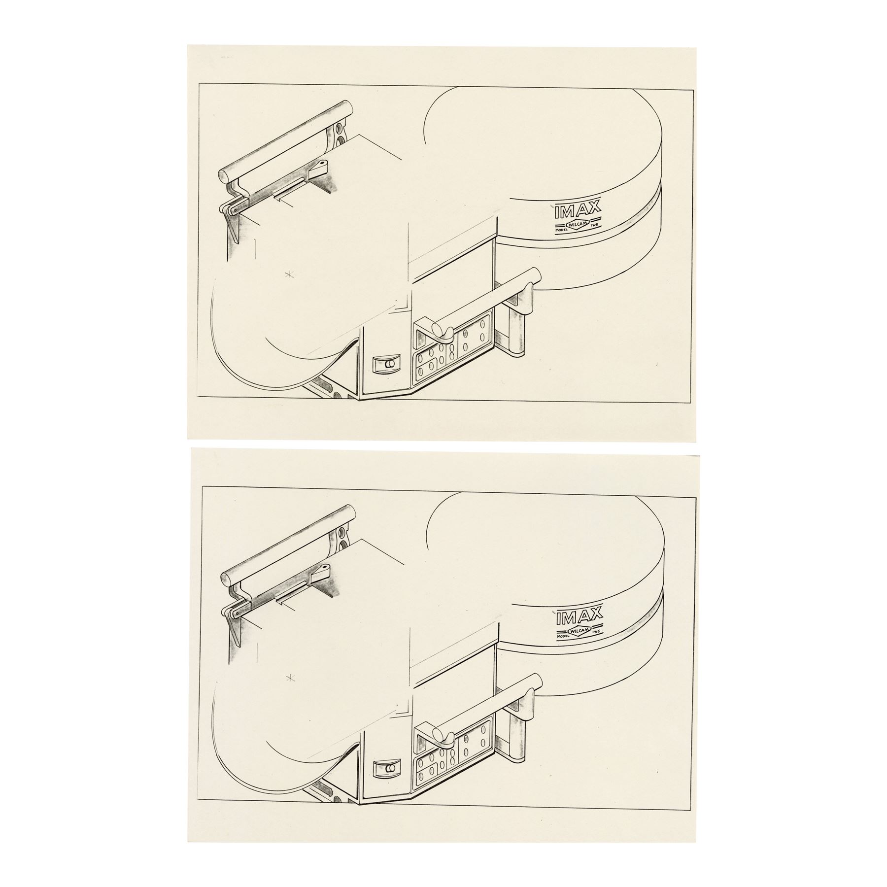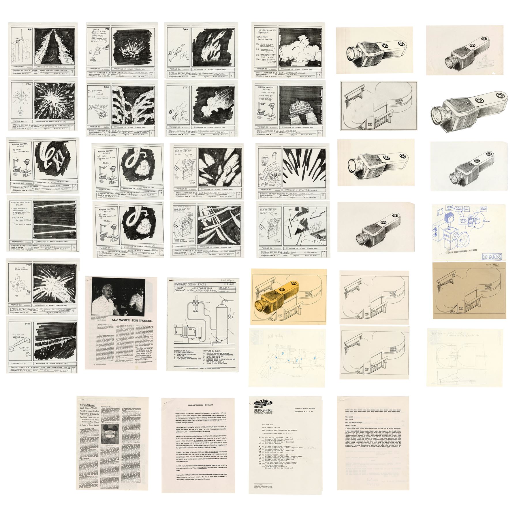 This lot comes from the collection of special photographic effects artist Douglas Trumbull. Created by production designer and art director Robert U. Taylor, it features 29 printed pages of effects storyboards depicting both the desire shot and the behind-the-scenes method for accomplishing it; eight printed pages of camera designs, including designs for an IMAX "Wilcam", with two camera design cut-outs and one hand-drawn camera component sketch in graphite on tracing paper; one manila folder marked "BIOS" with Trumbull's two-page biography, printed articles on Trumbull and Walt Disney World against Universal Studios; one manila folder marked "BUDGET" with two pages of typed and handwritten notes; and one manila folder labeled "STAGE A" with four pages of typed and handwritten notes and hand-drawn concept designs. This lot exhibits discoloration and torn edges. Dimensions: (largest) 11" x 17" (28 cm x 43.25 cm)