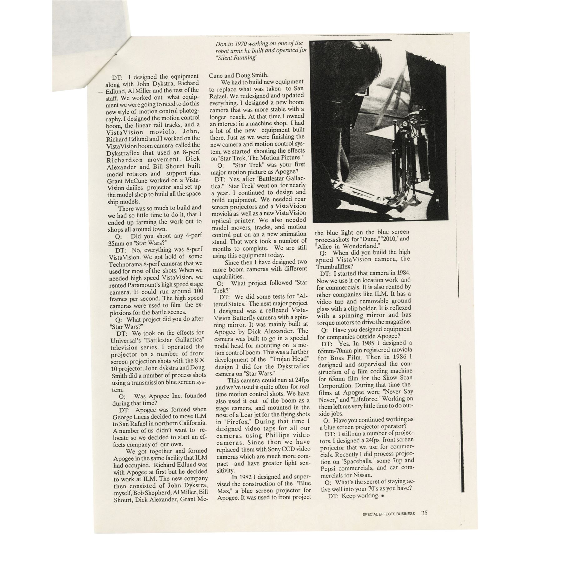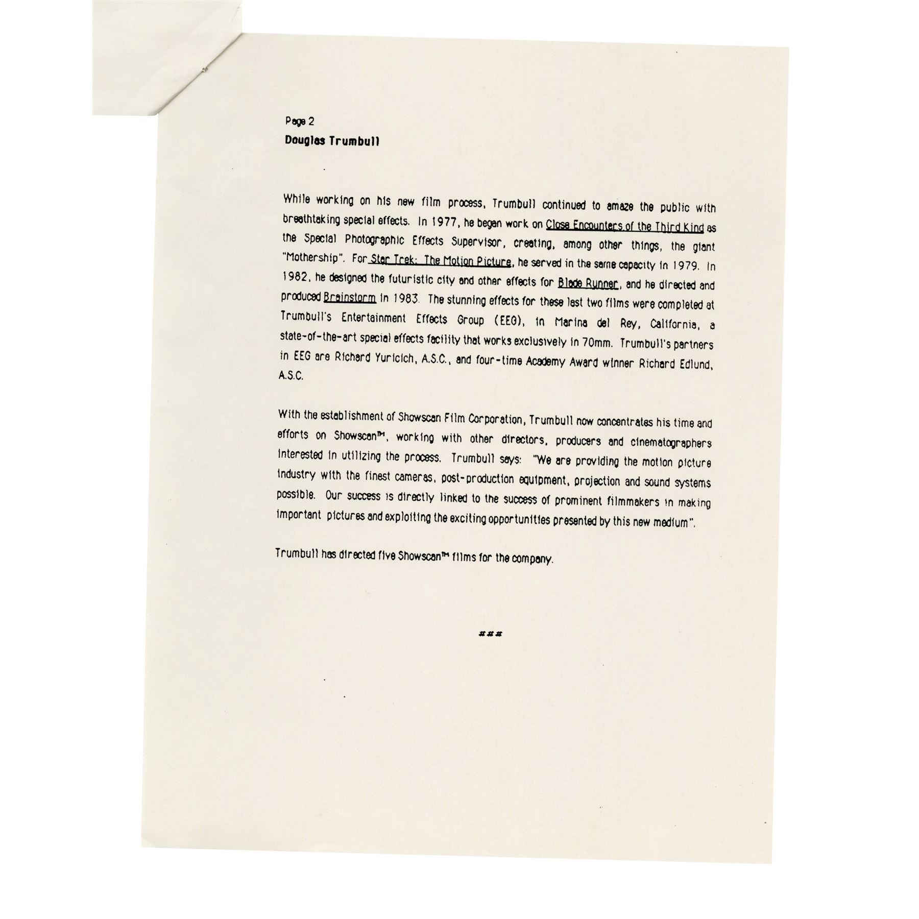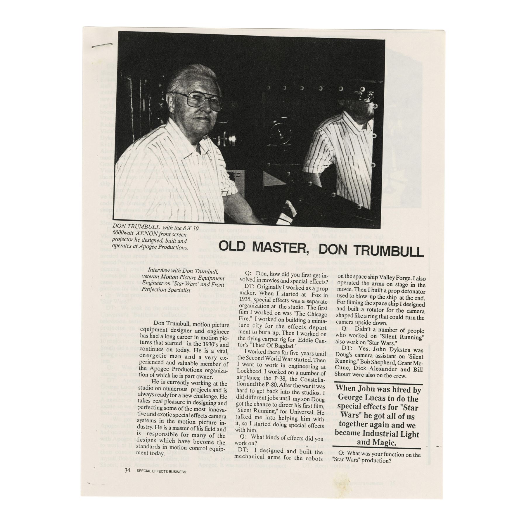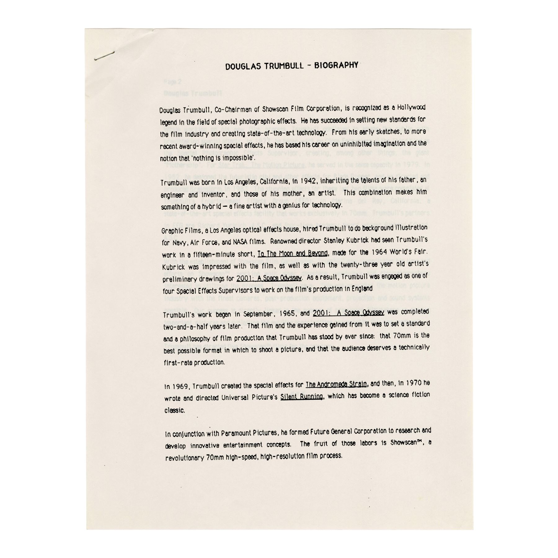 Sold without copyright; see notice in the Buyer's Guide.Visual effects pioneer Douglas Trumbull was born in Los Angeles in 1942. After abandoning architecture for technical drawing and cartooning, his talent for photorealism soon earned him work at Graphic Films, an esteemed Hollywood studio for which he designed groundbreaking cosmic effects for the 1964 New York World's Fair. After seeing Trumbull's work, director Stanley Kubrick hired him to create animations and VFX shots - including the iconic Star Gate sequence - for what would become his seminal masterpiece 2001: A Space Odyssey. From that film's success, Trumbull became one of the industry's most trusted photographic effects experts, designing and producing legendary screen moments in such sci-fi landmarks as Close Encounters of the Third Kind, Star Trek: The Motion Picture, and Blade Runner, all three of which earned him Academy Award& reg; nominations. In addition to directing the cult classics Silent Running and Brainstorm, Trumbull later received a Scientific and Engineering Award for his high-speed photography process Showscan in 1993, one of two specialty awards given to him by the Academy of Motion Picture Arts and Sciences before his death in 2022. 60 years since he first made his mark on global cinema, Propstore today celebrates Douglas Trumbull by presenting a selection of rare memorabilia from his personal collection to the public.