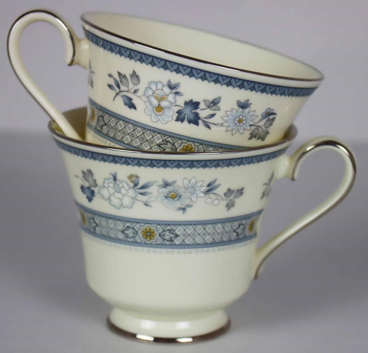 Royal Doulton136-piece tableware set of fine bone china, platinum trim, blue bands, tan & white flowers, made in England, 1980s. Service for 12 includes dinner plates (15), bread plates (12), salad plates (11), soup bowls(12), broth bowls (12), fruit bowls (10), tea pot w. lid (1), covered sugar bowl (1), creamer (1), tea cups (12) & saucers (16), demi tasse cups (12) & saucers (12), serving platters (3), vegetable serving bowls (3), covered casserole (1), gravy boat (1) & plate (1). Set comes with zippered soft cloth storage cases from Neiman Marcus.