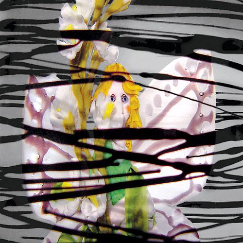 Randall Grubb glass column sculpture, with a rounded top, dark horizontal stripes on the exterior, and containing a fairy, with mauve-striped white wings and green clothing, sitting on a pile of speckled rocks, next to a stalk of pale pink blossoms and buds. Signature cane. Height 8". NO RESERVE