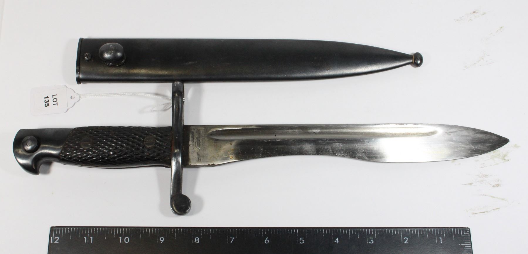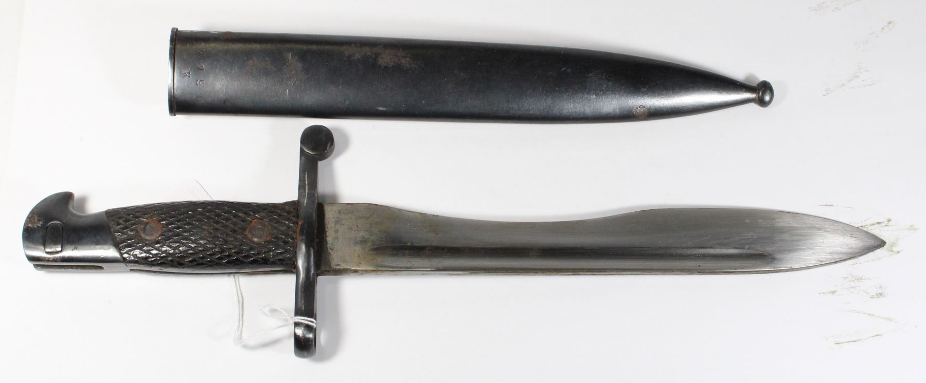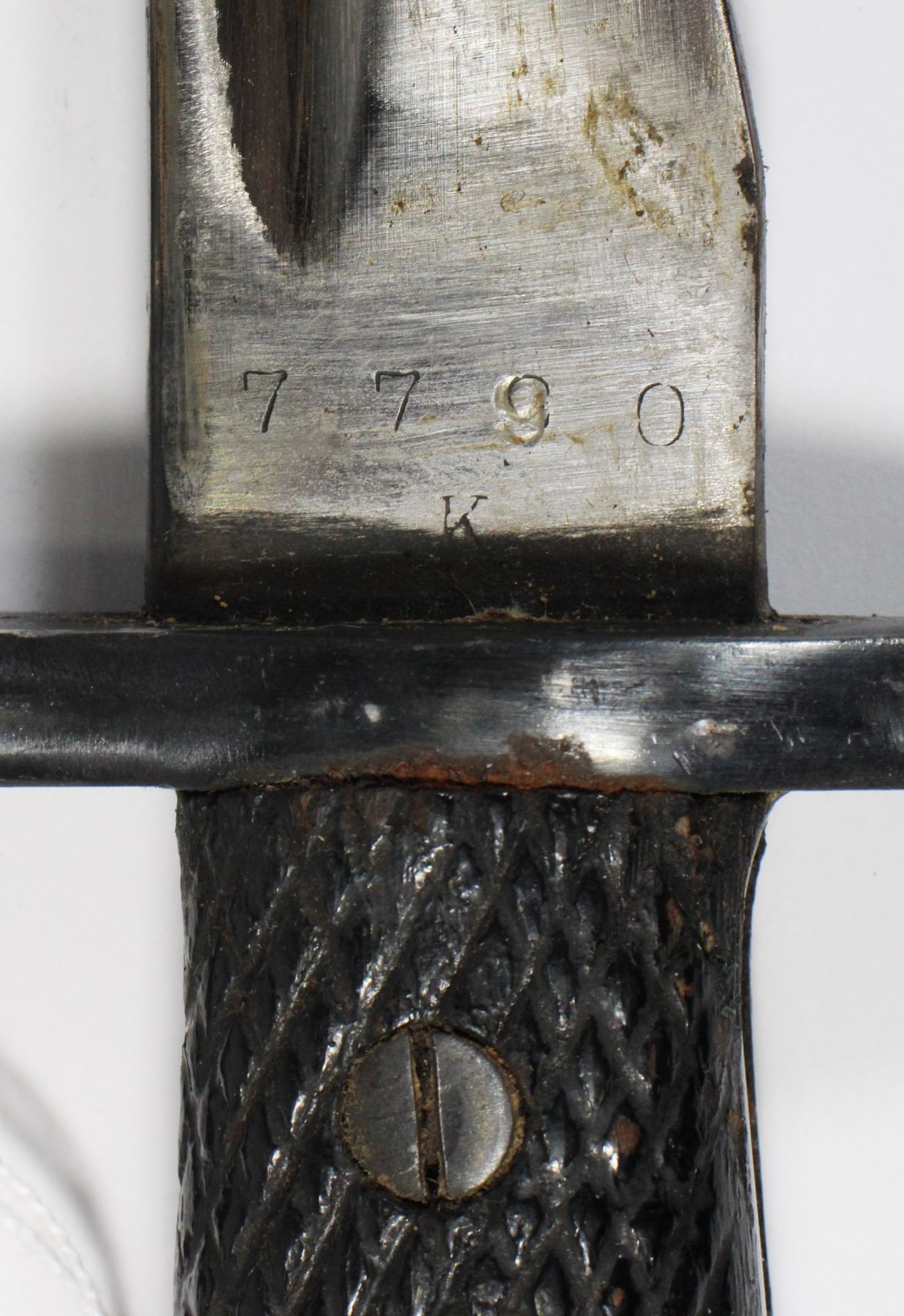 NUMBERED 7790K ON SCABBARD, MEASURES 16 INCHES IN SCABBARD, WITH 10 INCH BLADE. WORLD WAR TWO SPAIN SPANISH BAYONET