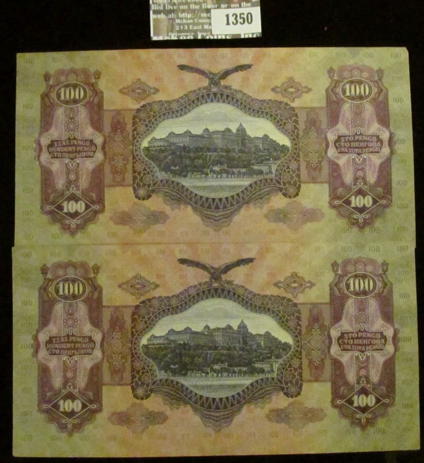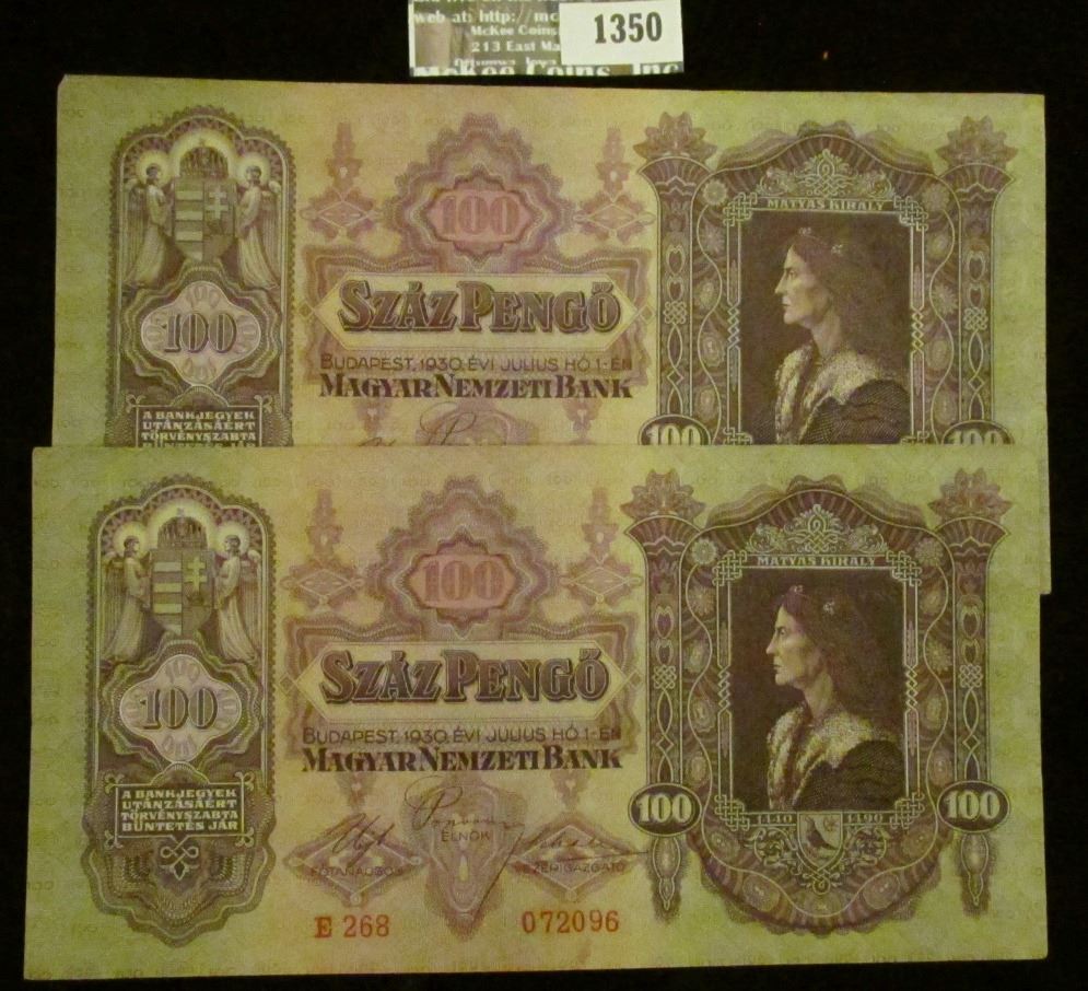 1350 _ Rare pair of Consecutively serial numbered Crisp Uncirculated 1930 Budapest, Hungary 100 Peng