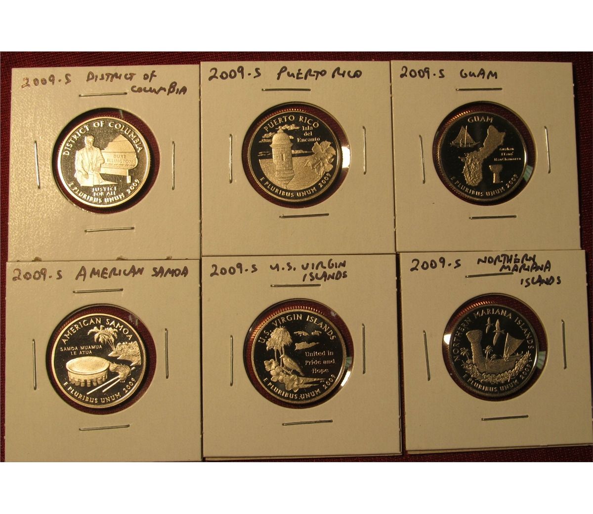 1351. Set of 6 2009-S Proof Washington Quarters – District of Columbia, Puerto Rico, Guam, American Samoa, US Virgin Islands, Northern Mariana Islands