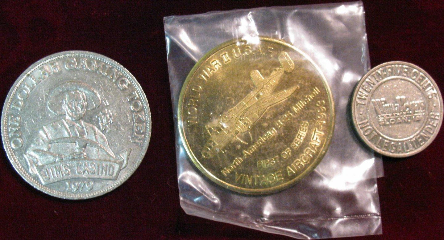 1352. .25c Winnavegas Good For from Sloan, Ia.; 1993 Ankeny Ia. Aviation Medal First Series; & $1 West Wendover, Nev. $1 Gaming Token.