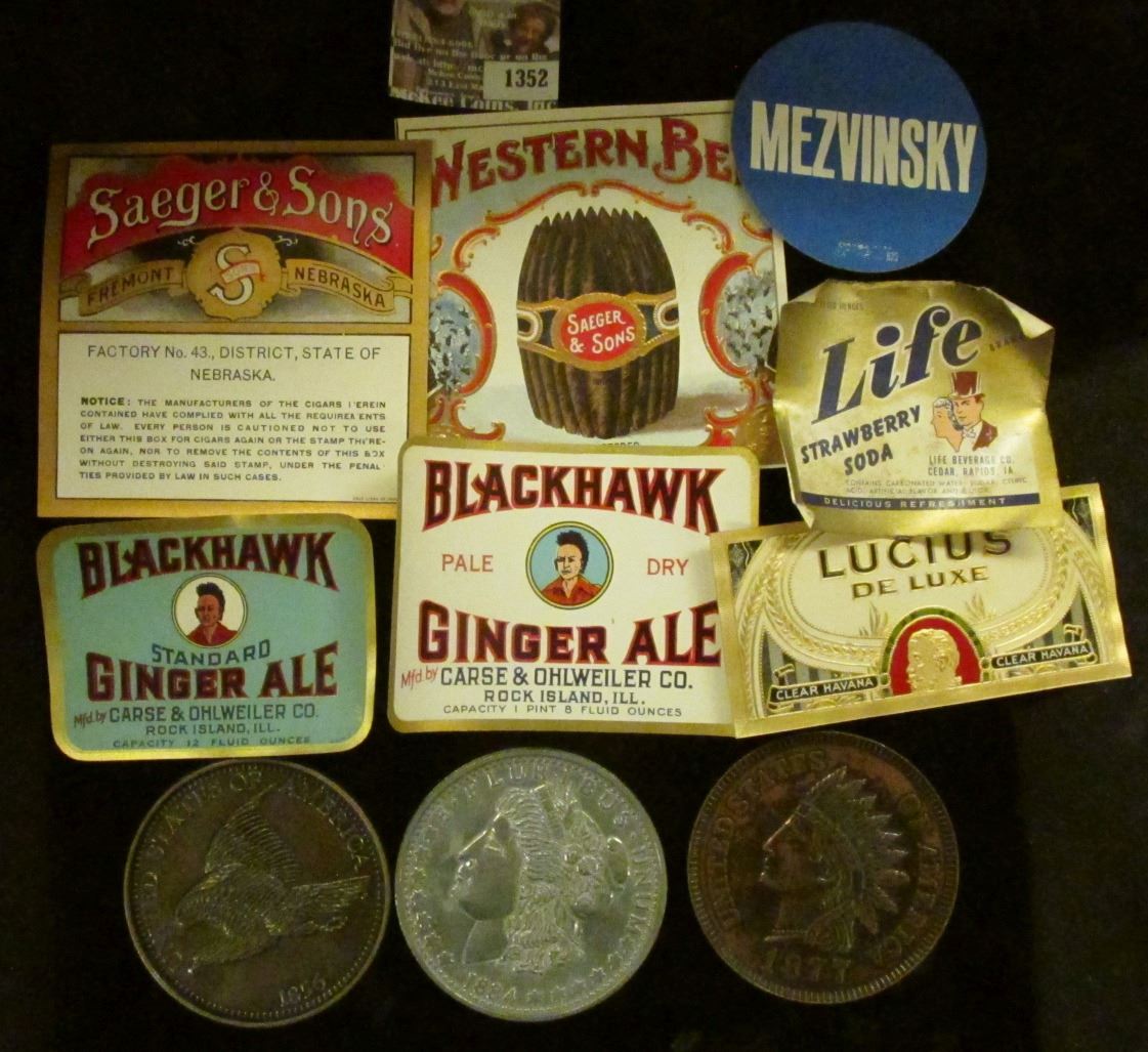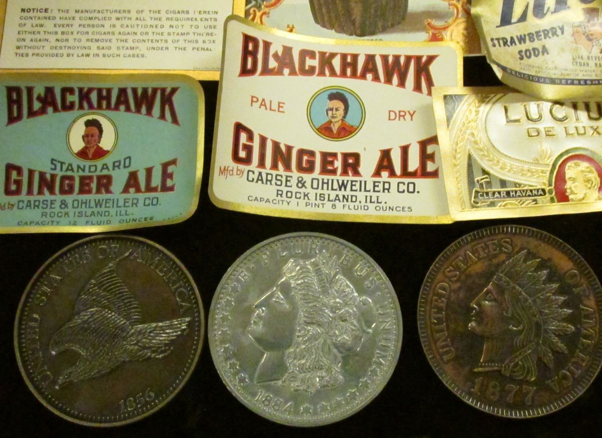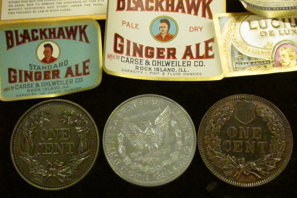 (7) Different Bottle Labels; Indian cent, Flying Eagle Cent, & Morgan Dollar 3" metal replicas.