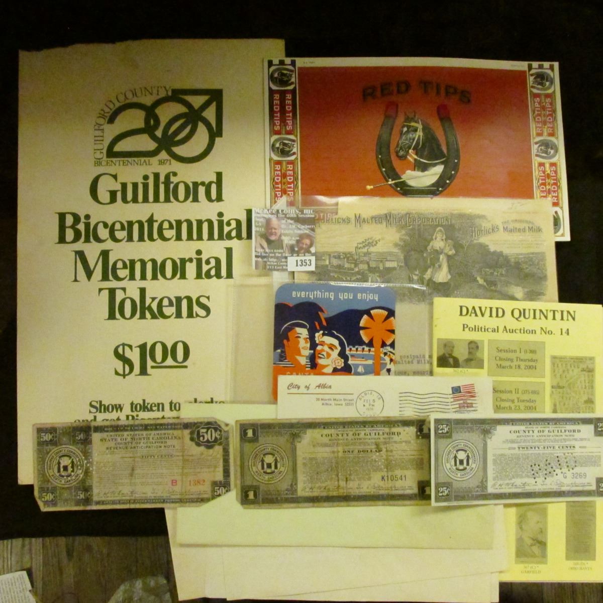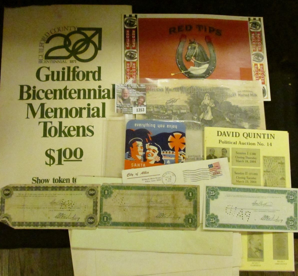 "…Santa Catalina" Label; "Red Tips" Cigar Box label; "David Quintin Political Auction No.14" catalog; some Coorespondence related to "George Junior Republic" Banknotes; coorespondence with the City of Grinnell in regards to depression scrip; "City of Albia"; 1929 letter on letter head "Horlick's Malted Milk Corporation...Racine, Wis., U.S.A."; poster for 1971 "Guilford Bicentennial Memorial Tokens $1.00"; .25c, .50c, & $1 "County of Guilford State of North Carolina" 1933-34 era Depression Scrip.