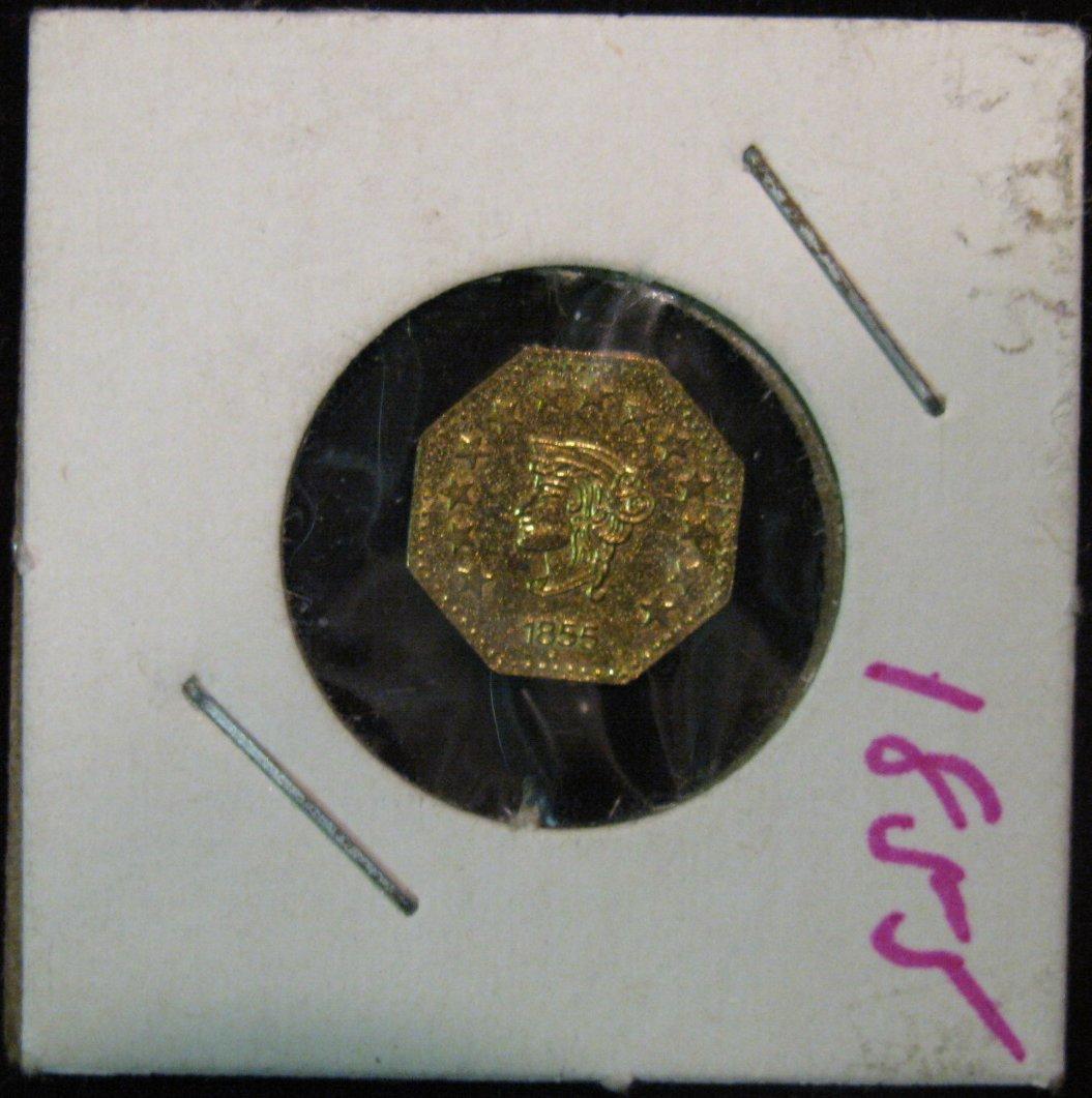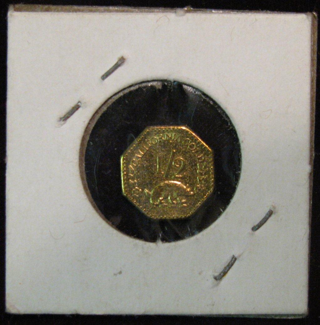 1356. 1855 California Gold 1/2 Octagonal Token. Not a Pioneer fractional gold piece. BU.