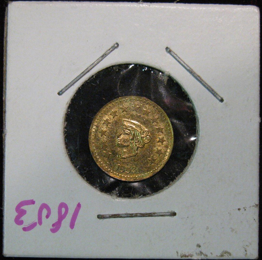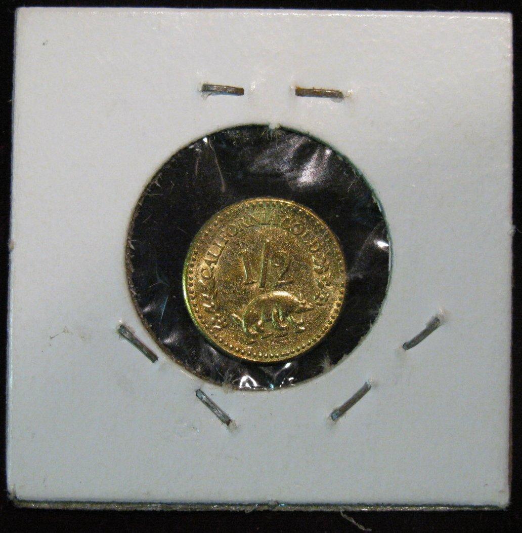1357. 1853 California Gold 1/2 Round Token. Not a Pioneer fractional gold piece. BU.