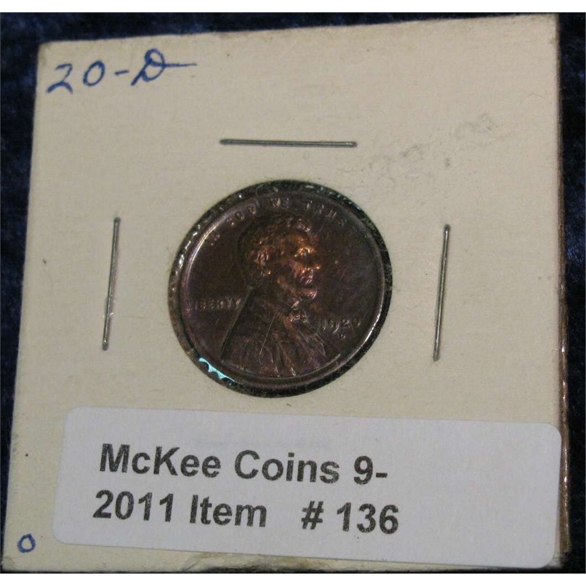 136. 1920 D Lincoln Cent. AU 50. Cleaned & retoned.
