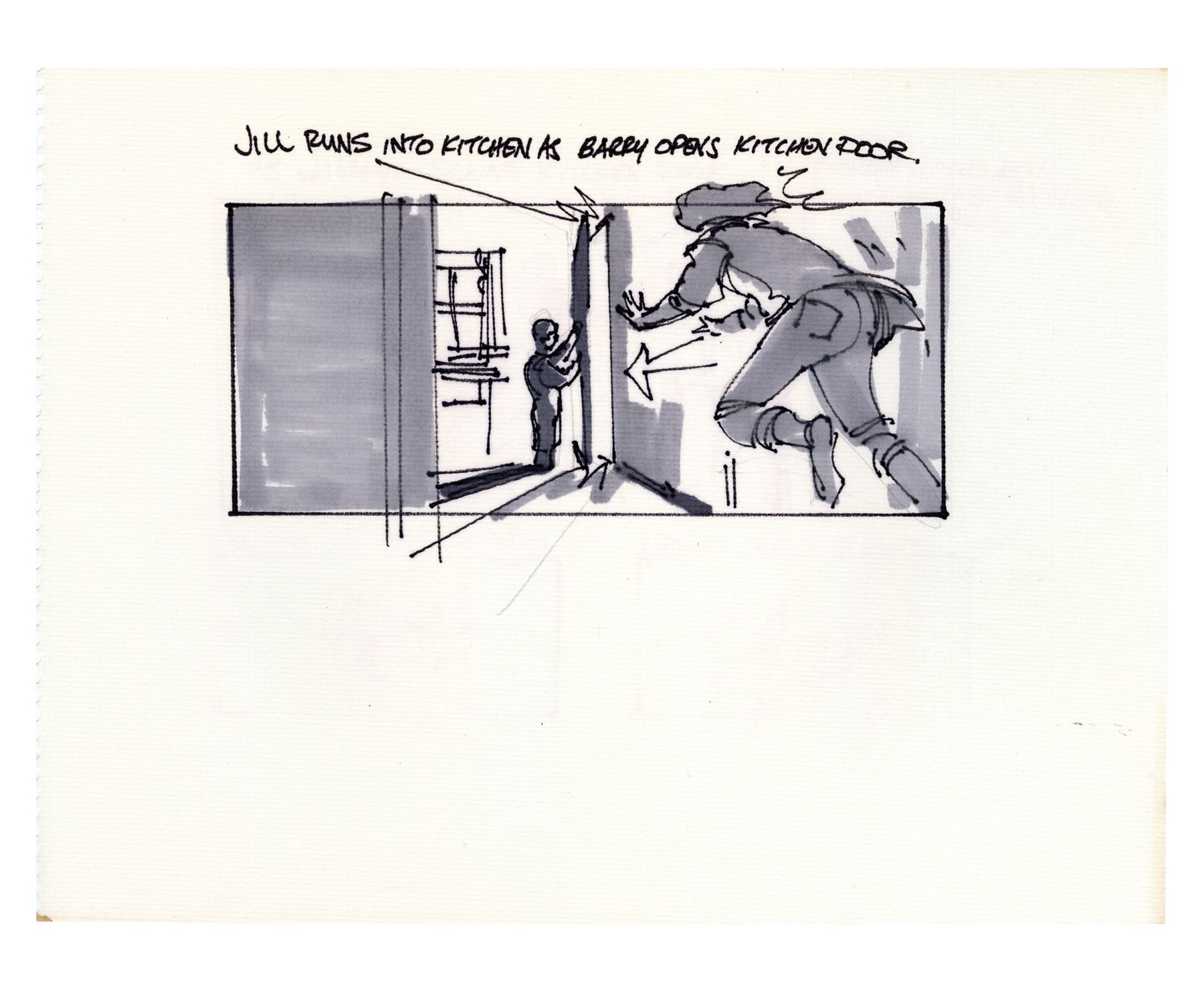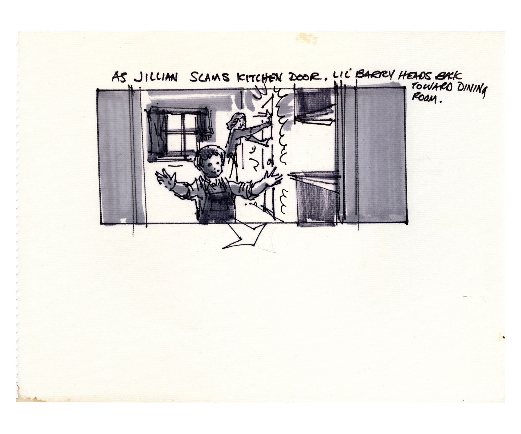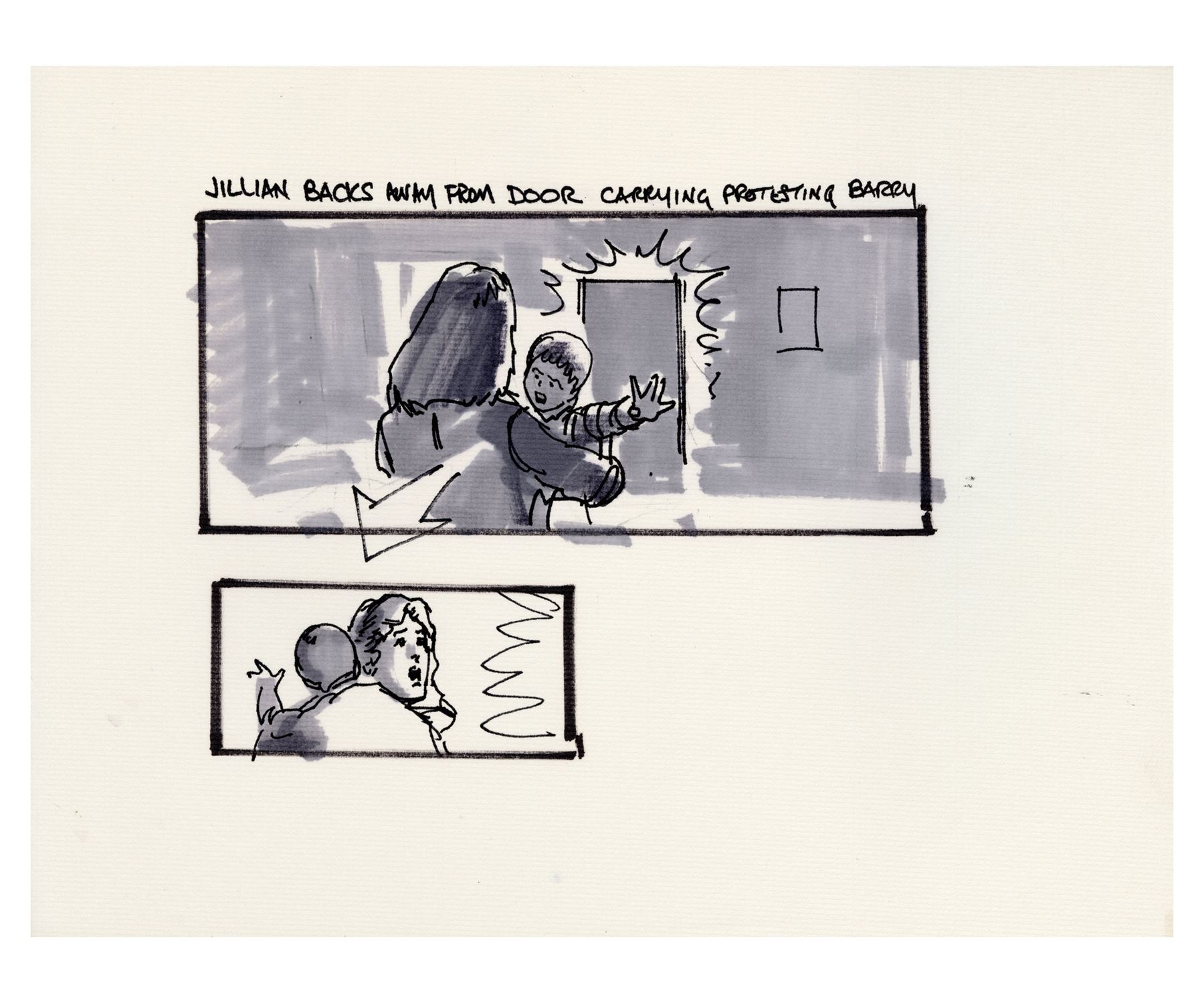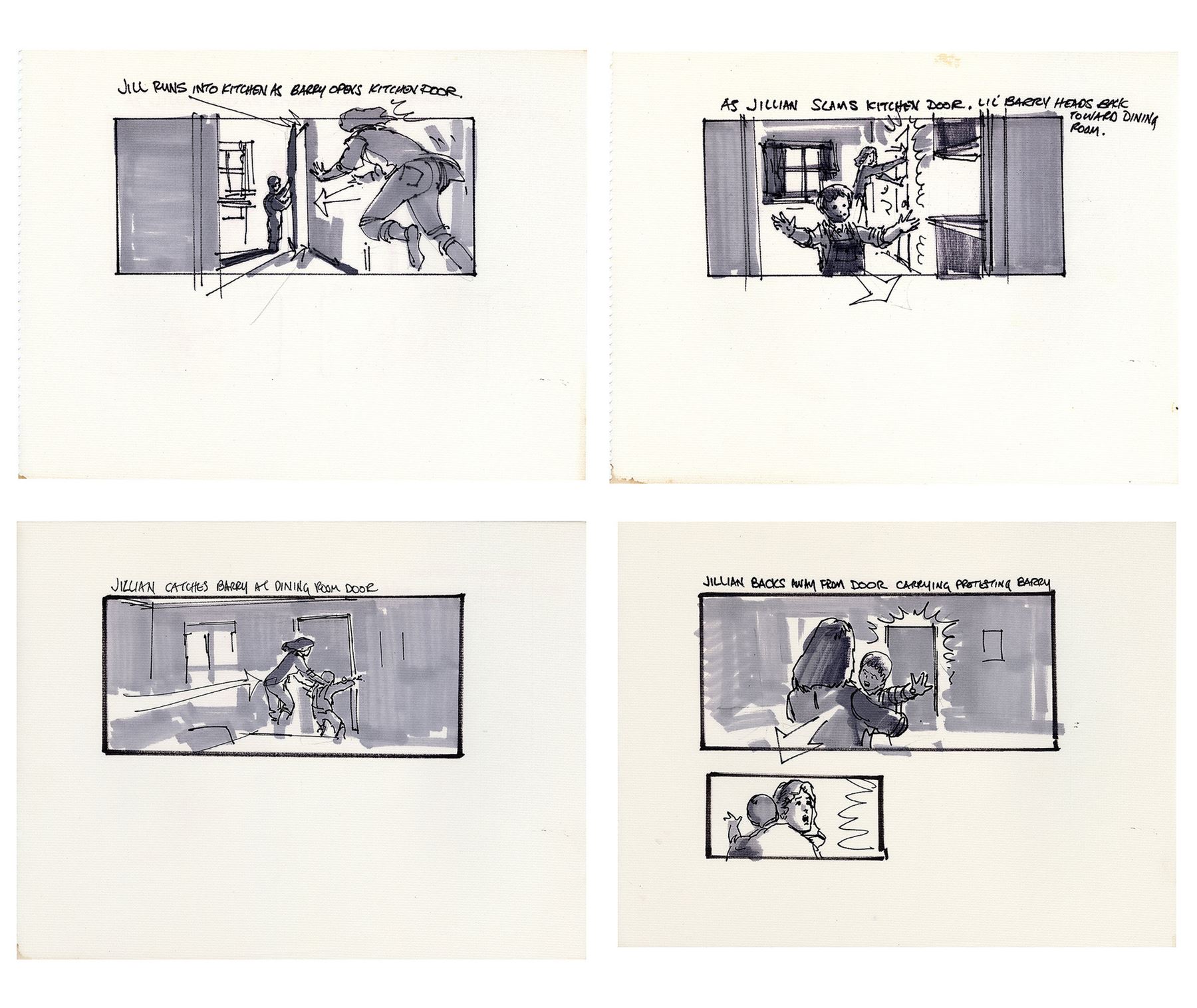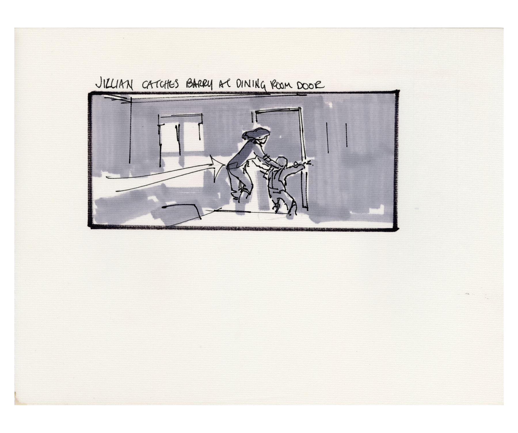 Created by Jenson to coordinate which VFX were needed for the abduction sequence, this set consists of four storyboards labeled "Jillian Runs Into Kitchen As Barry Opens Kitchen Door," "As Jillian Slams Kitchen Door, Lil' Barry Heads Back Towards Dining Room," "Jillian Catches Barry At Dining Room Door," and "Jillian Backs Away From Door Carrying Protesting Barry." Each is rendered in ink and marker on serrated drawing paper. The set exhibits edges torn from being pulled out of a pad, folded corners, and discoloration from age. Dimensions: (each) 11.75" x 9" (30 cm x 23 cm)