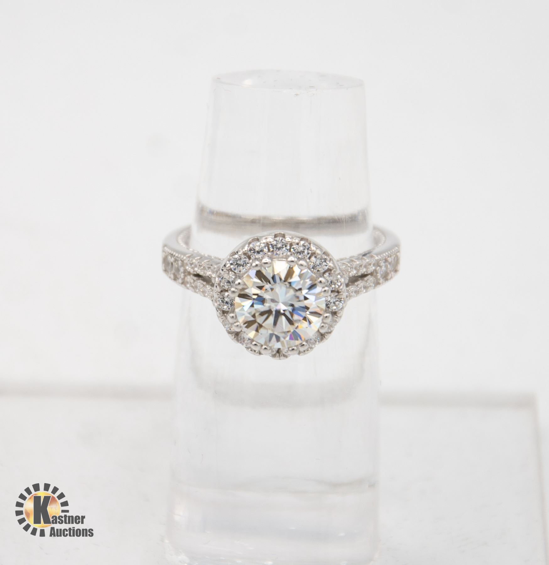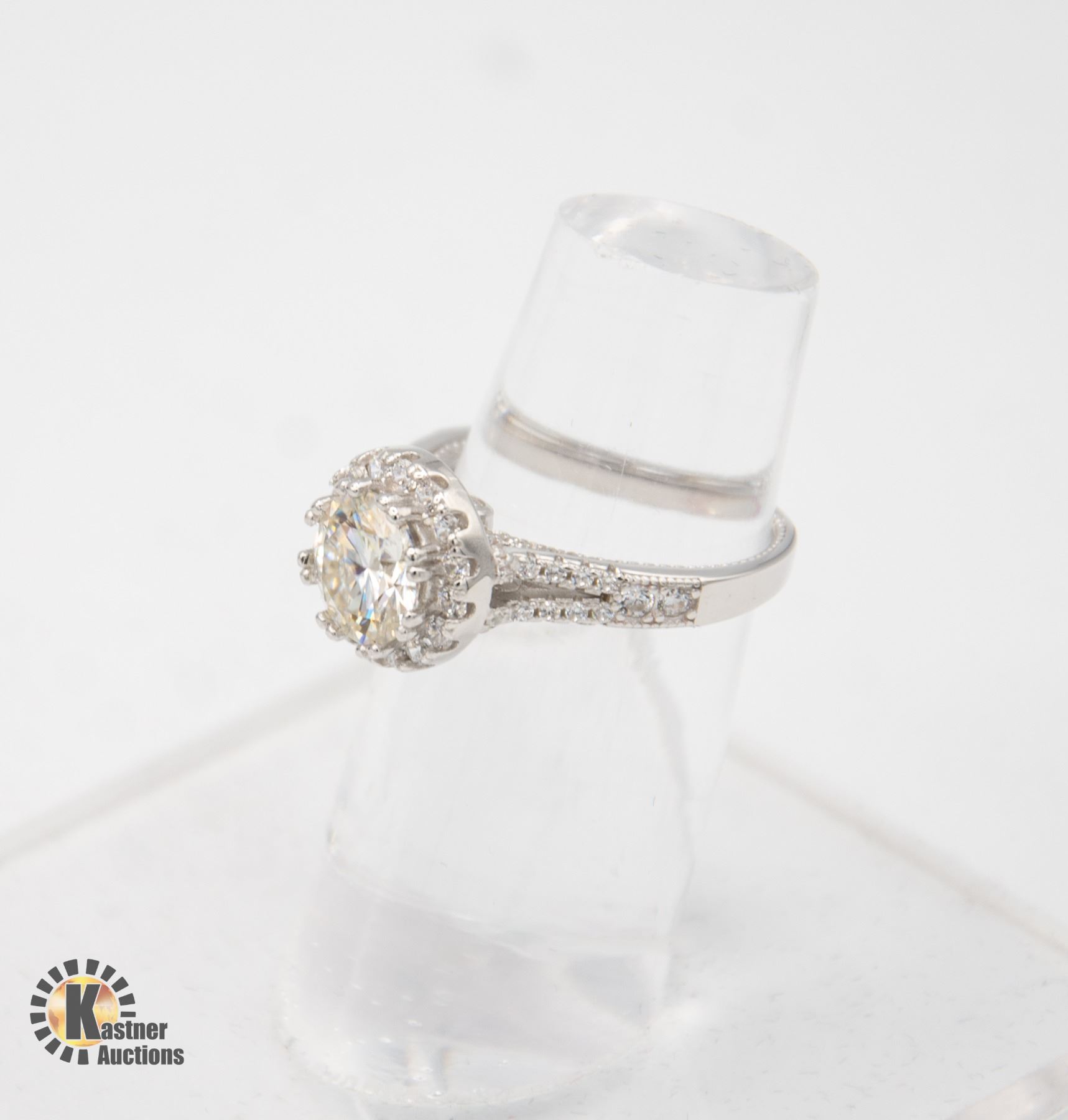 MOISSANITE STONE VVS D COLOR SET IN 12 CLAWS WITH NUMEROUS ROUND BRILLIANT CUT CUBIC ZIRCONIA IN HALO WITH MORE SET IN SHANKS SET IN 925 SILVER RING SIZE 7 COMES WITH GIFT BOX