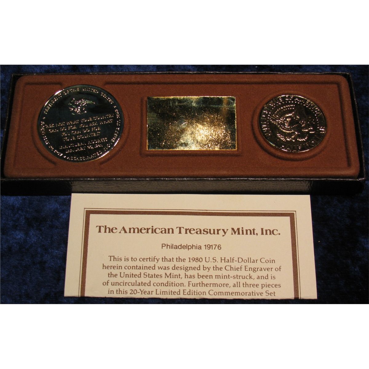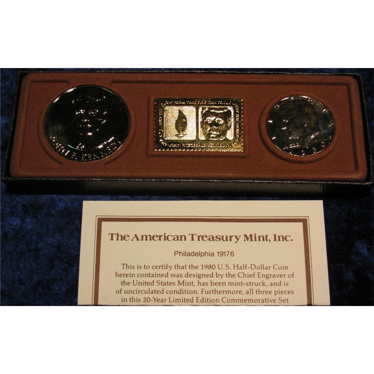 1365. 24K Gold Overlay Kennedy Memorial Set with 1980 D Kennedy Half Dollar, Medal, and Stamp.