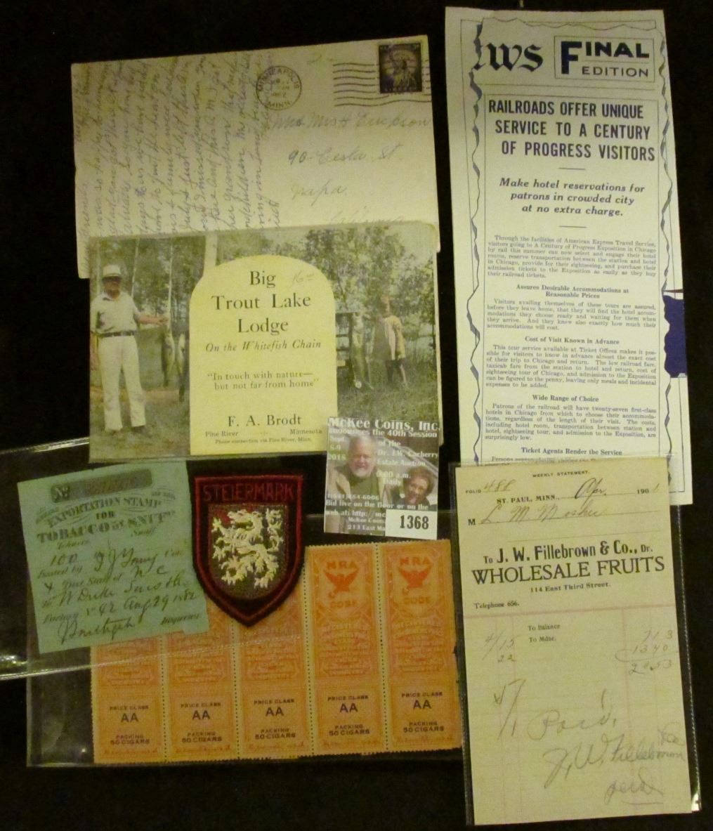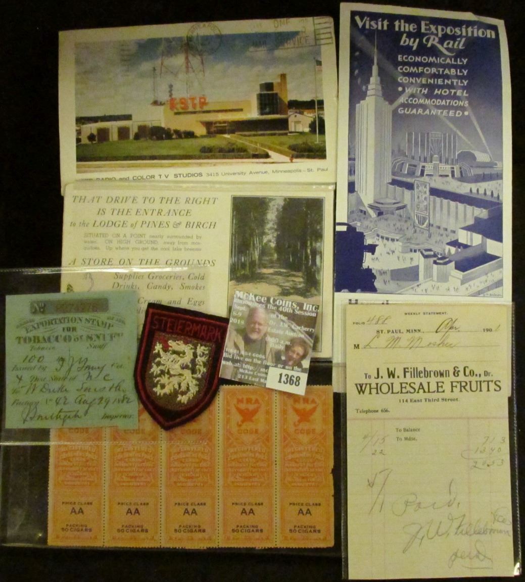 Series of 1879 Exportation Stamp for Tobacco or Snuff"; (5) Mint, attached stamps "Price Class AA Packing 50 Cigars"; advertising booklet "Big Trout Lake Lodge On the Whitefish Chain…Pine River, Minnesota"; Post card "KSTP Radio & Color TV Studios…"; "Steiermark" embroidered patch; April 1901 Invoice "J.W. Fillebrown & Co....St. Paul, Minn."; & brochure "How the Chicago & North Western Railway can serve you in Chicago A Century of Progress 1933".