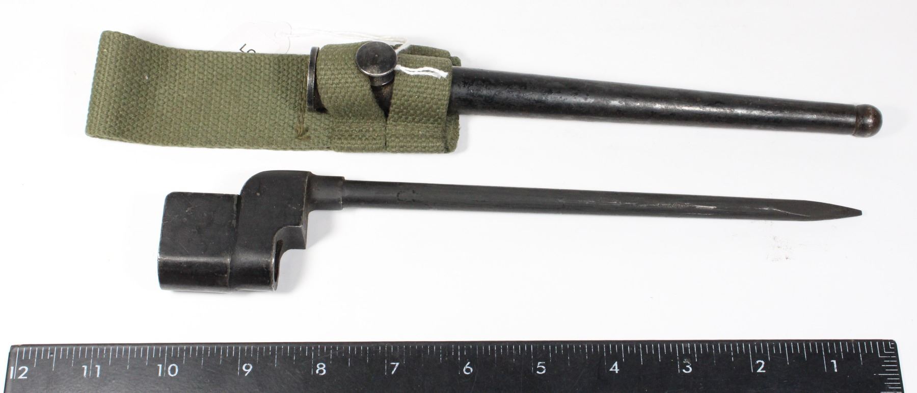 KOREAN WAR COMMONWEALTH SPIKE BAYONET WITH GREEN 1952 DATED FROG. INCLUDES METAL. MEASURES 10 INCHES IN SCABBARD,WITH 8 INCH BLADE. CANADIAN BRITISH COMMONWEALTH ALLIED FORCES COLD WAR ERA