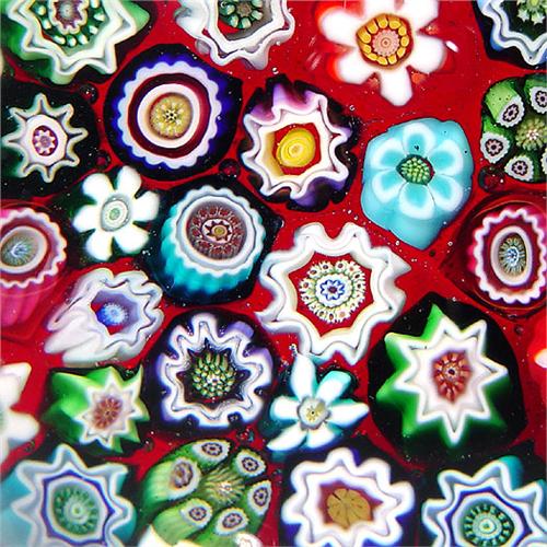 Julie Scrutton Lewis 1998 close packed millefiori paperweight. The piece is composed of assorted complex canes, in blue, red, green, purple, pink, turquoise, yellow, and white, on translucent red ground. Signed/dated. Edition # 16 of a limited edition of 50. Diameter 2 3/8". NO RESERVE