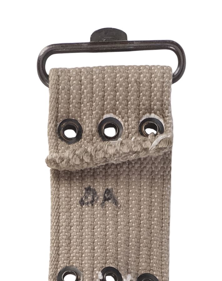 This beige nylon belt features a metal clasp closure and "DA" hand-marked for Aykroyd on the interior, a metal plate holster to hold a ghost trap with a leather strap, and a second leather holster connected via a wraparound telephone cord to a plastic and foam rubber faux electronic greeblie addition with static wiring. The holsters exhibit cracking and some grime from wear and age,