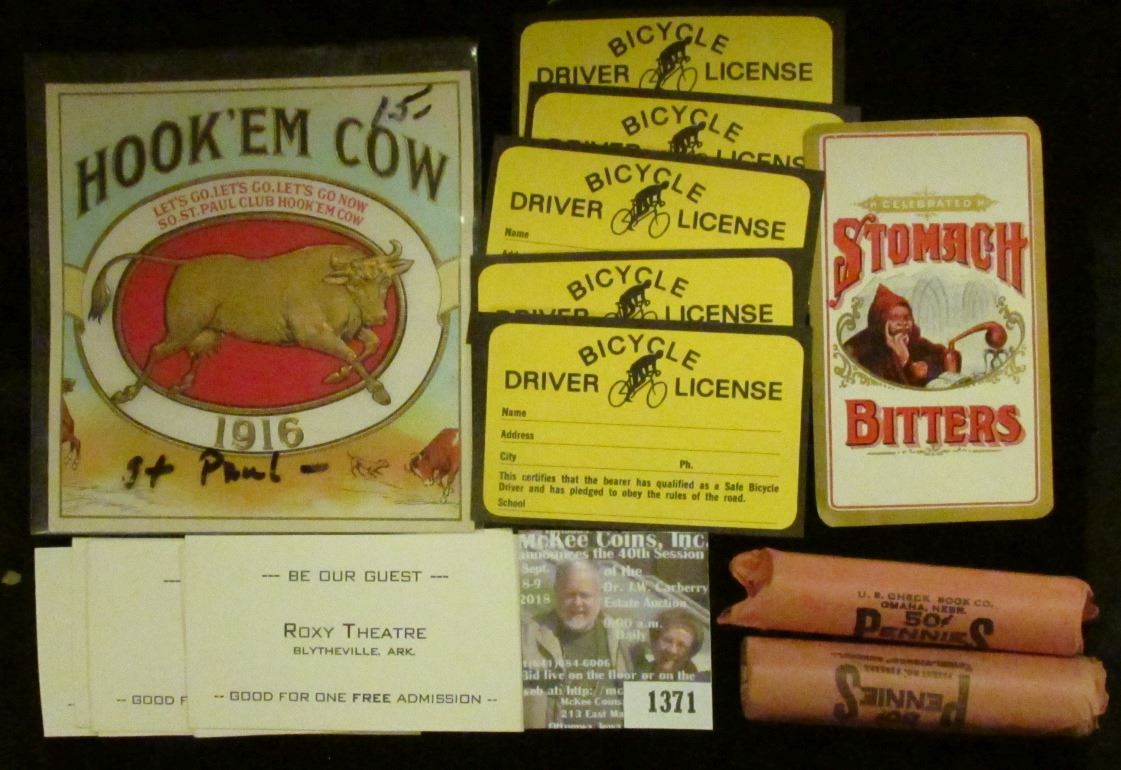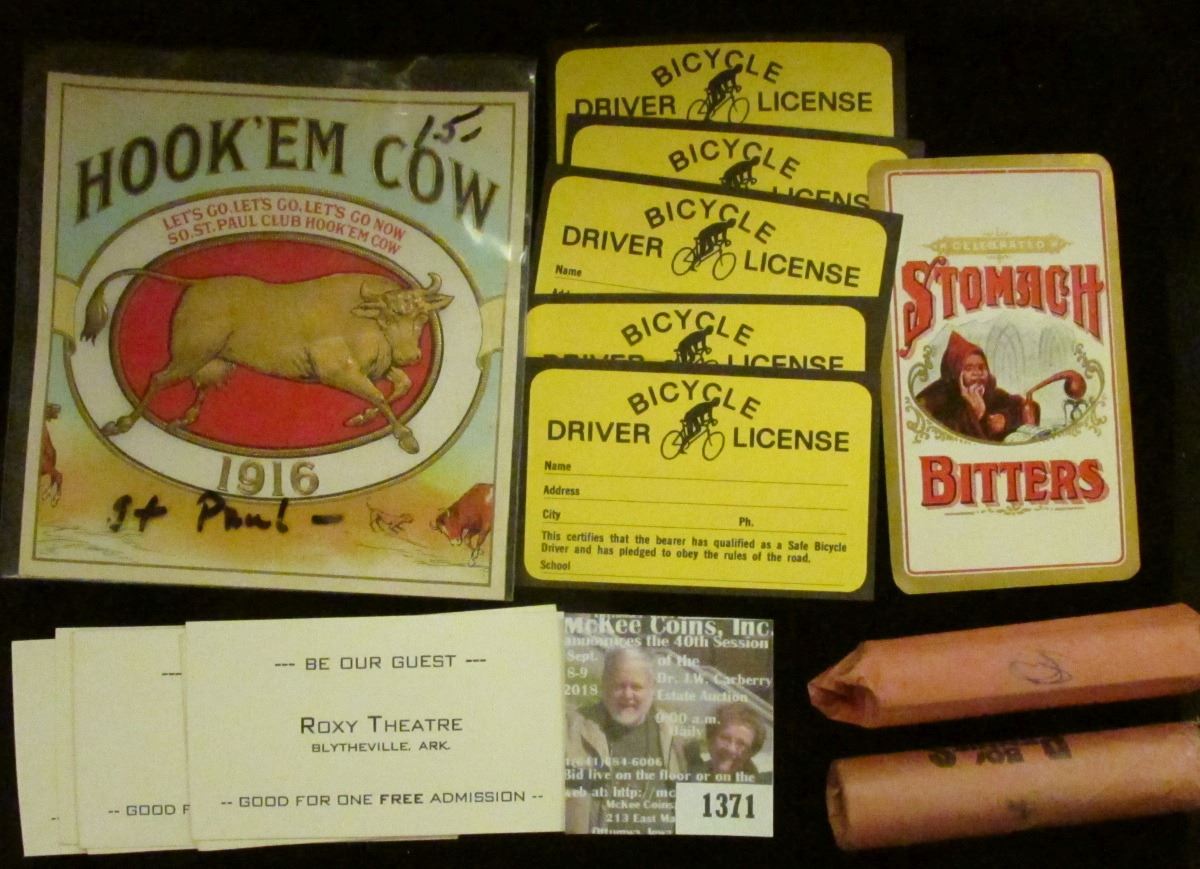 "Hook'em Cow Let's Go, Let's Go, Let's Go Now 1916", 1916 St. Paul Cigar Box Art; Quack Doctor bottle label "Celebrated Stomach Bitters"; (5) unused Tickets "Be Our Guest Roxy Theatre Blytheville, Ark. Good For One Free Admission"; (5) unissued Bicycle Driver License"; & (100) Old U.S. Wheat Cents.