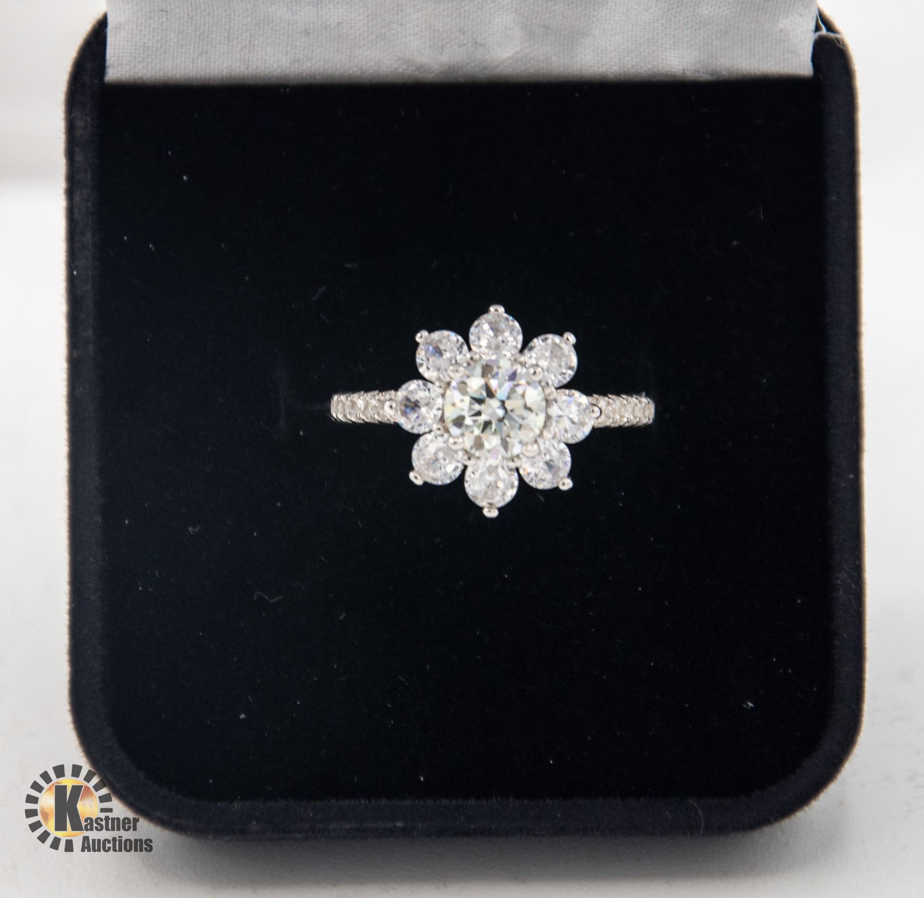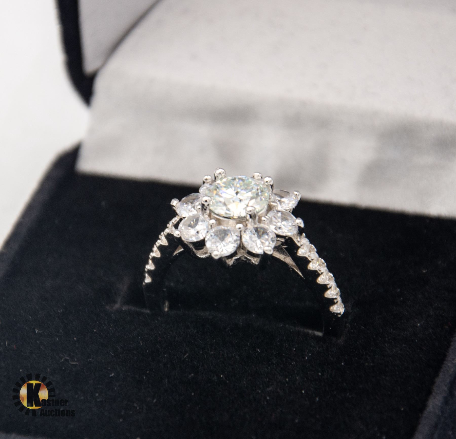 BRILLIANT CUT MOISSANITE STONE VVS D COLOR SET IN CENTER WITH HALO WITH 8 ROUND BRILLIANT CUT CUBIC ZIRCONIA AND MORE SET IN EACH SHANK SET IN 925 SILVER RING SIZE 7