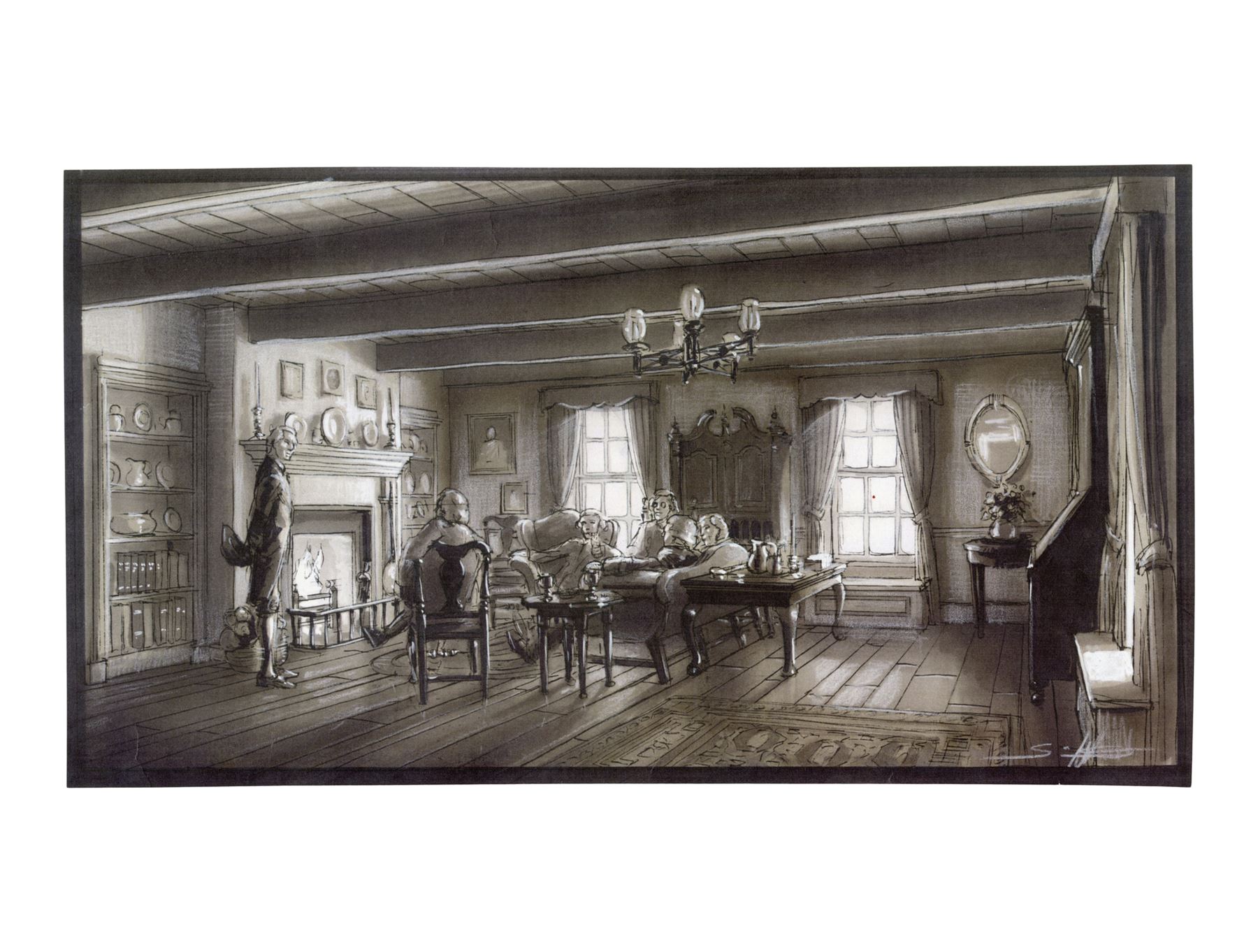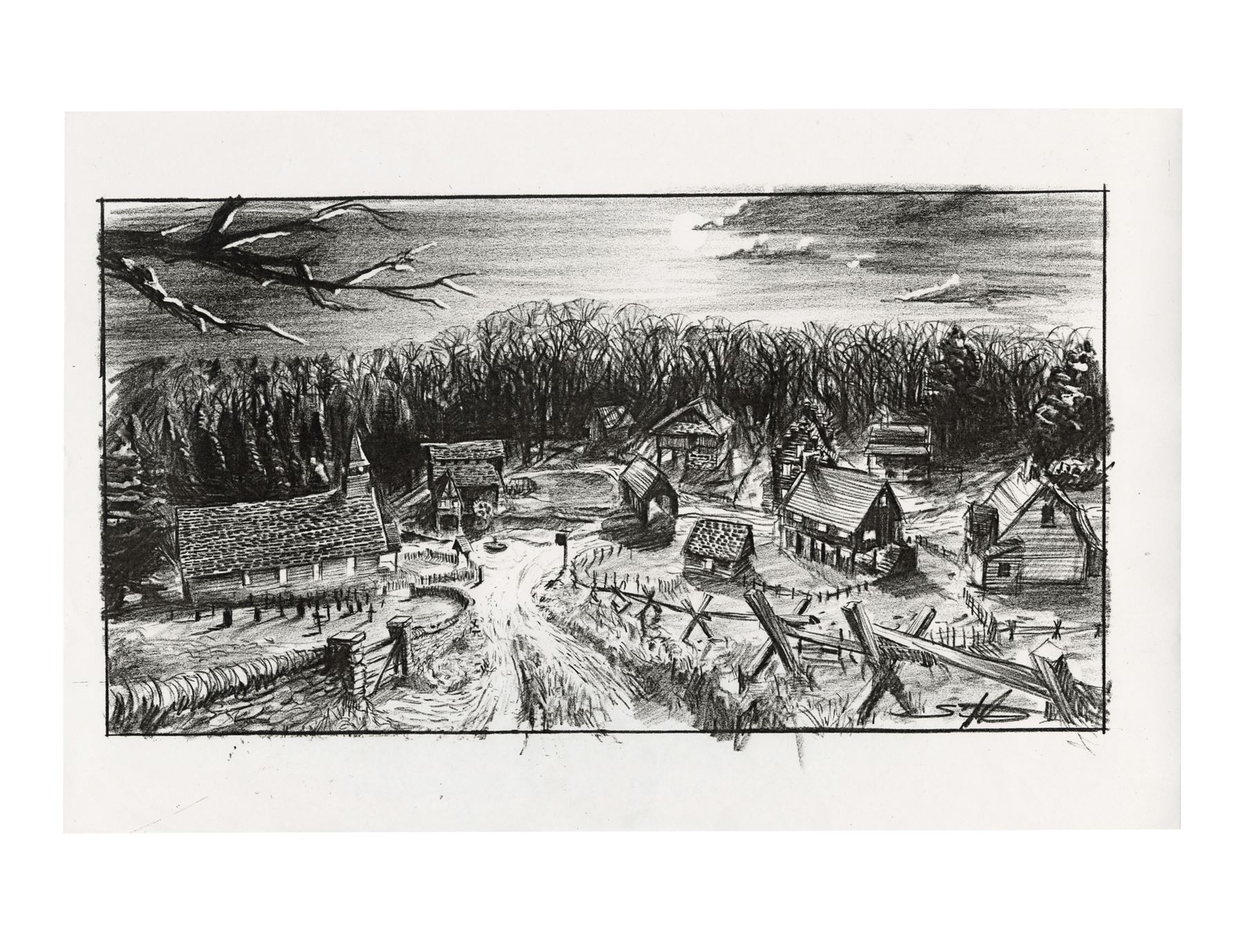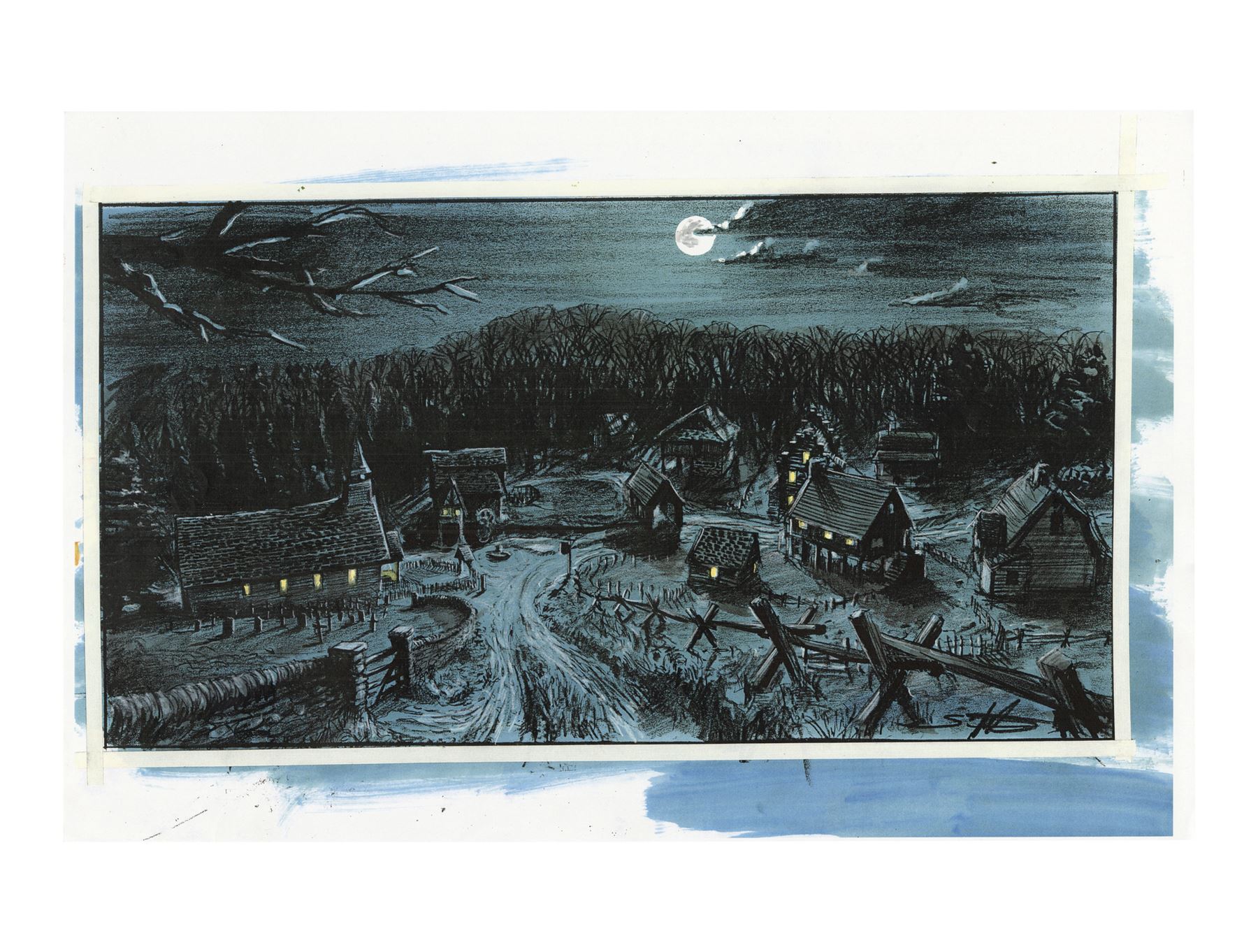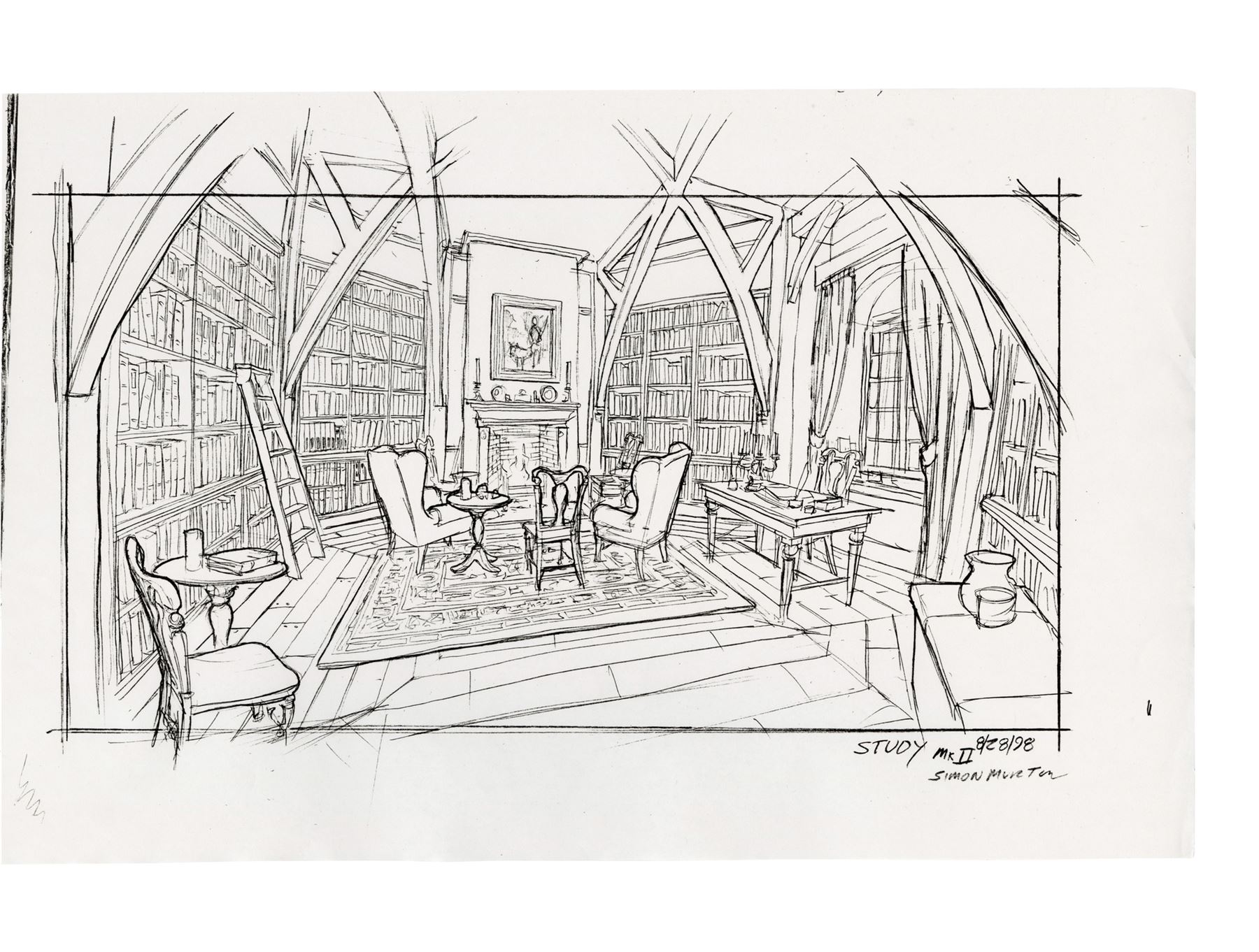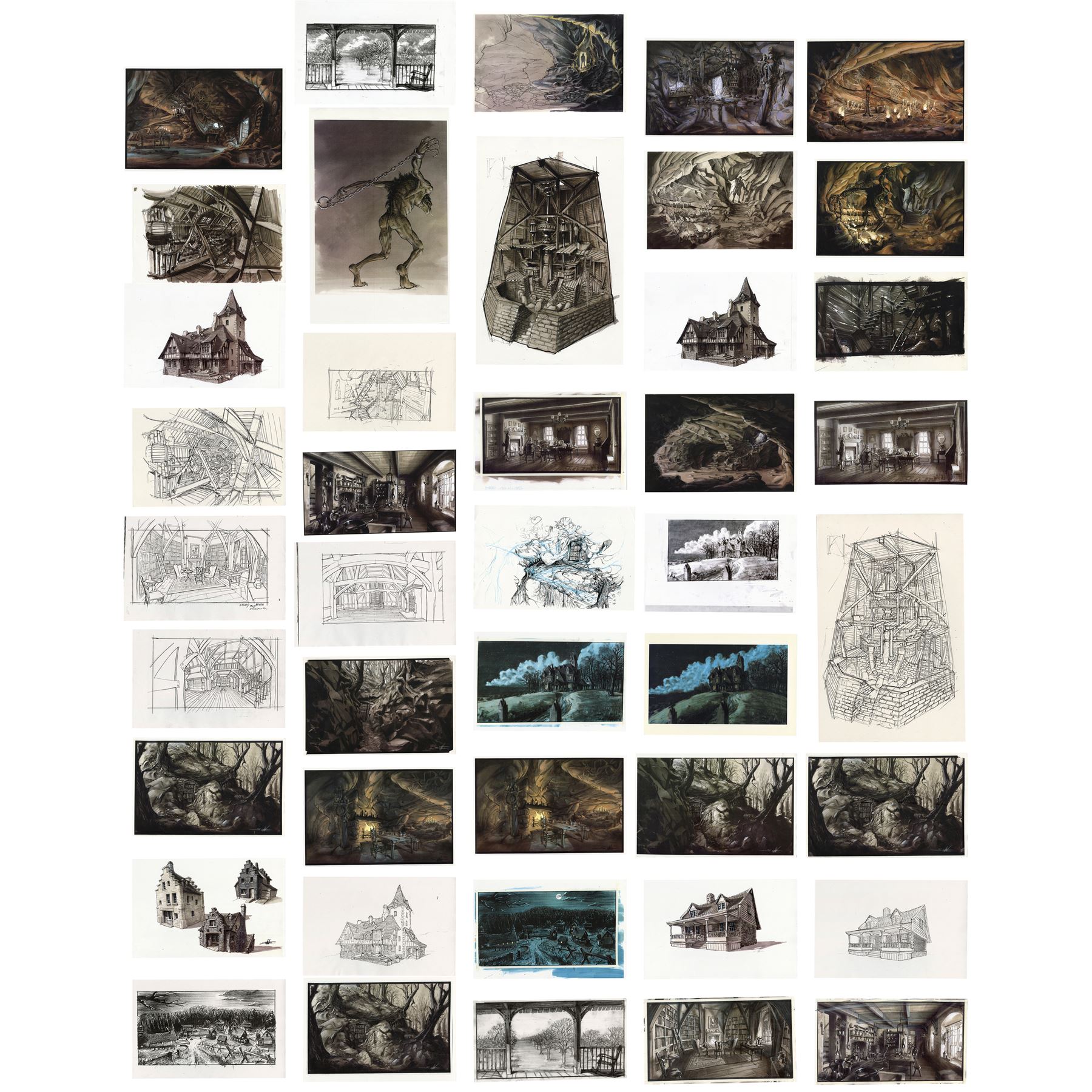 SLEEPY HOLLOW (1999) - Set Concept Artwork Prints - A set of concept artwork prints from Tim Burton's Sleepy Hollow. Created by concept illustrator Simon Murton, this lot consists of 44 concept artwork pieces with 16 images created as line drawings. These designs include Lady Van Tassel's attic, the Crone's cave interior and entrance, Baltus Van Tassel's study, and various village homes. Some of these designs feature Murton's printed signature. This lot exhibits minor discoloration. Dimensions: (each) 11" x 17" (28 cm x 43.25 cm)
