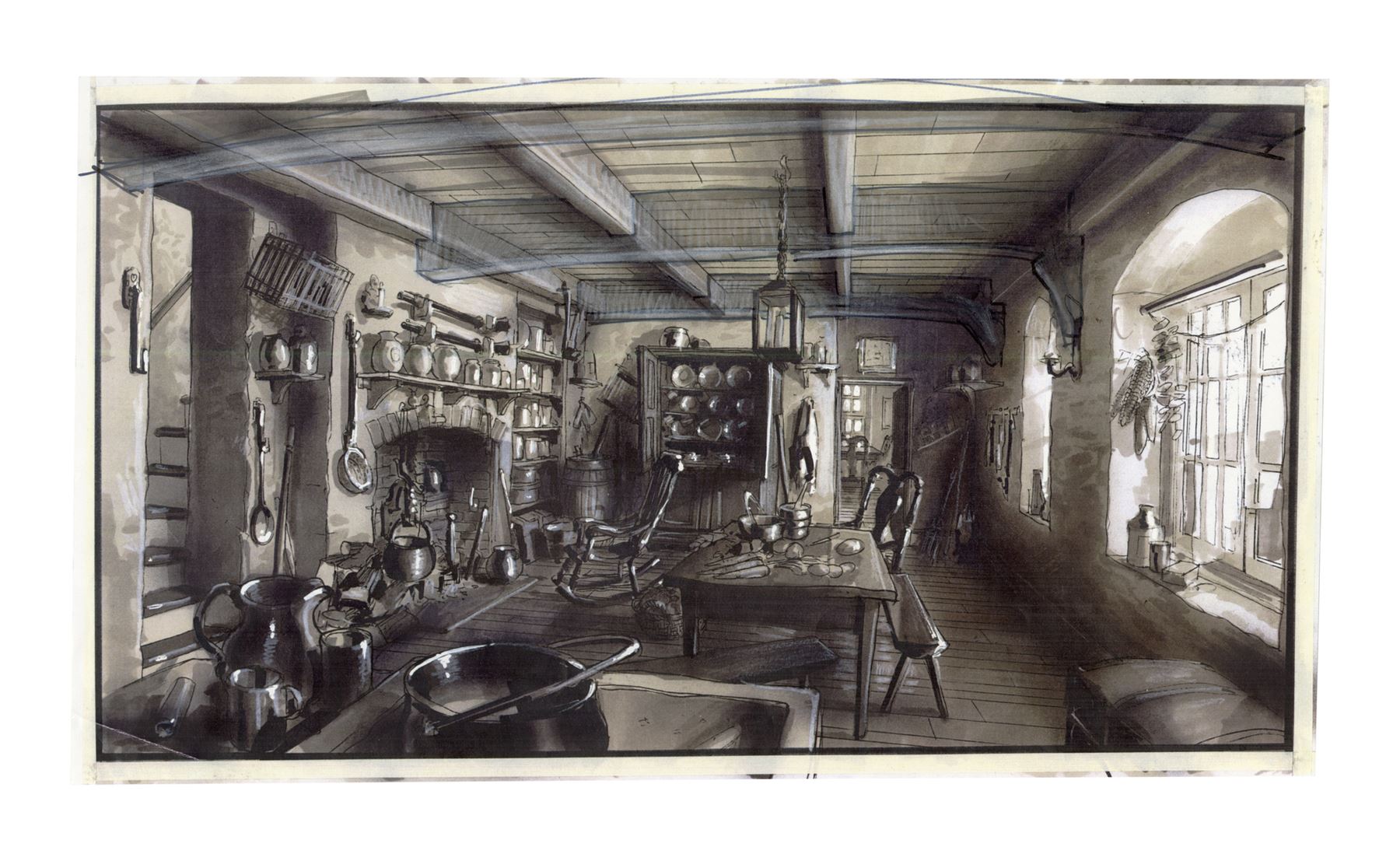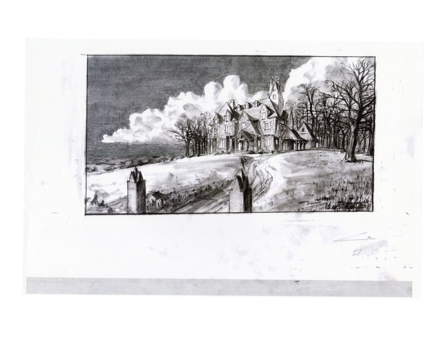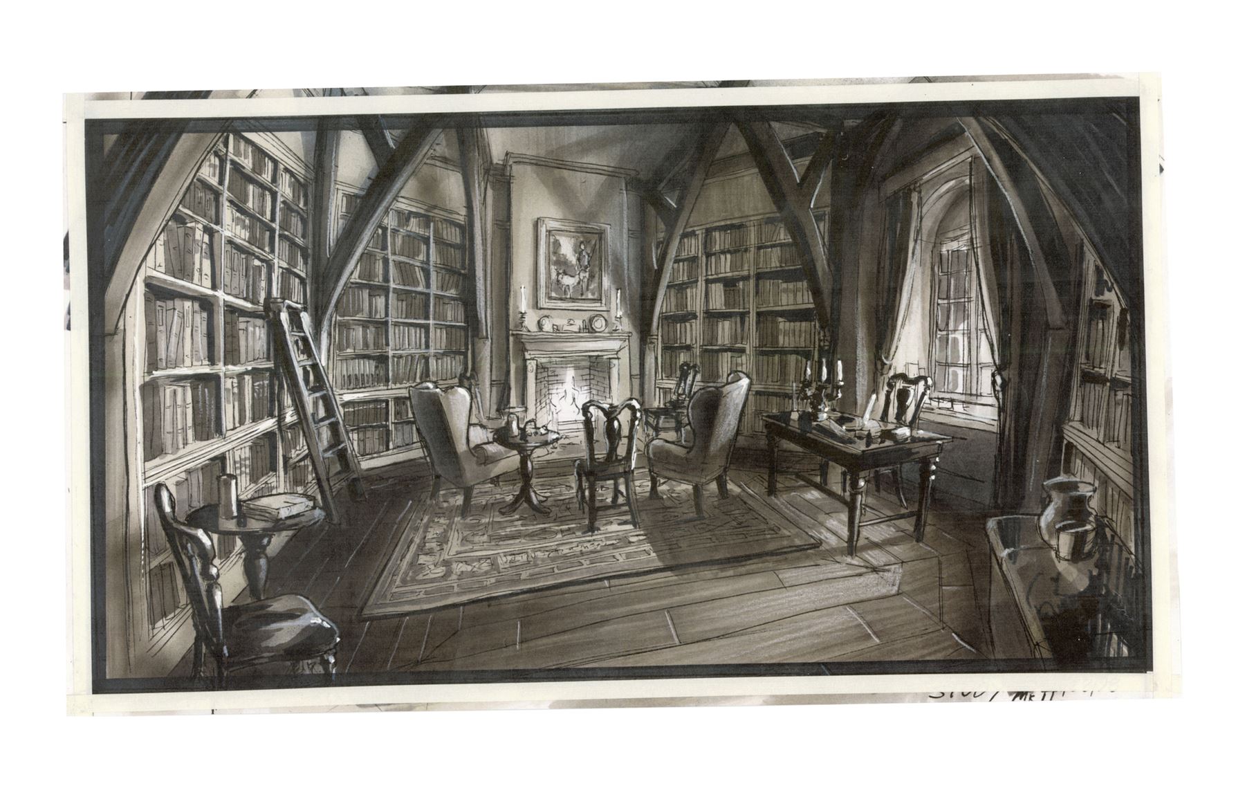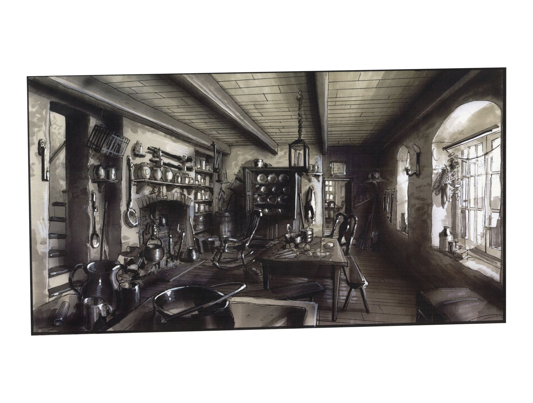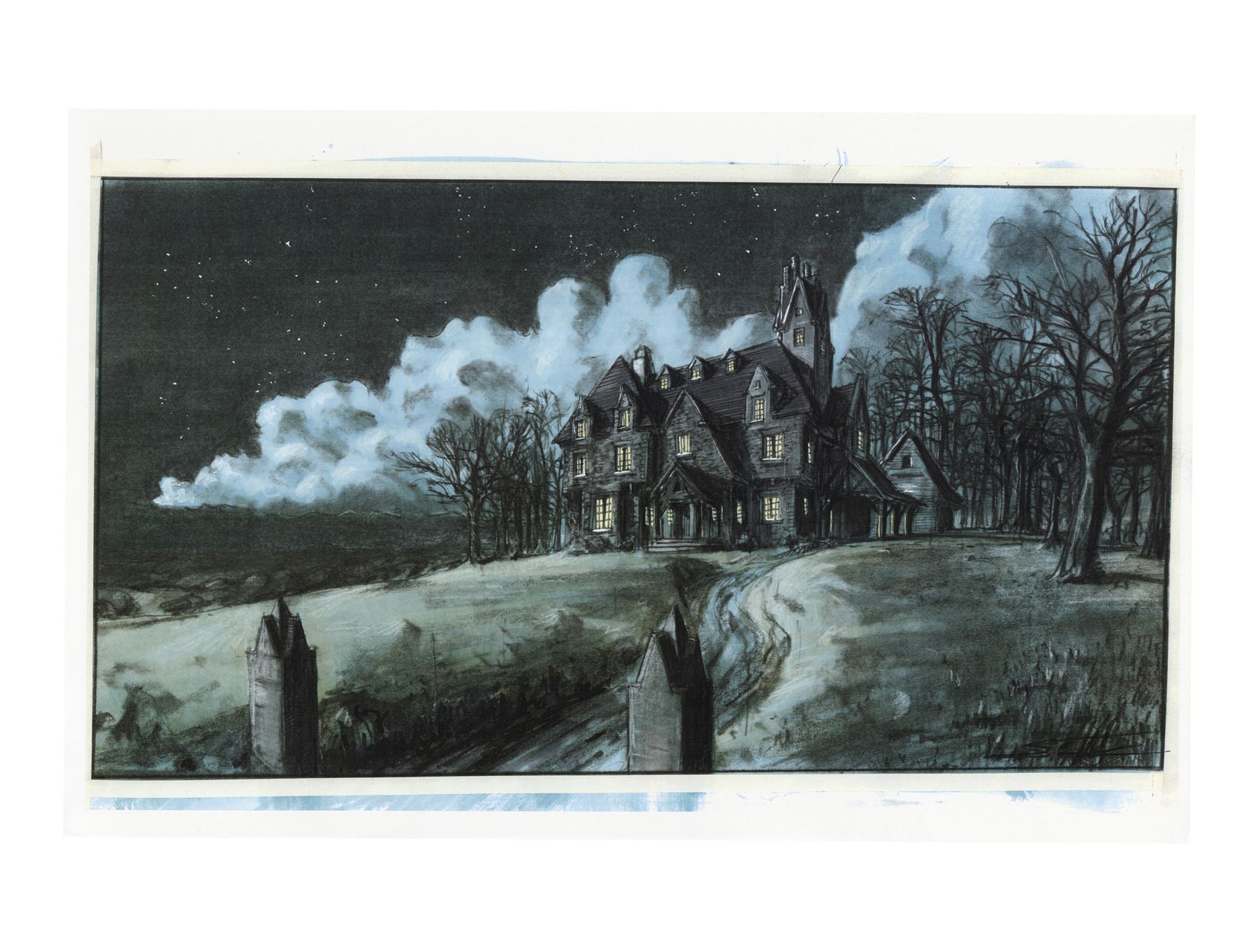 SLEEPY HOLLOW (1999) - Set Concept Artwork Prints - A set of concept artwork prints from Tim Burton's Sleepy Hollow. Created by concept illustrator Simon Murton, this lot consists of 44 concept artwork pieces with 16 images created as line drawings. These designs include Lady Van Tassel's attic, the Crone's cave interior and entrance, Baltus Van Tassel's study, and various village homes. Some of these designs feature Murton's printed signature. This lot exhibits minor discoloration. Dimensions: (each) 11" x 17" (28 cm x 43.25 cm)