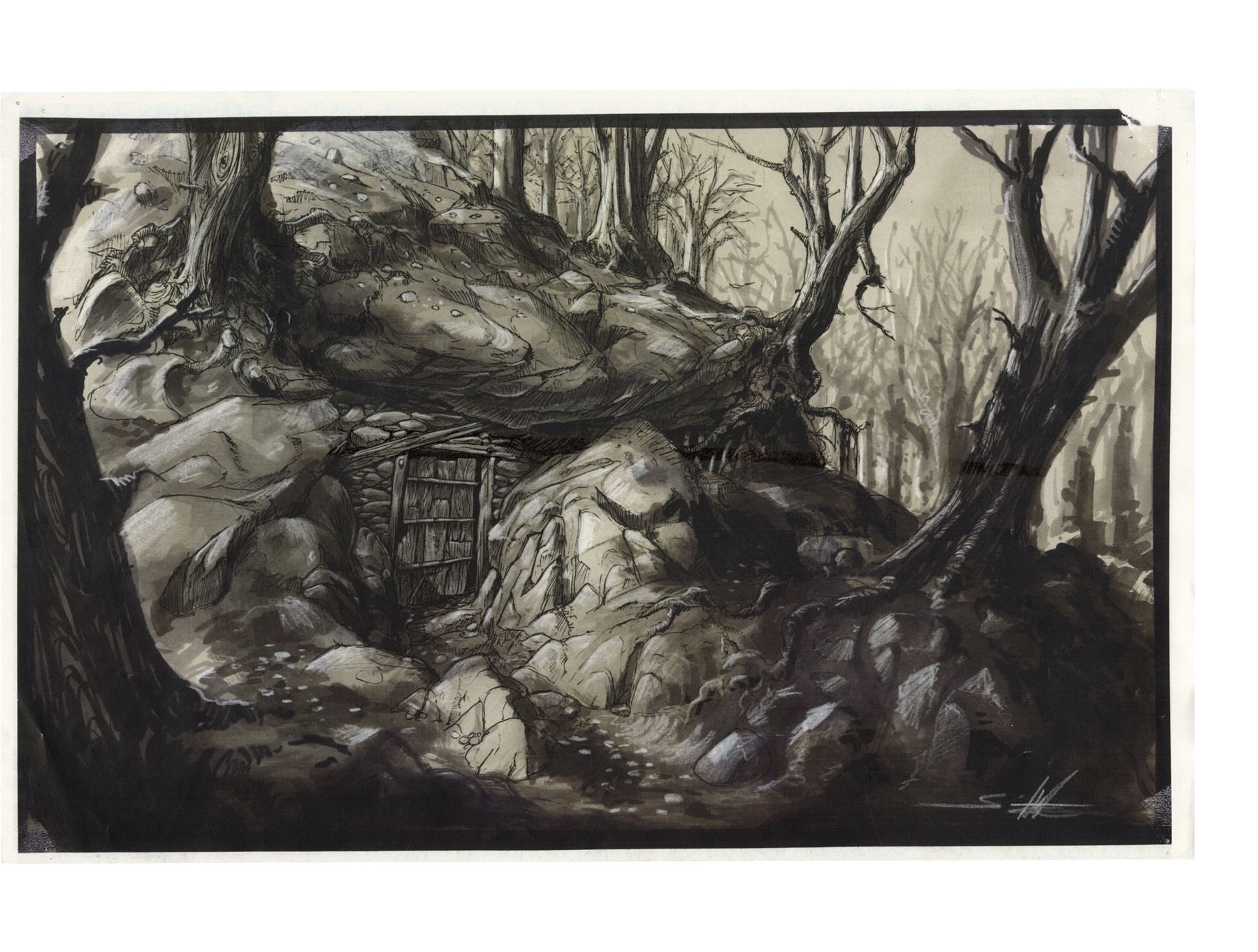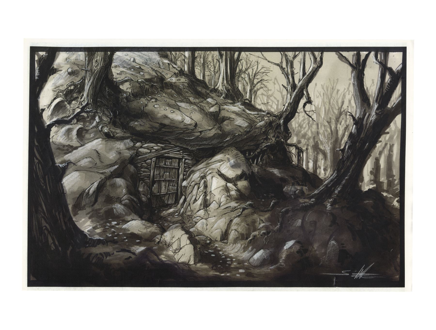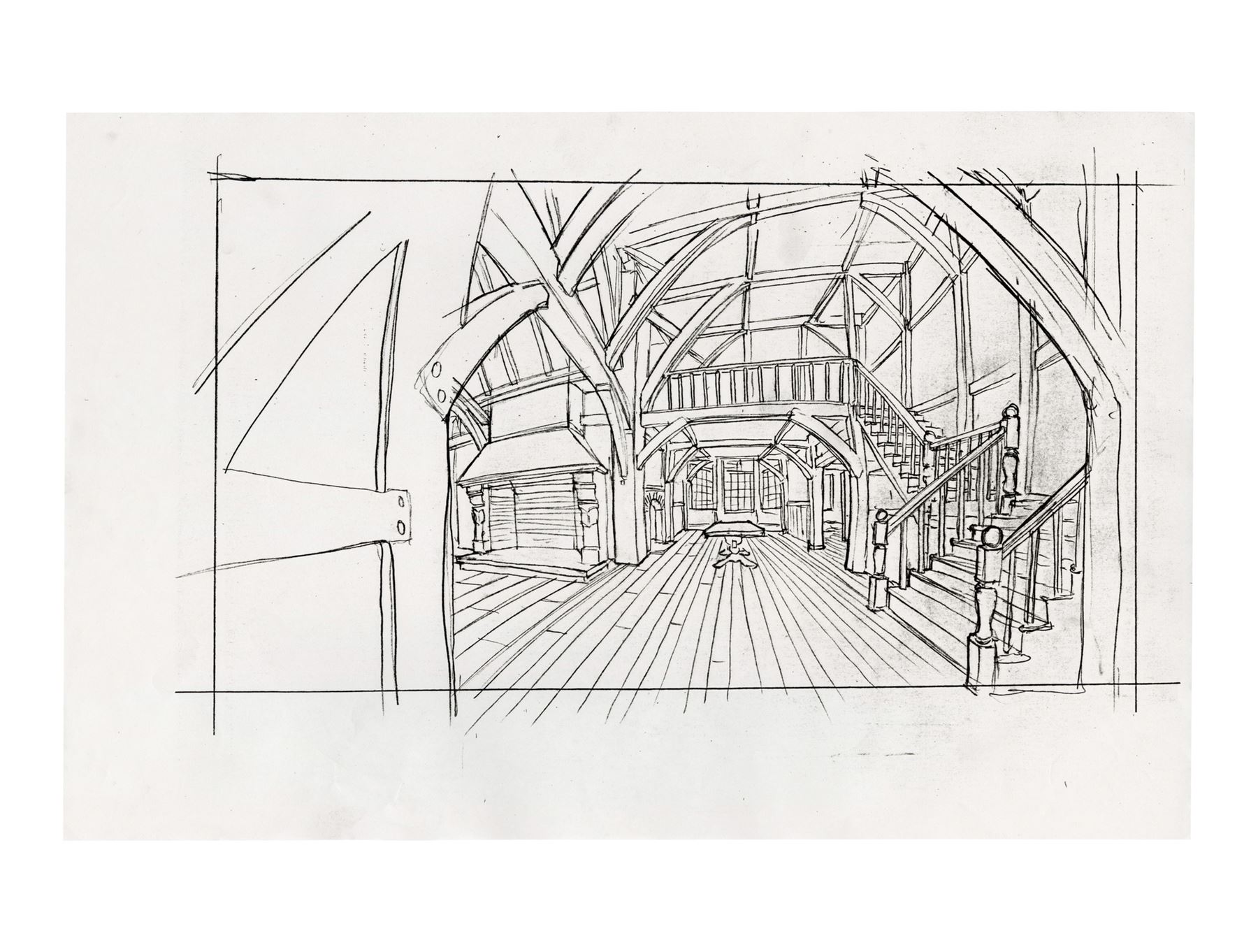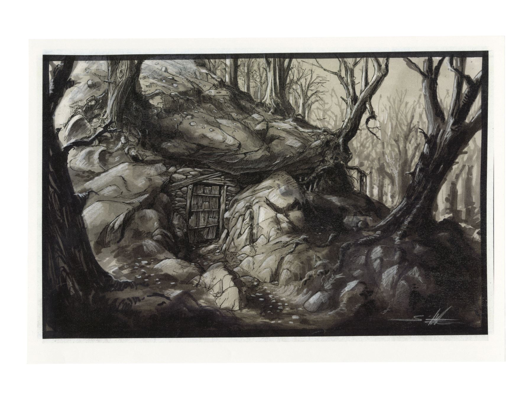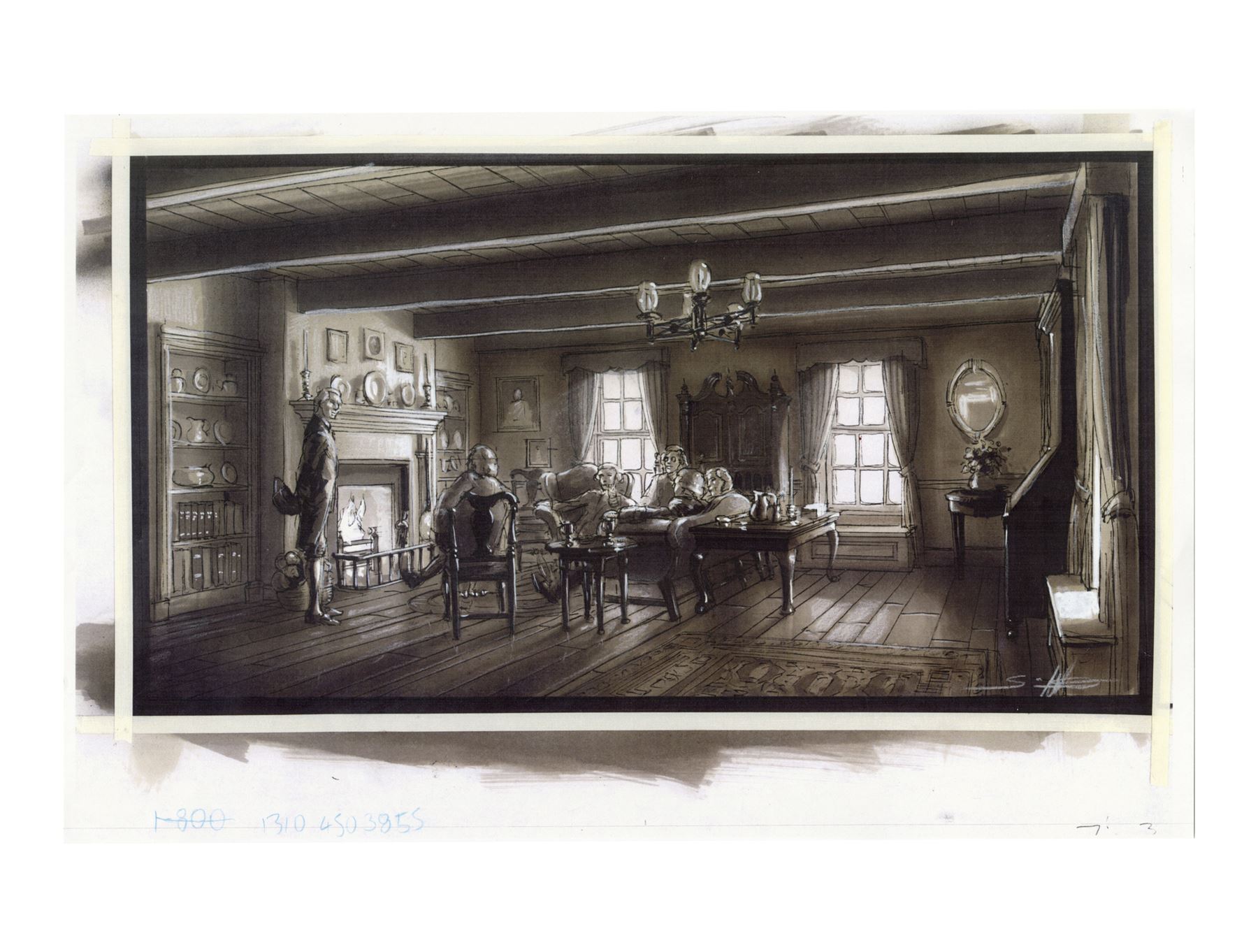 SLEEPY HOLLOW (1999) - Set Concept Artwork Prints - A set of concept artwork prints from Tim Burton's Sleepy Hollow. Created by concept illustrator Simon Murton, this lot consists of 44 concept artwork pieces with 16 images created as line drawings. These designs include Lady Van Tassel's attic, the Crone's cave interior and entrance, Baltus Van Tassel's study, and various village homes. Some of these designs feature Murton's printed signature. This lot exhibits minor discoloration. Dimensions: (each) 11" x 17" (28 cm x 43.25 cm)
