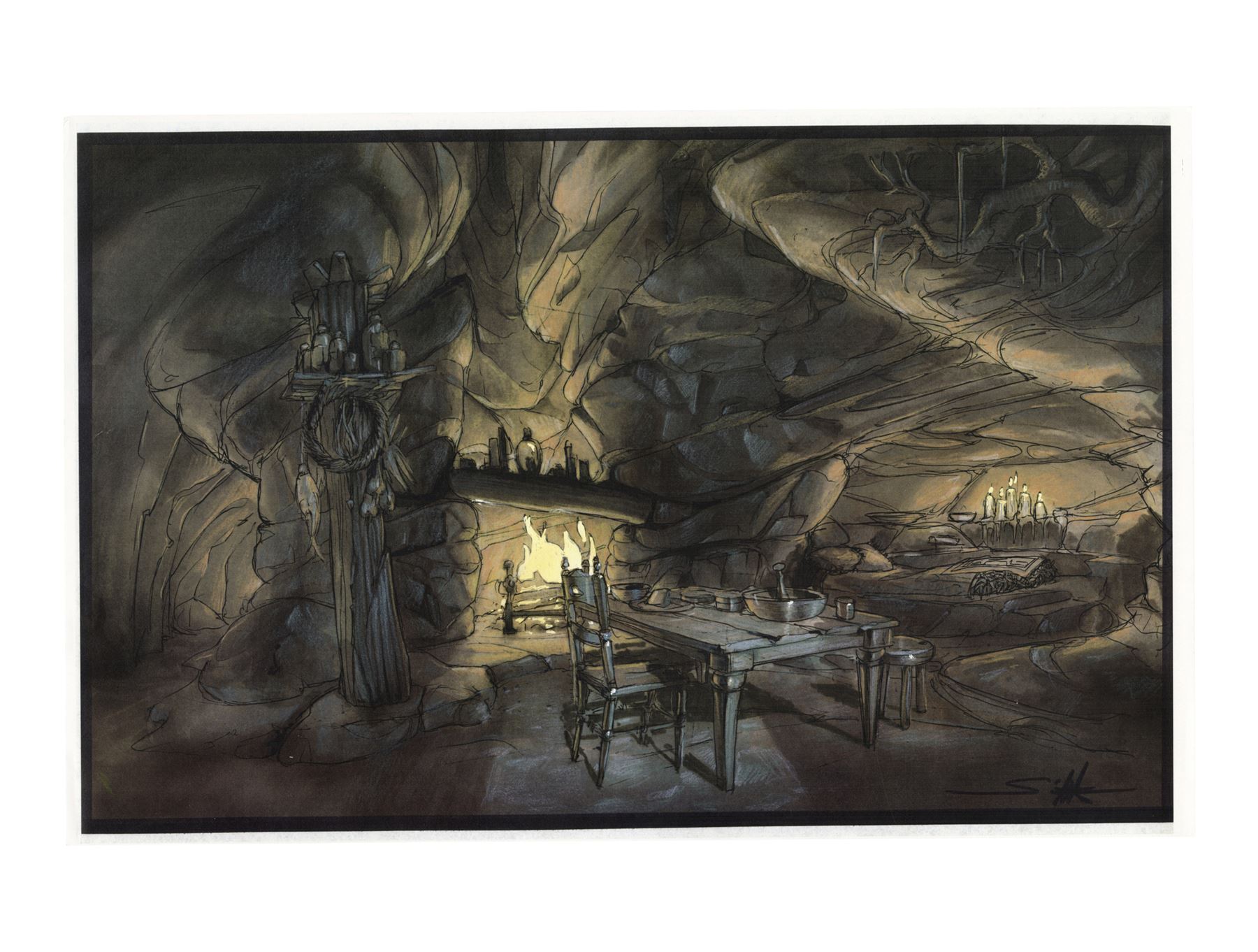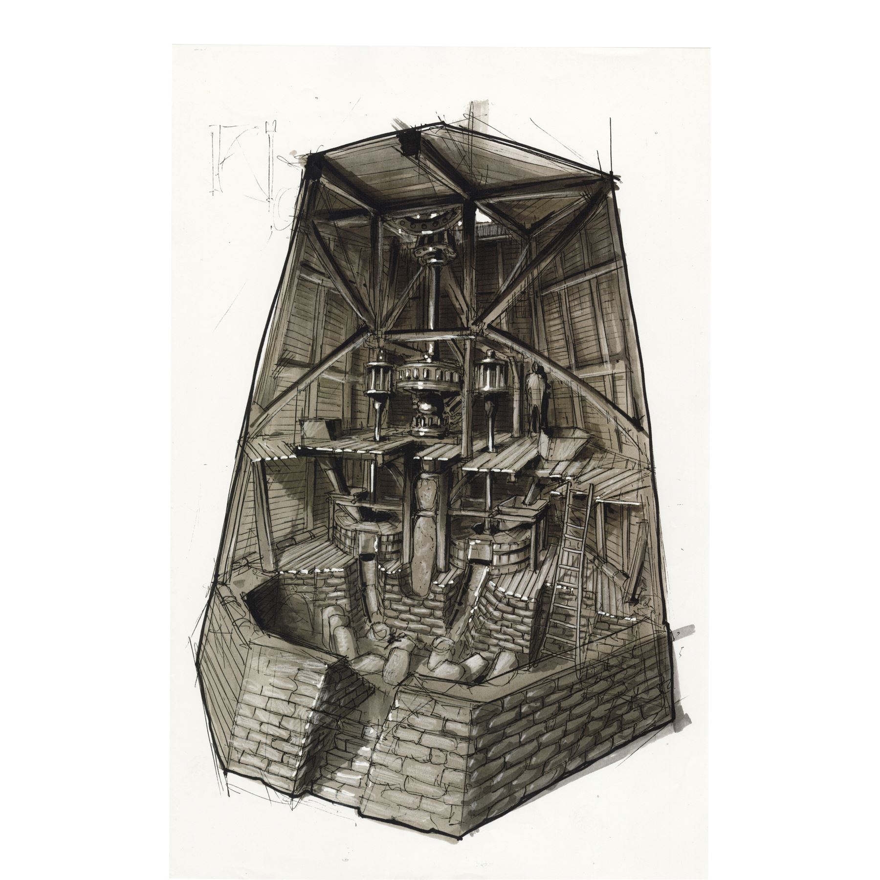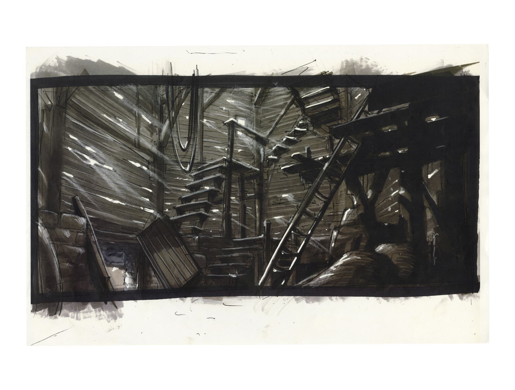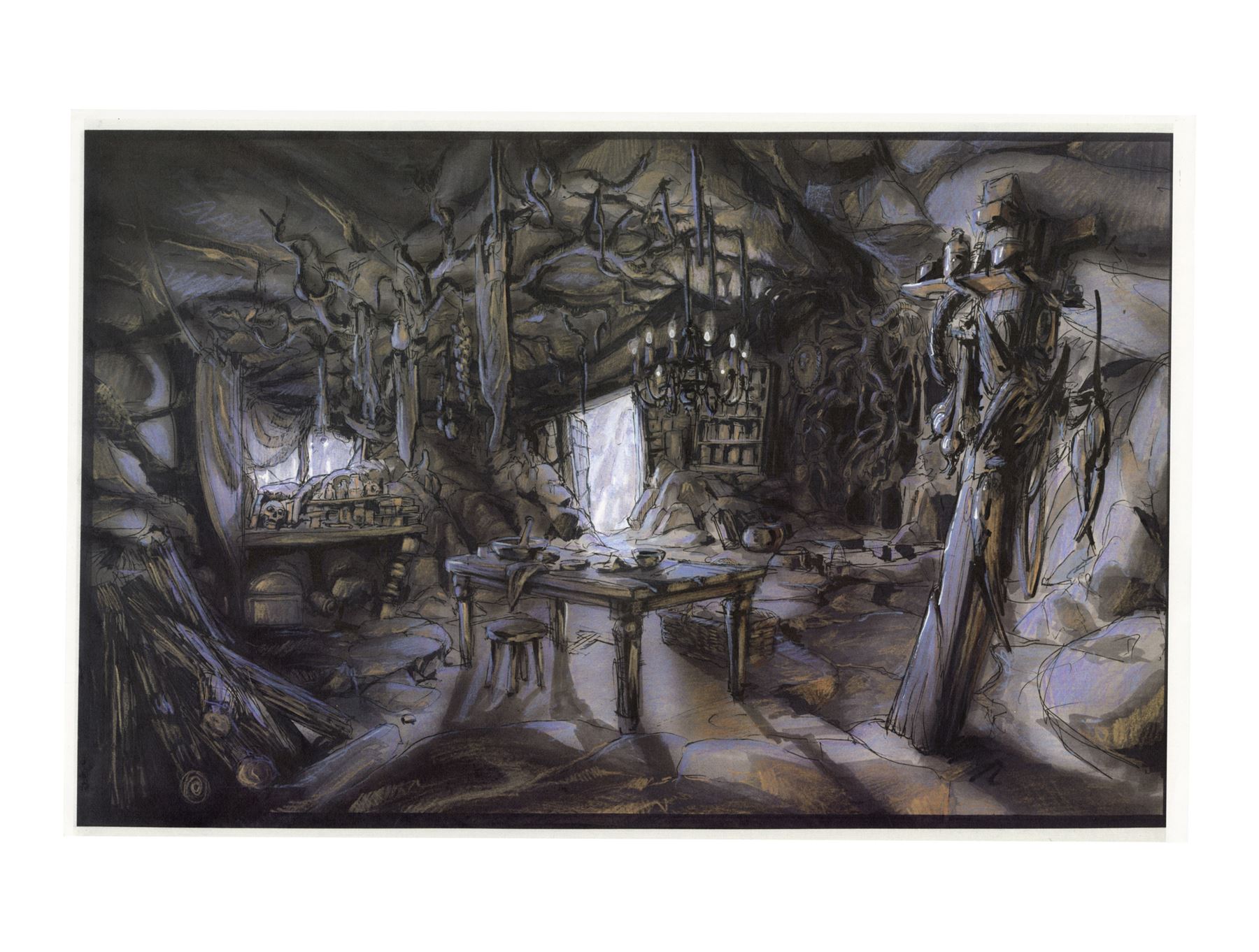 SLEEPY HOLLOW (1999) - Set Concept Artwork Prints - A set of concept artwork prints from Tim Burton's Sleepy Hollow. Created by concept illustrator Simon Murton, this lot consists of 44 concept artwork pieces with 16 images created as line drawings. These designs include Lady Van Tassel's attic, the Crone's cave interior and entrance, Baltus Van Tassel's study, and various village homes. Some of these designs feature Murton's printed signature. This lot exhibits minor discoloration. Dimensions: (each) 11" x 17" (28 cm x 43.25 cm)