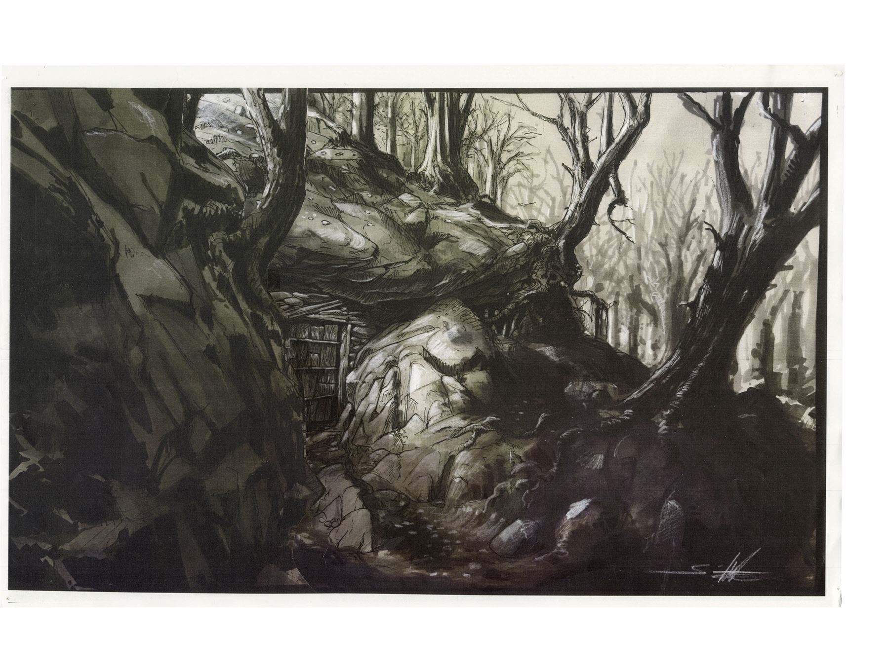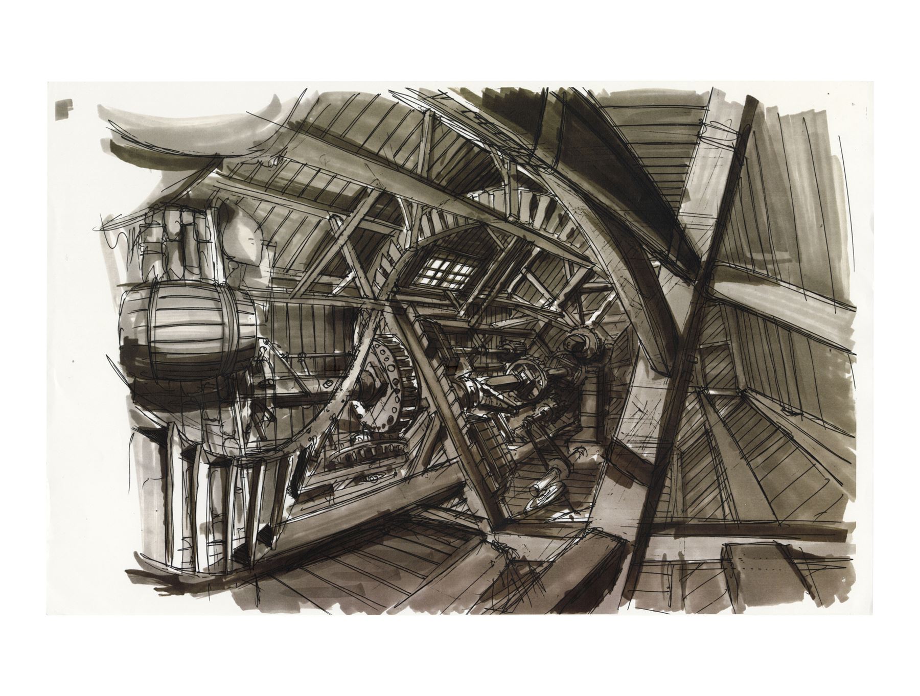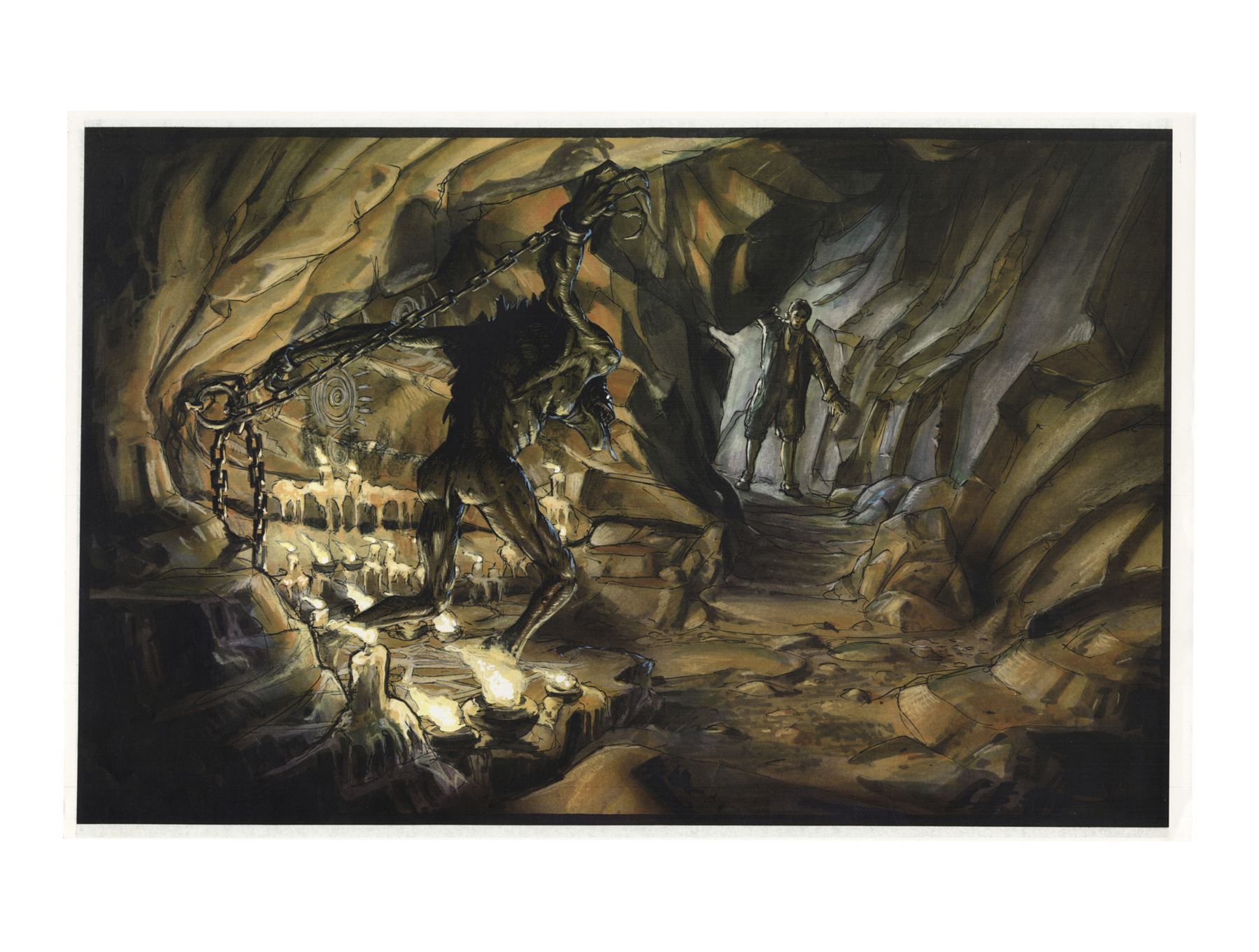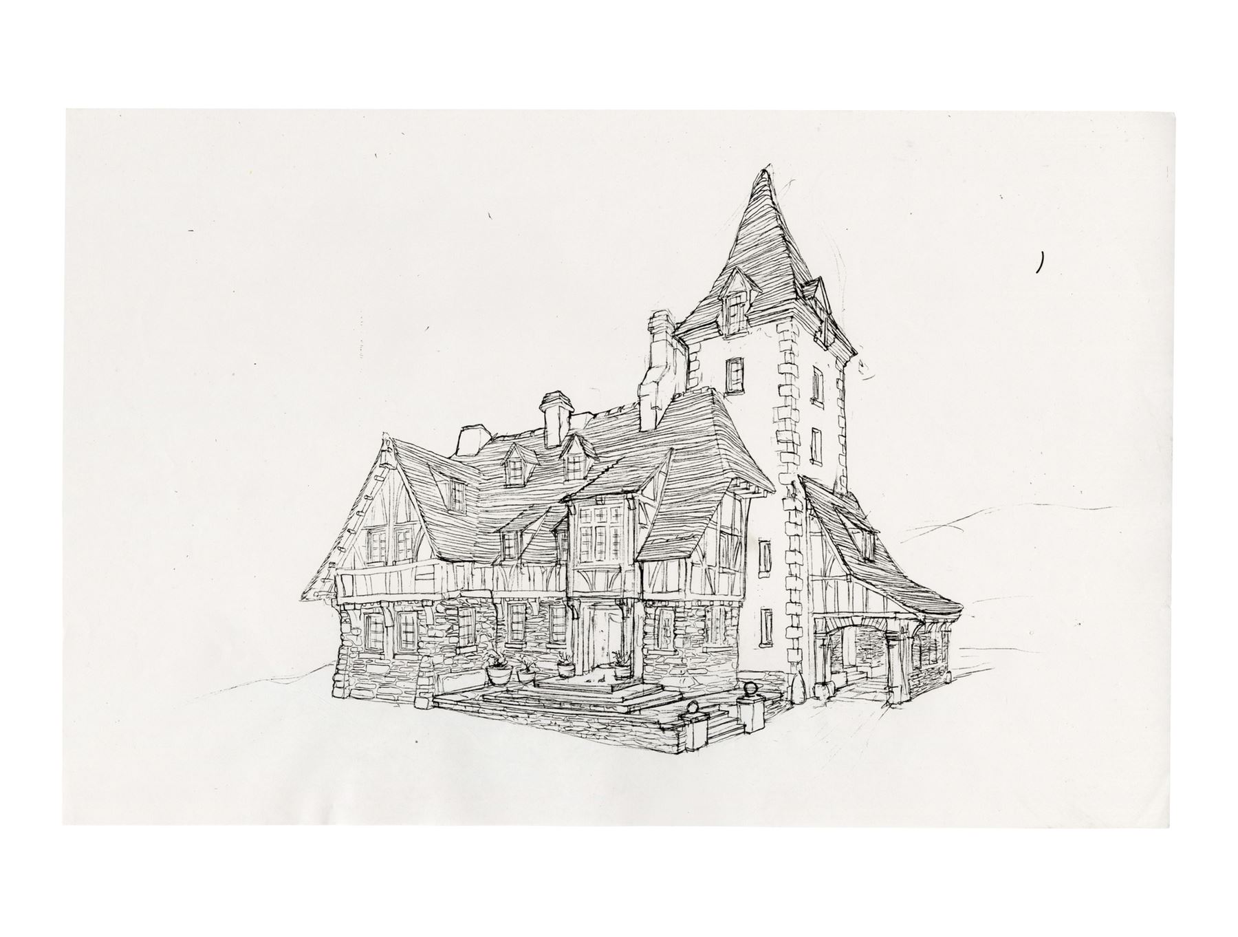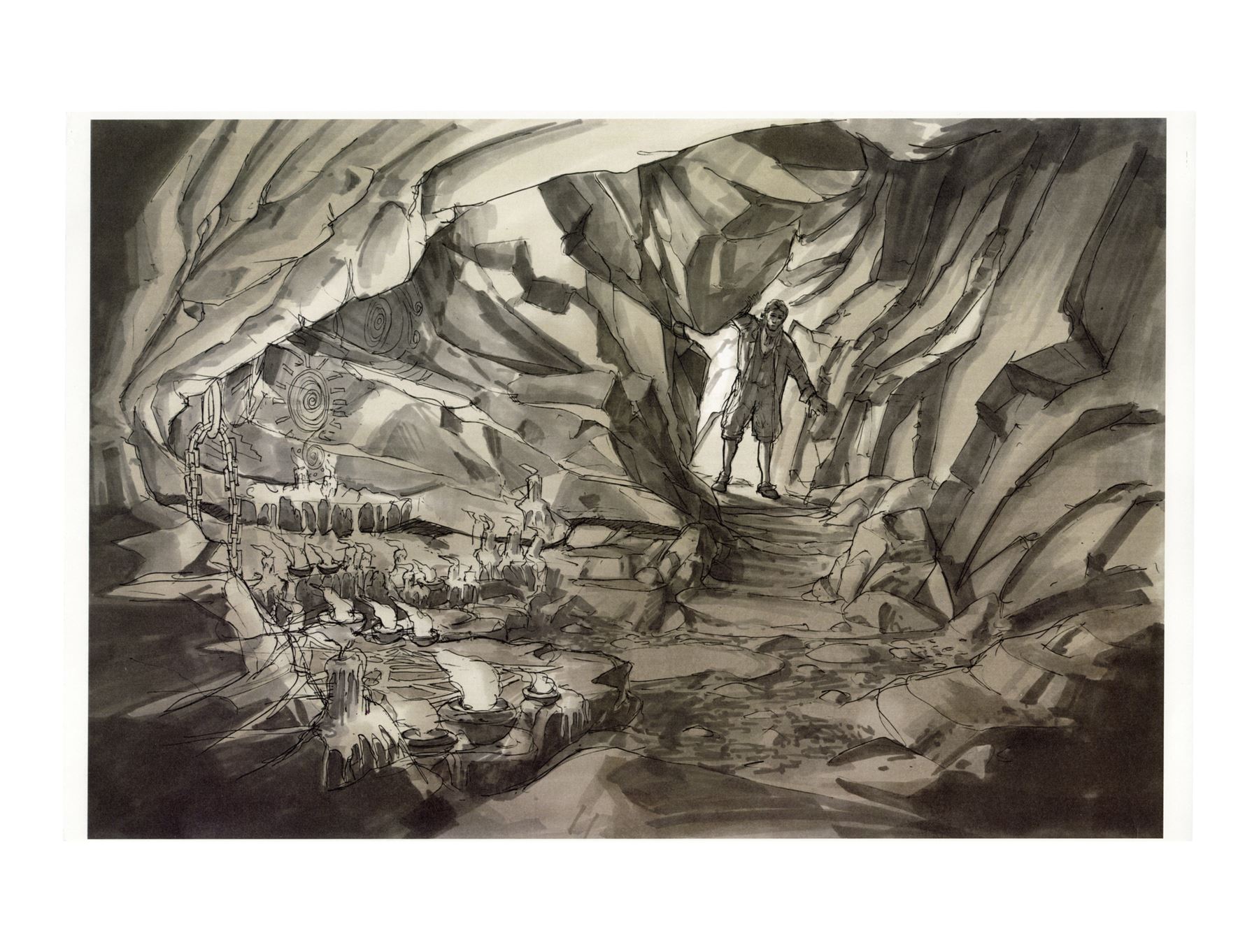 SLEEPY HOLLOW (1999) - Set Concept Artwork Prints - A set of concept artwork prints from Tim Burton's Sleepy Hollow. Created by concept illustrator Simon Murton, this lot consists of 44 concept artwork pieces with 16 images created as line drawings. These designs include Lady Van Tassel's attic, the Crone's cave interior and entrance, Baltus Van Tassel's study, and various village homes. Some of these designs feature Murton's printed signature. This lot exhibits minor discoloration. Dimensions: (each) 11" x 17" (28 cm x 43.25 cm)
