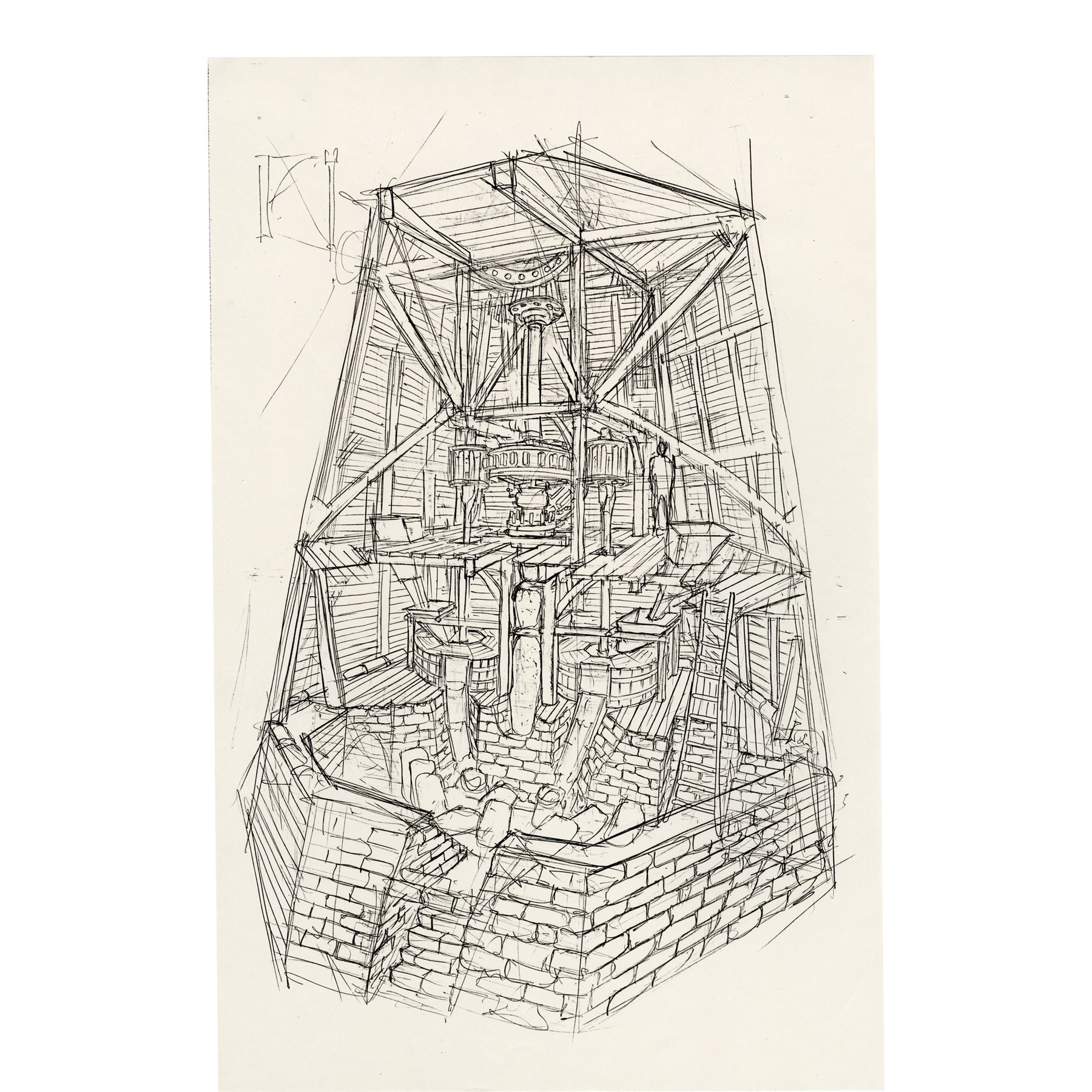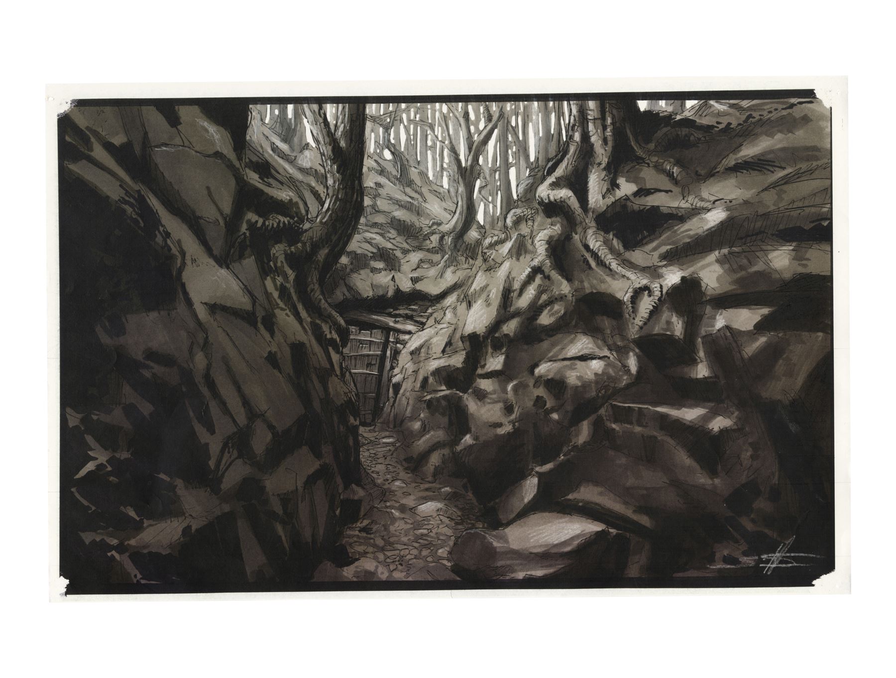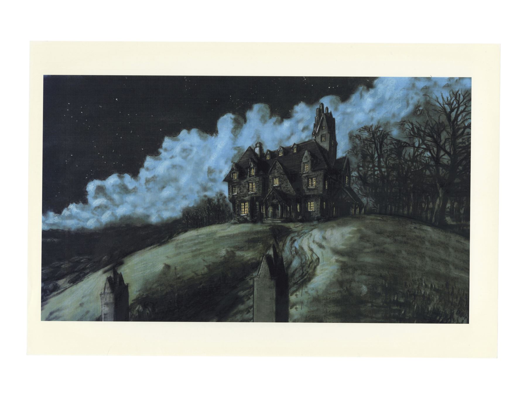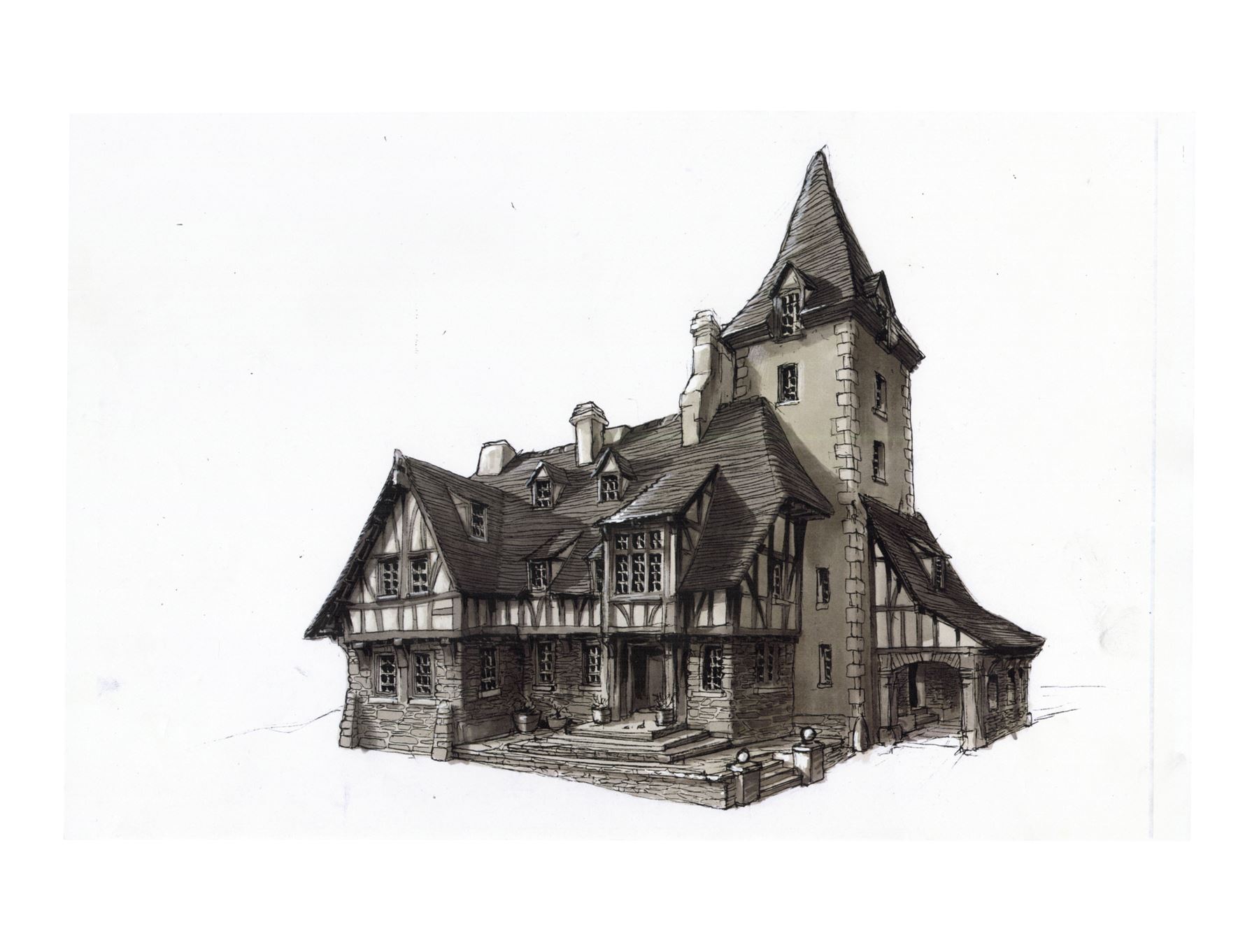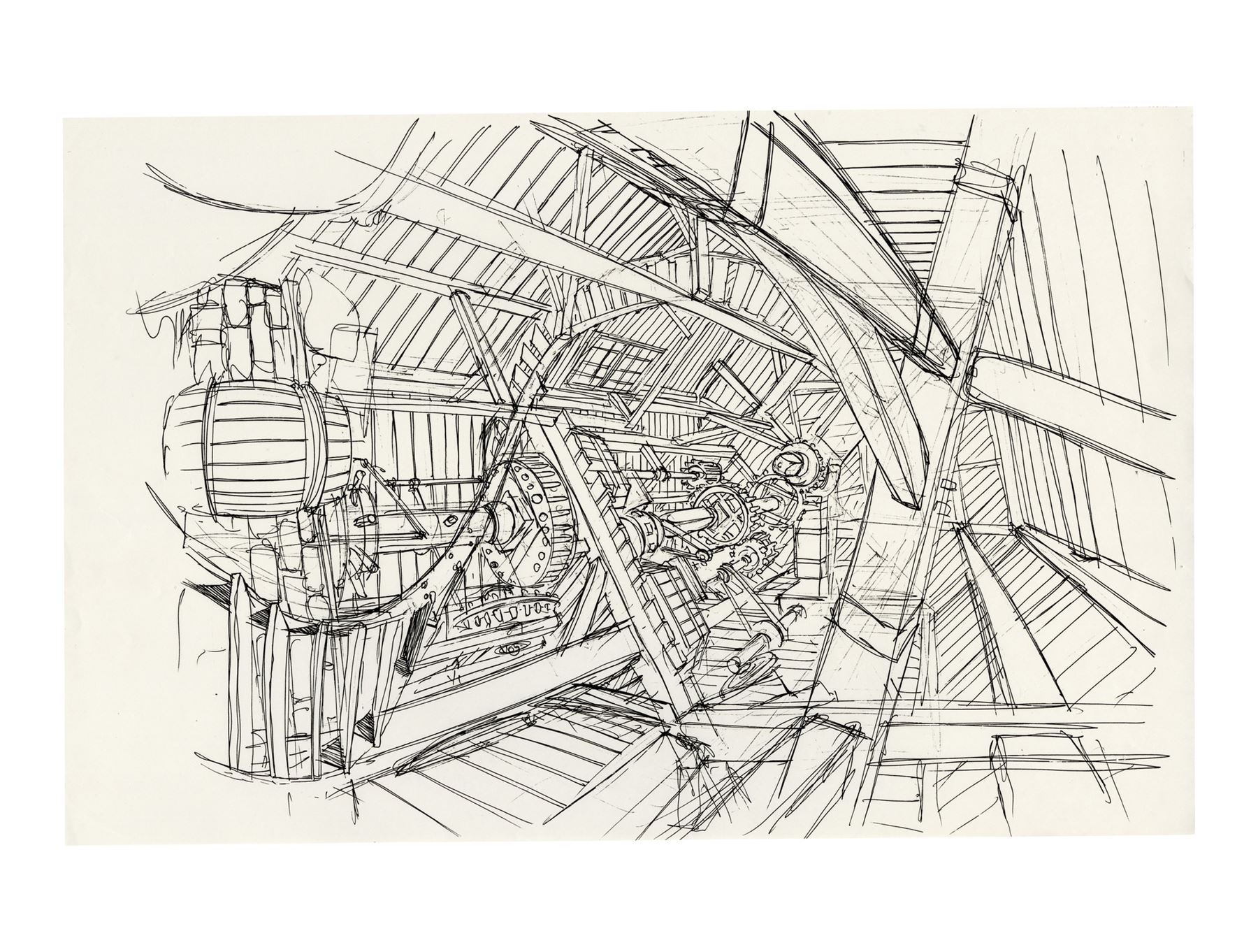 SLEEPY HOLLOW (1999) - Set Concept Artwork Prints - A set of concept artwork prints from Tim Burton's Sleepy Hollow. Created by concept illustrator Simon Murton, this lot consists of 44 concept artwork pieces with 16 images created as line drawings. These designs include Lady Van Tassel's attic, the Crone's cave interior and entrance, Baltus Van Tassel's study, and various village homes. Some of these designs feature Murton's printed signature. This lot exhibits minor discoloration. Dimensions: (each) 11" x 17" (28 cm x 43.25 cm)