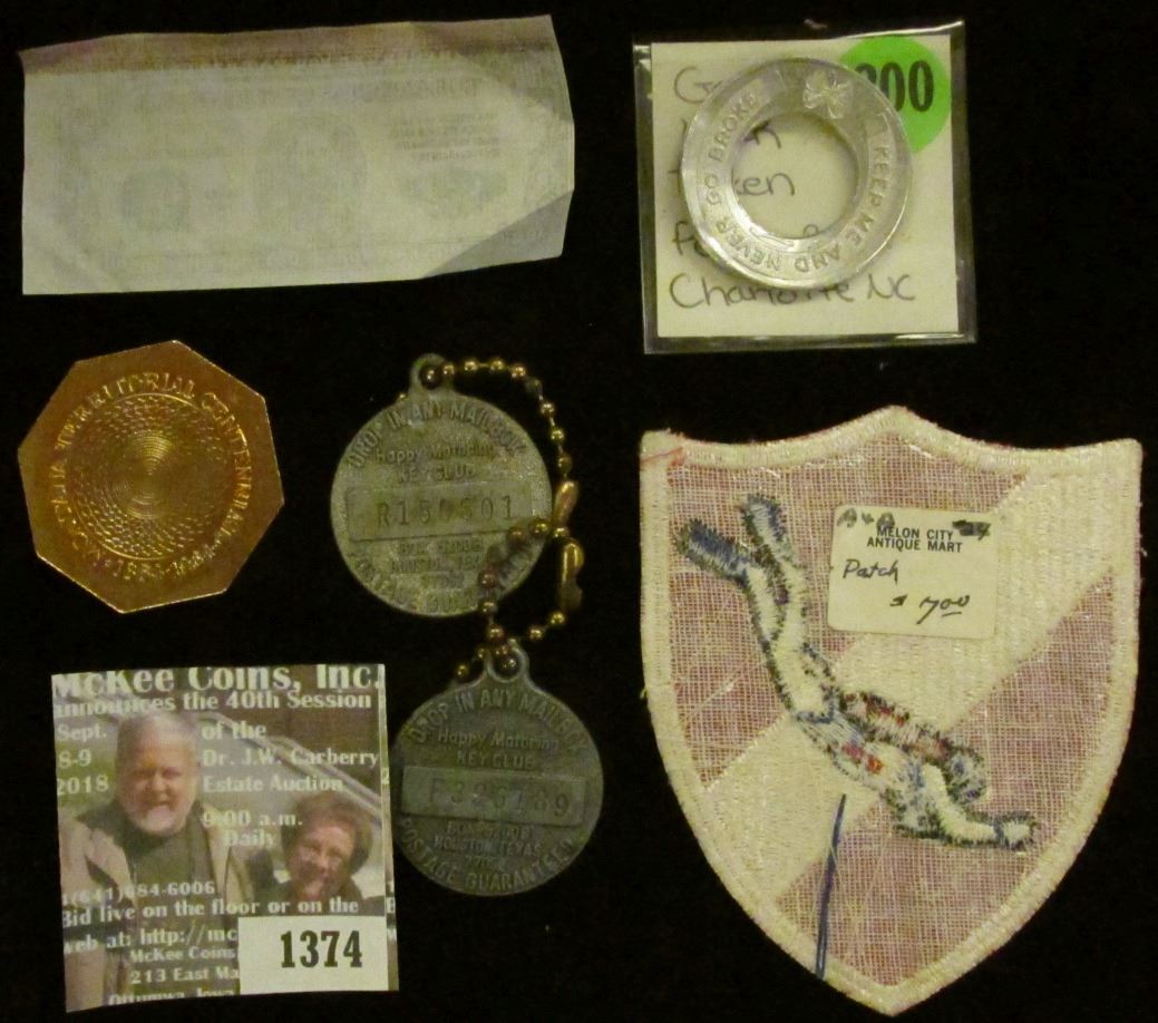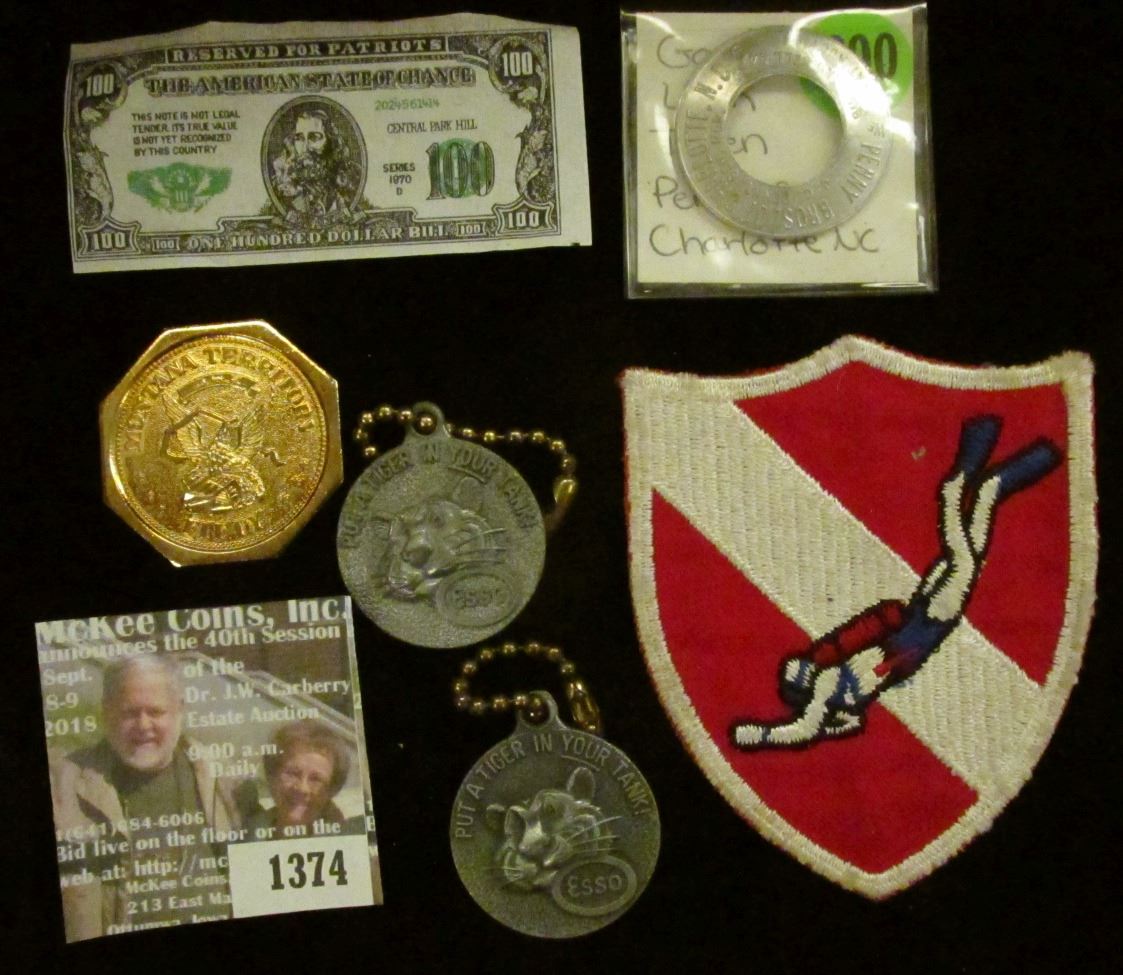 Scuba Diving embroidered cloth patch; Pair of Key Chains "Put A tiger In Your Tank ESSO"; advertising encasement for a Cent "Penny Bros. of Charlotte, N.C./J.C. Penny, Gen. Mgr., We Buy and Sell Land At Auction"; novelty $100 bill; & 1864 1964 MontanaTerritorial Centennial" medal designed like a Fifty Dollar Gold Slug.