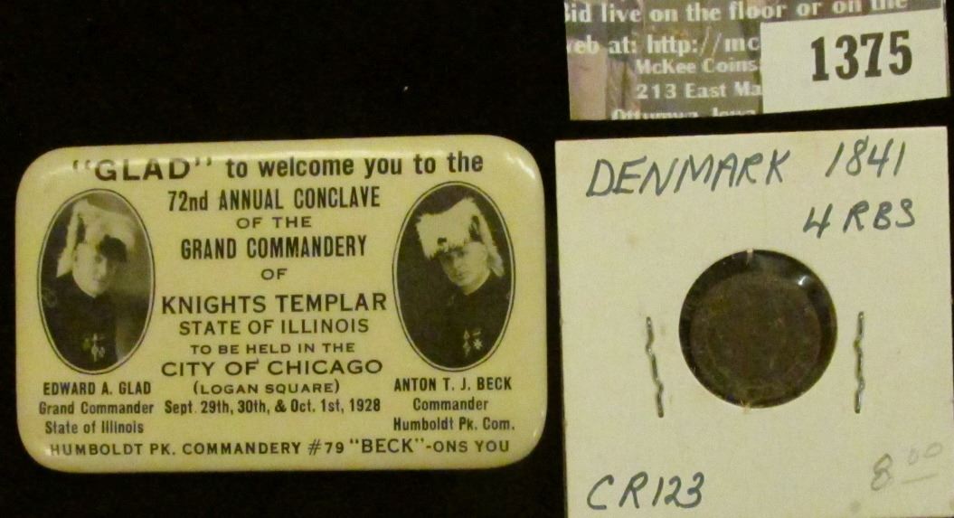 Advertising Mirror ""Glad" to welcome you to the 72nd Annual Conclave of the Grand Commandery of Knights Templar State of Illinois To Be Held in the City of Chicago…"; & 1841 Denmark 4 RBS, CR123.
