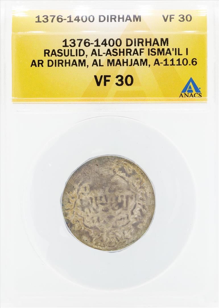 One 1376-1400 Dirham Rasulid Al Ashraf Isma IL I AL Mahjam Coin ANACS VF30. ANACS Certified.
