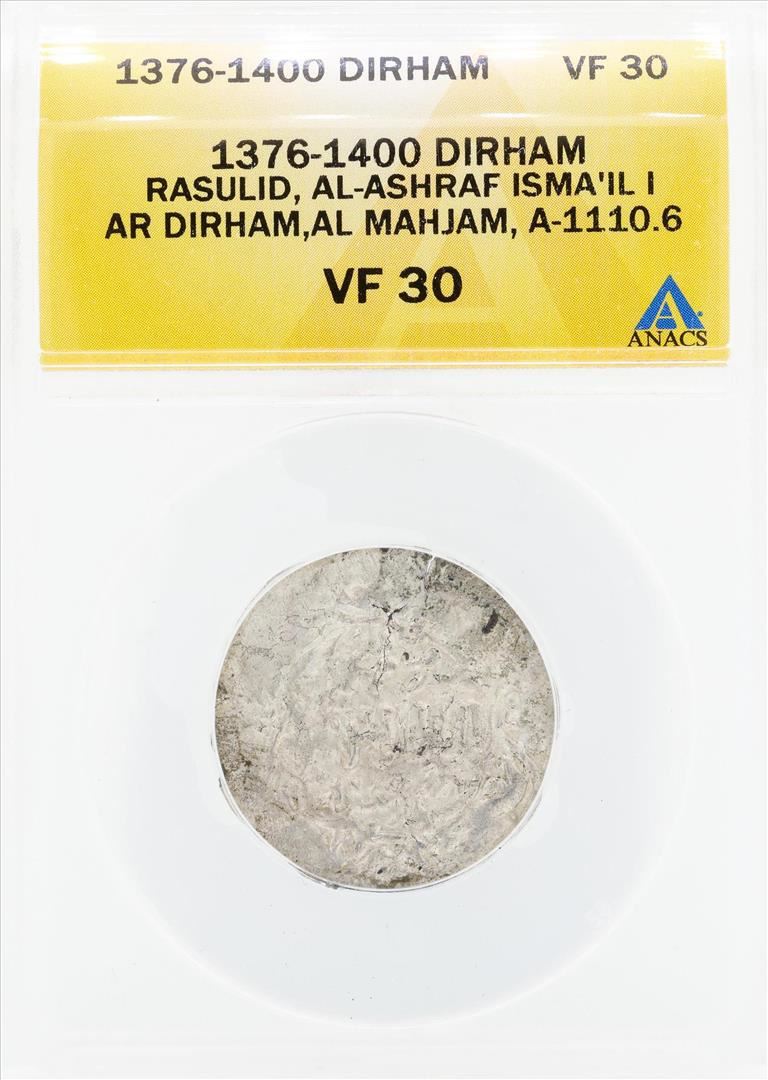 One 1376-1400 Dirham Rasulid Al Ashraf Isma IL I AL Mahjam Coin ANACS VF30. ANACS Appraised.