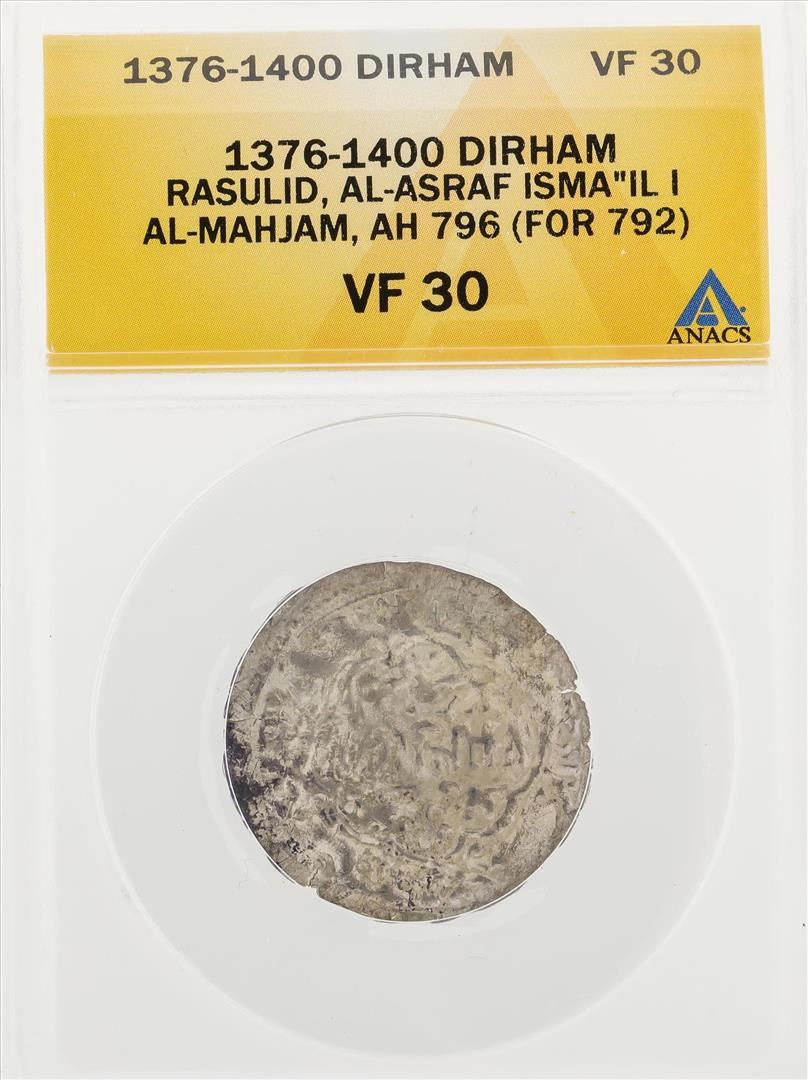 One 1376-1400 Dirham Rasulid Al-Ashraf Isma IL I Al Mahjam AH 796 For 792 Coin ANACS VF30. ANACS Appraised.